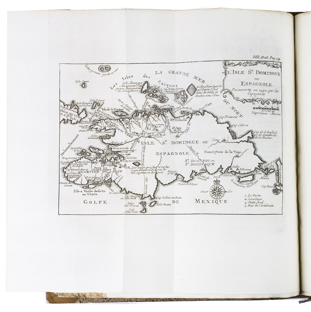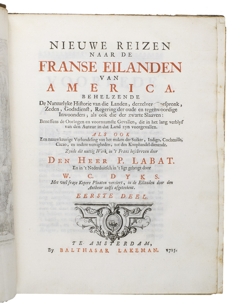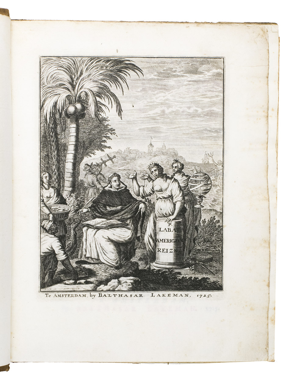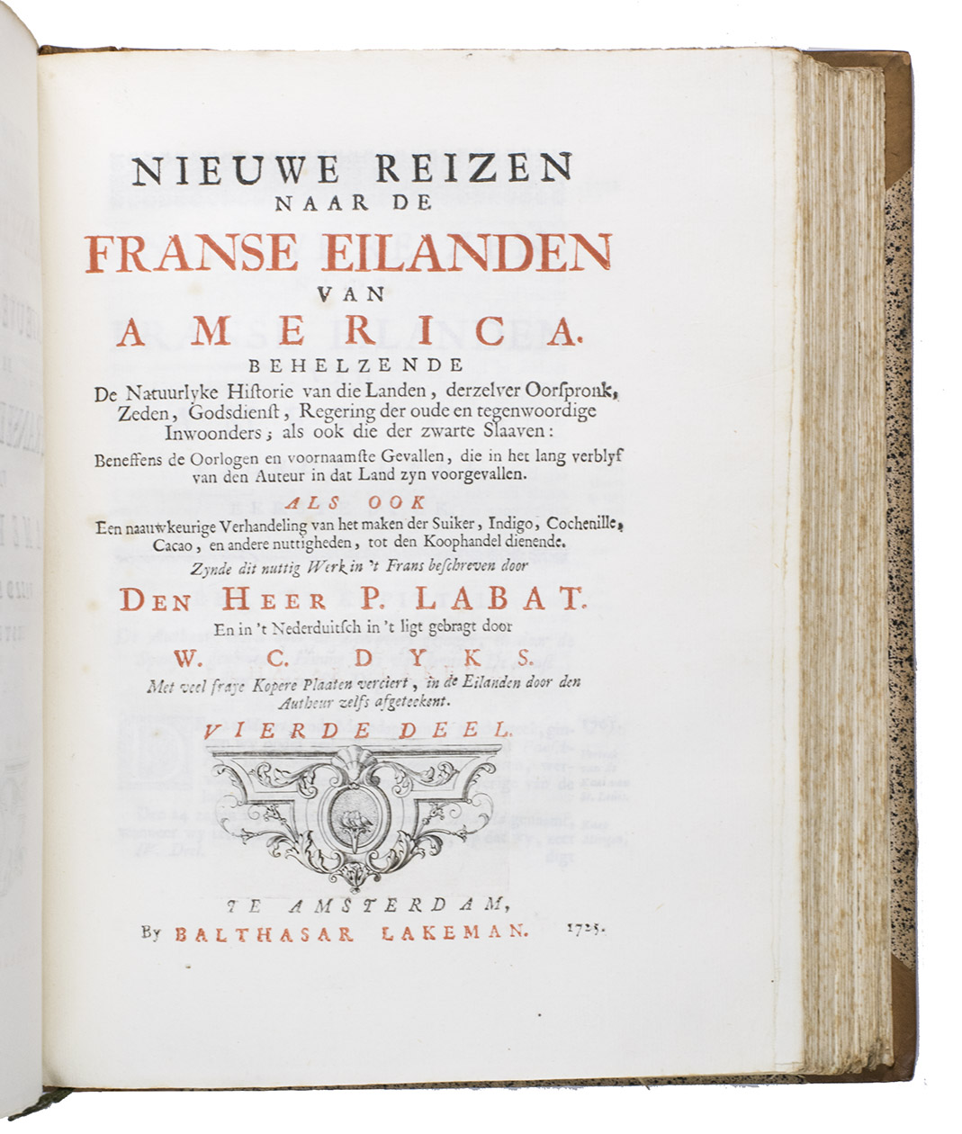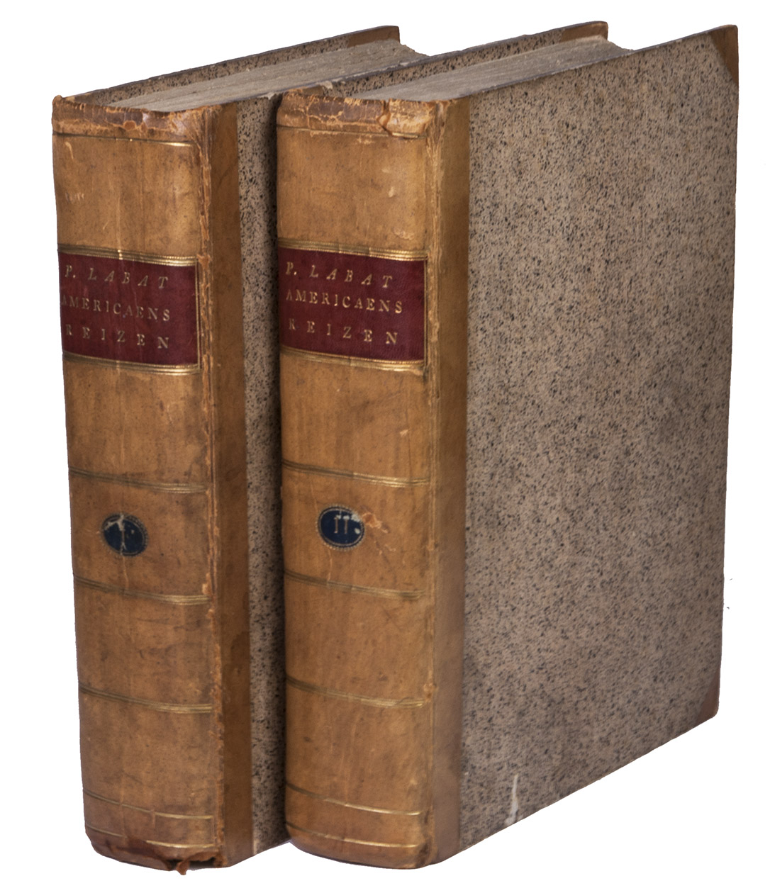 First Dutch edition of Labat's detailed journal recording his travels in the Caribbean. The work is replete with historical observations and contains important sociological, geographical, zoological, anthropological and gastronomic remarks, including an elaborate treatise on the cultivation of cocoa and the fabrication of chocolate. The maps depict North and part of South America with the Caribbean, the islands of Martinique, Barbados, Santa Domingo, etc.