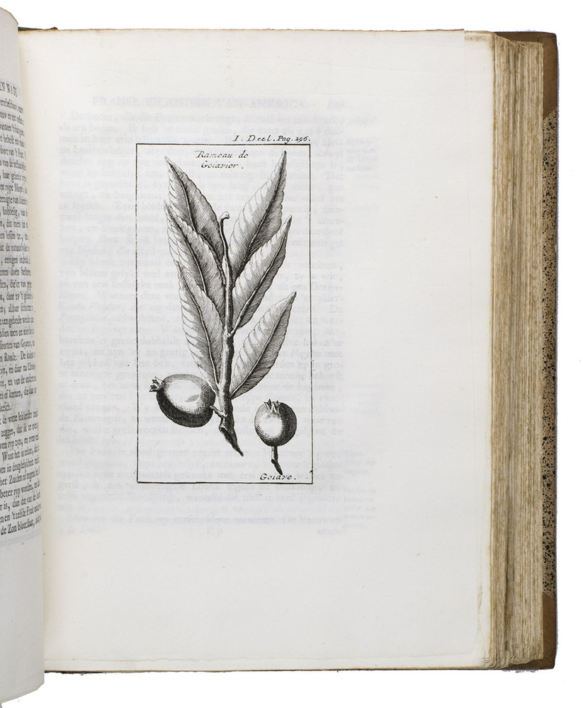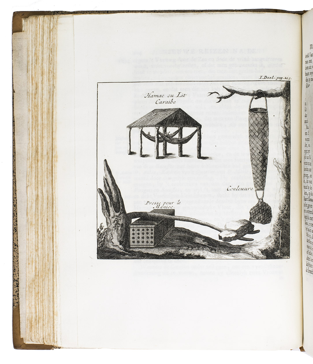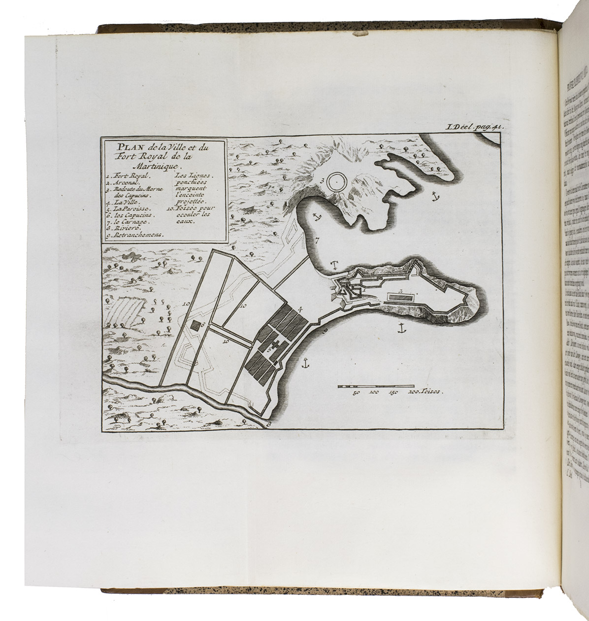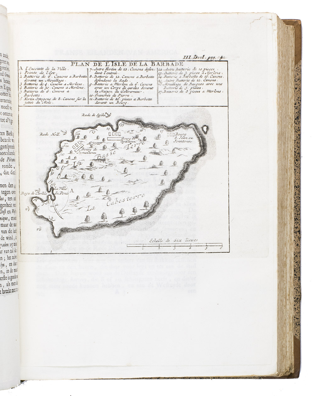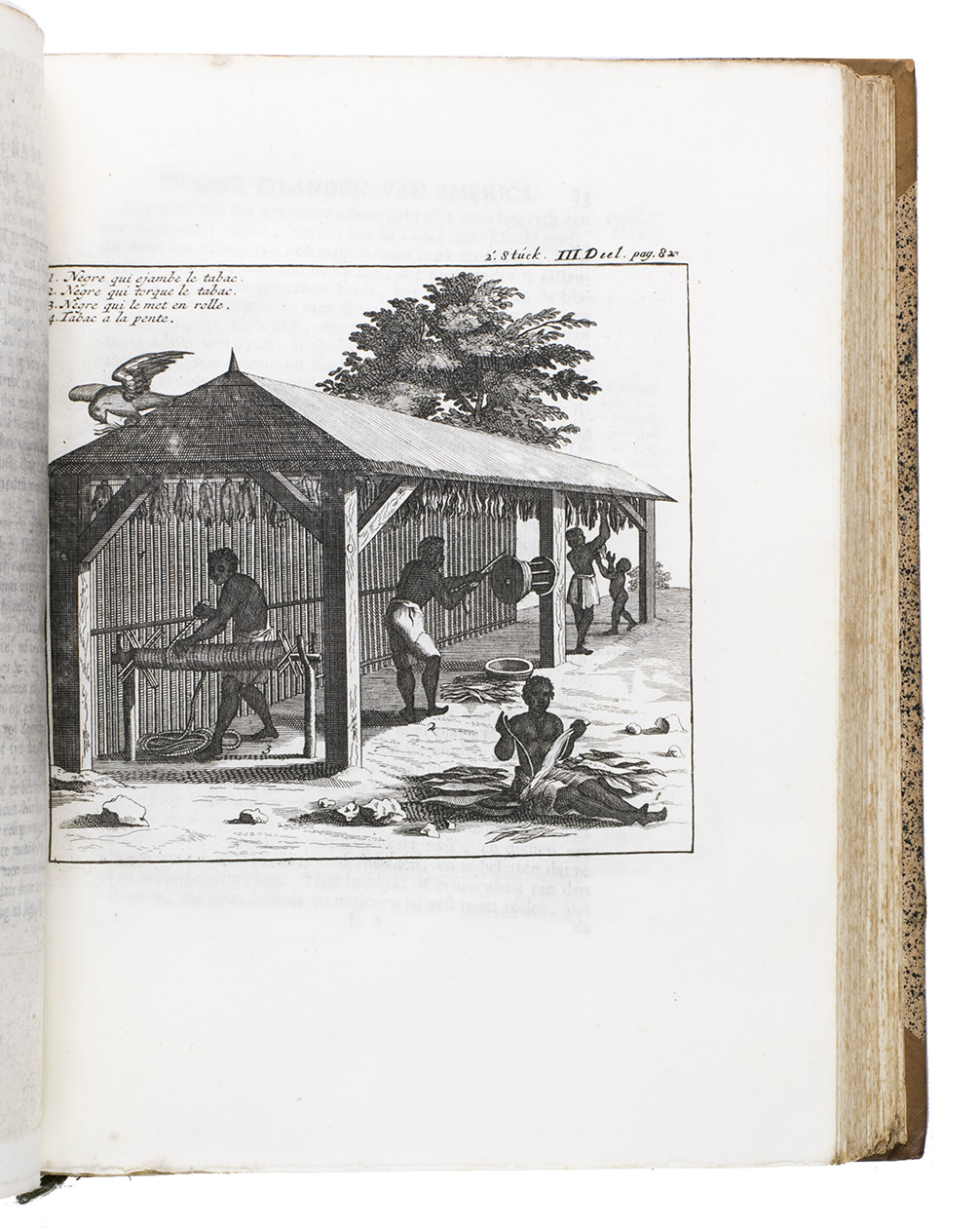 First Dutch edition of Labat's detailed journal recording his travels in the Caribbean. The work is replete with historical observations and contains important sociological, geographical, zoological, anthropological and gastronomic remarks, including an elaborate treatise on the cultivation of cocoa and the fabrication of chocolate. The maps depict North and part of South America with the Caribbean, the islands of Martinique, Barbados, Santa Domingo, etc.