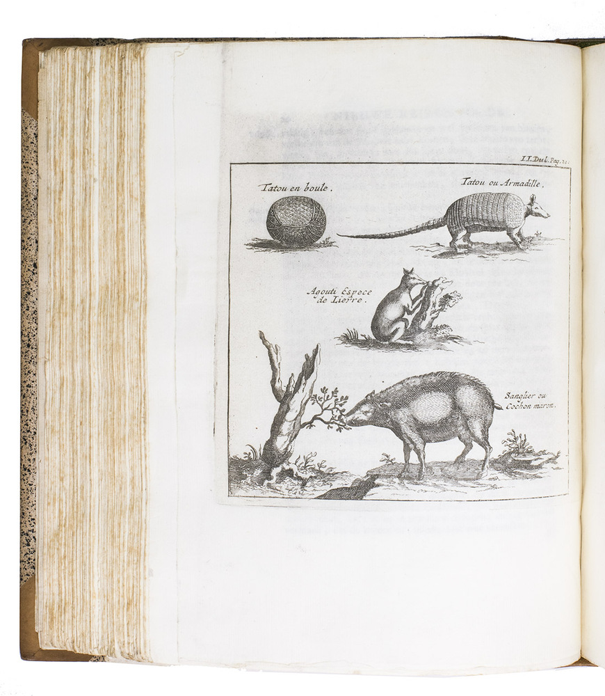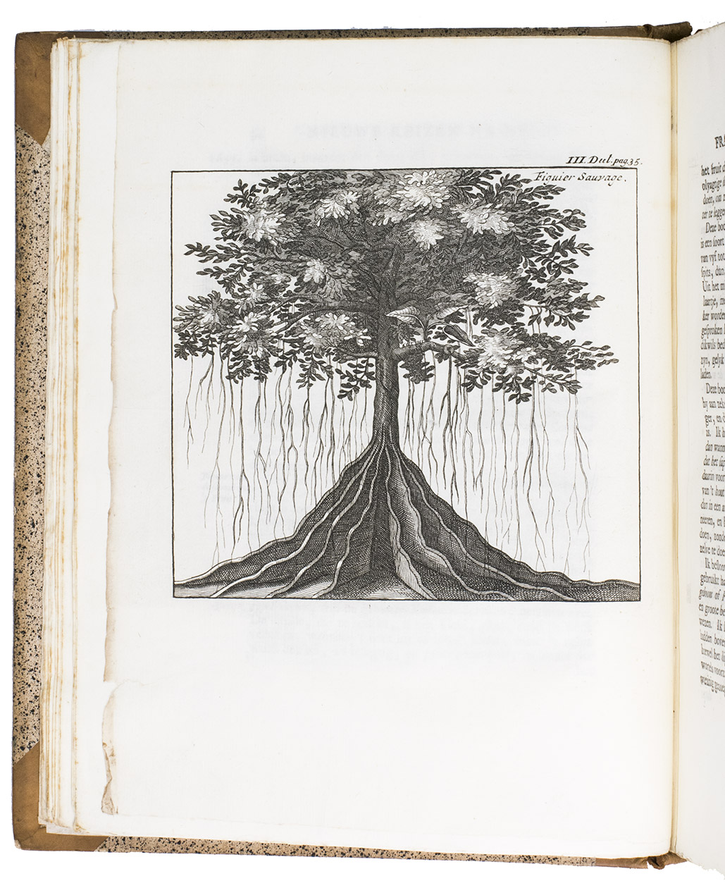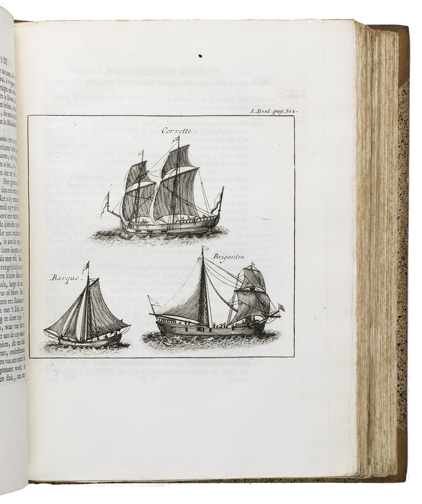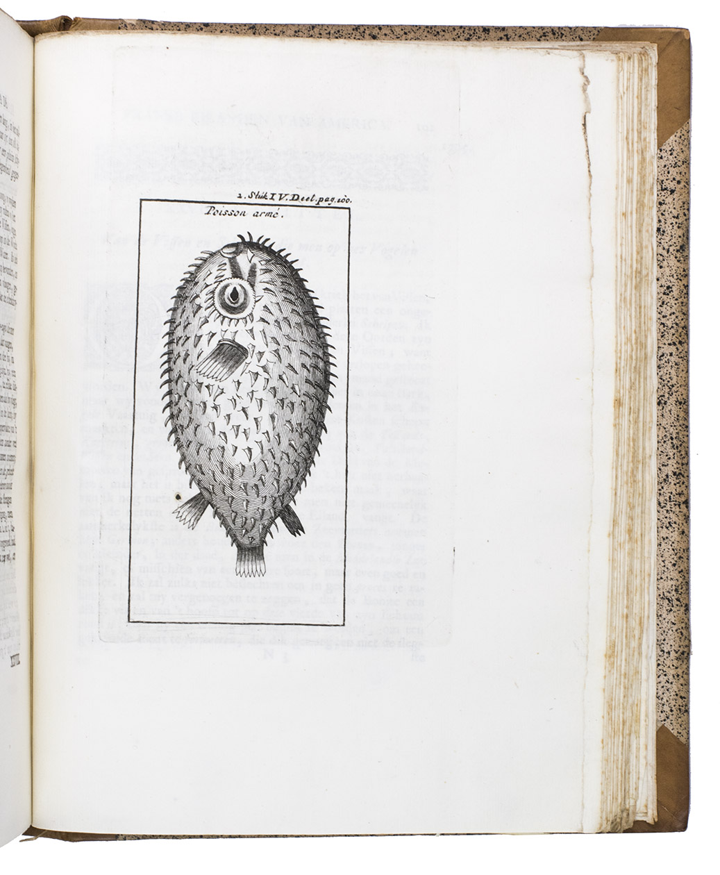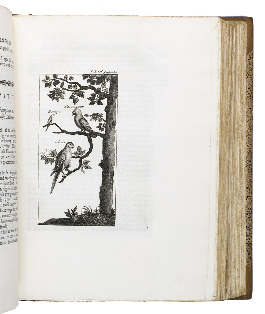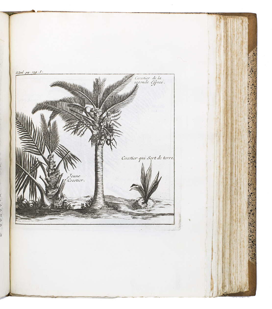 First Dutch edition of Labat's detailed journal recording his travels in the Caribbean. The work is replete with historical observations and contains important sociological, geographical, zoological, anthropological and gastronomic remarks, including an elaborate treatise on the cultivation of cocoa and the fabrication of chocolate. The maps depict North and part of South America with the Caribbean, the islands of Martinique, Barbados, Santa Domingo, etc.
