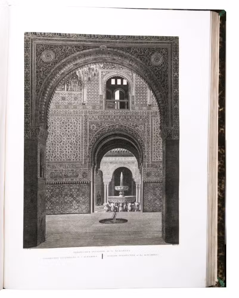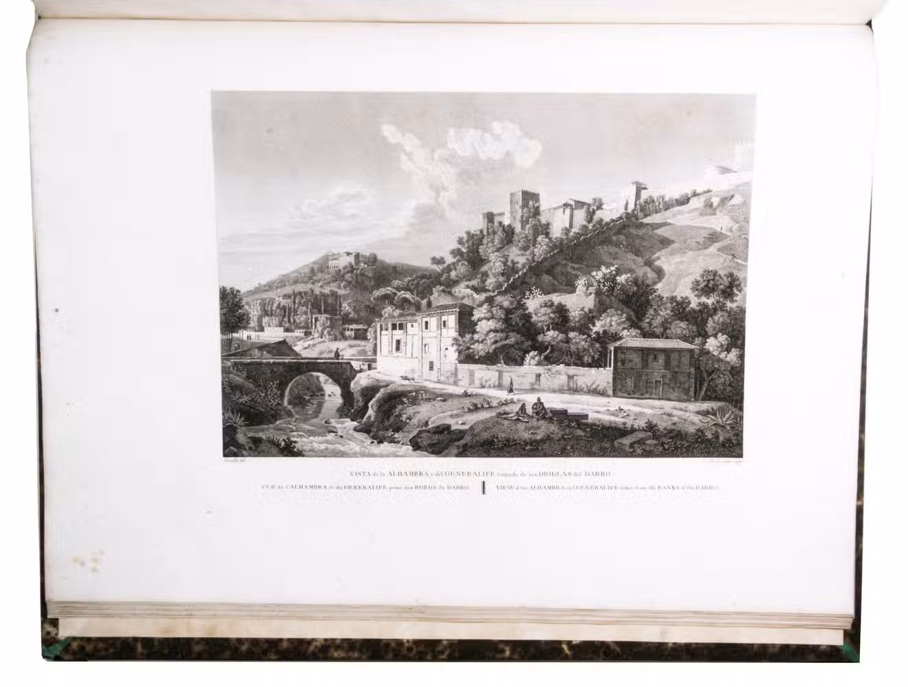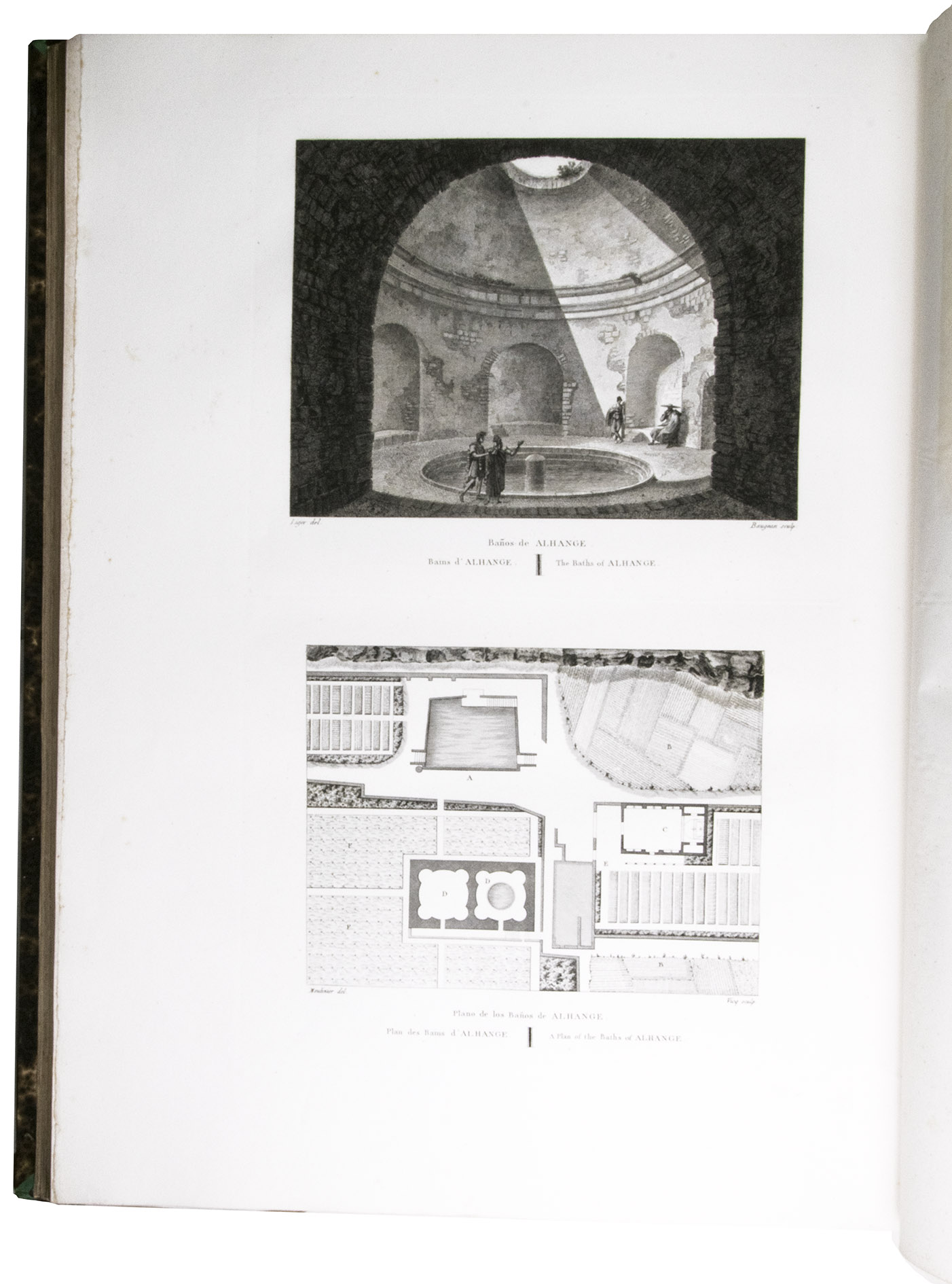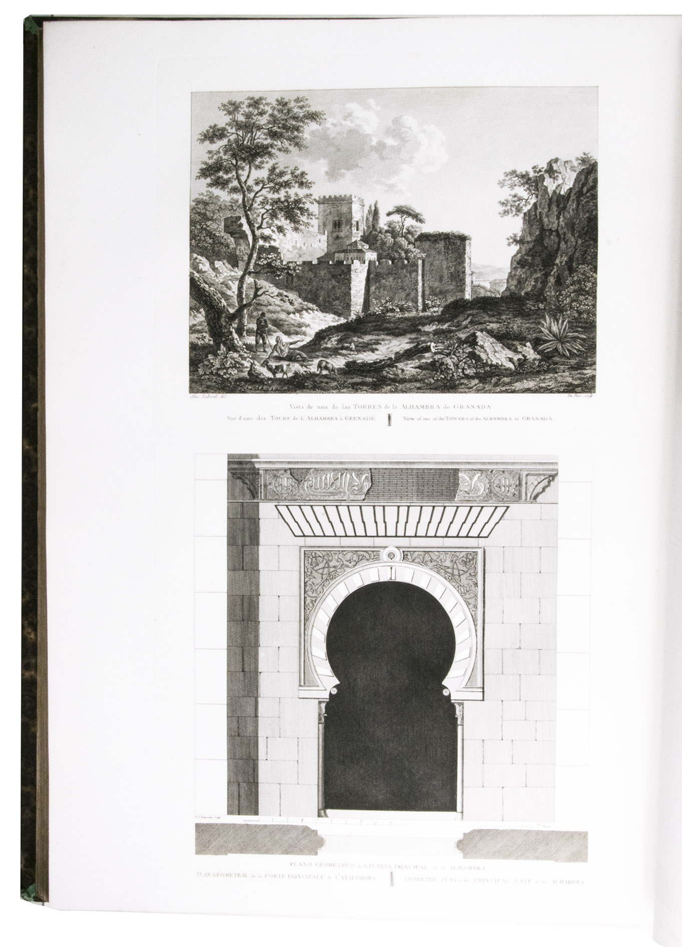 The production of his sumptuous travelogue almost led to his financial ruin, but the result is still impressive today. He was assisted by a team of scholars, artists and writers and had the work set in a beautiful roman type, printed Pierre Didot, one France's most distinguished printers. Although at least the large capitals on the title-pages are the Firmin Didot types that Pierre Didot usually used, the imprints of all four title-pages strangely say "avec les caracteres de Bodoni", the Didots' leading rival. The striking plates show monuments, ancient inscriptions, landscapes and building plans. Truly remarkable are the dozens of illustrations representing the Alhambra. Laborde was particularly impressed by this Islamic palace: "Something in the overall look of the Alhambra makes it truly impressive, and resuscitates an irresistible emotion: the emotion stirred by any monument that embodies strength, greatness and permanence" (vol. 2, p. 17).