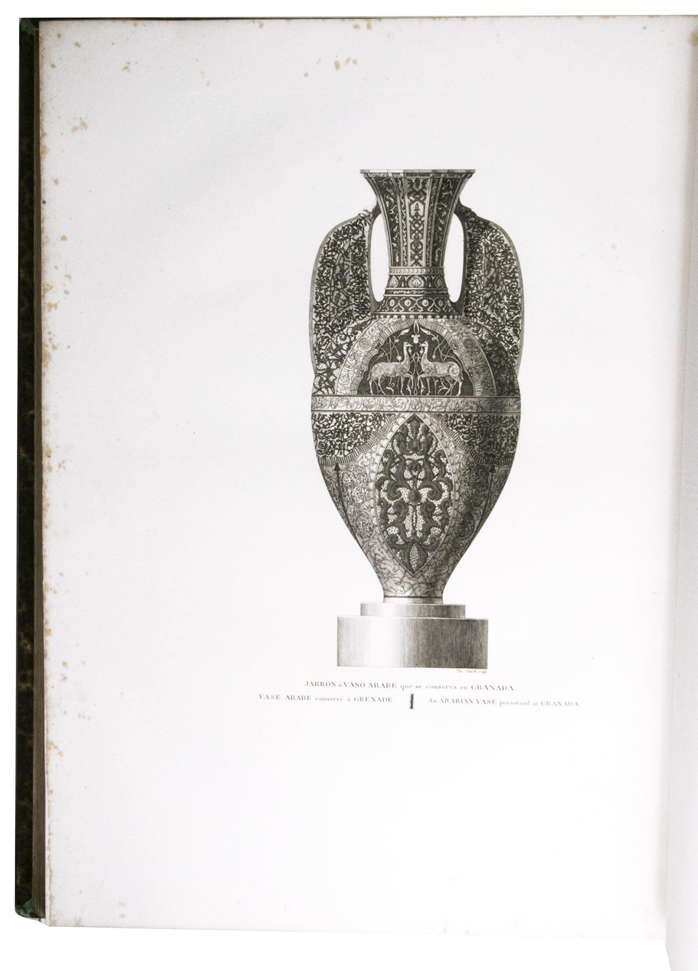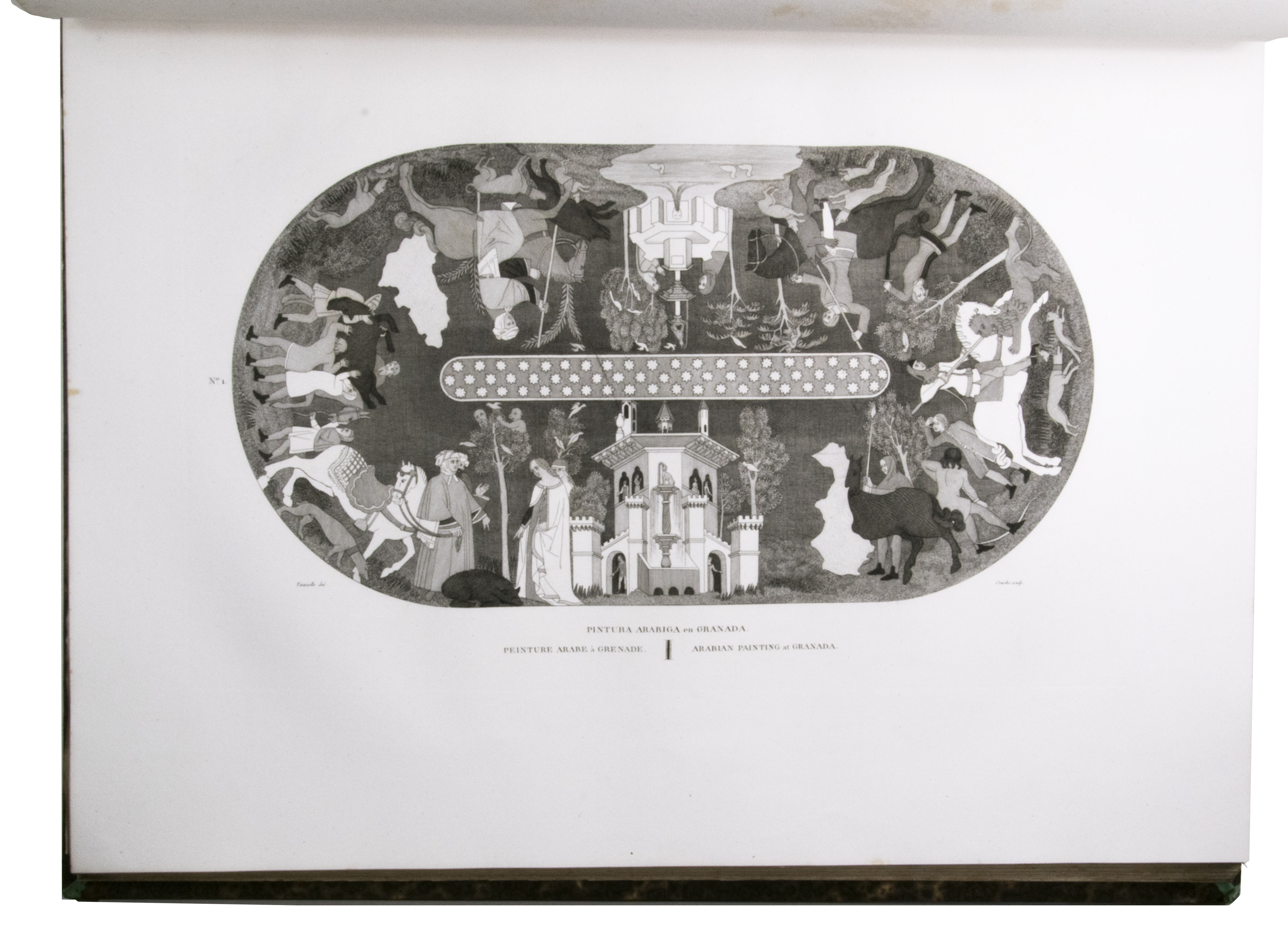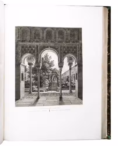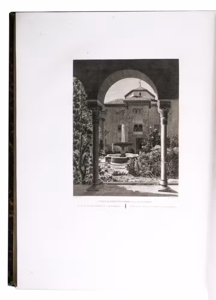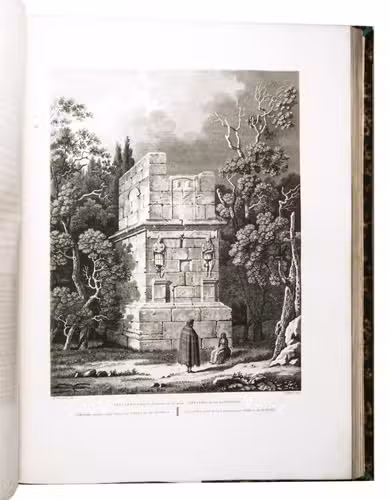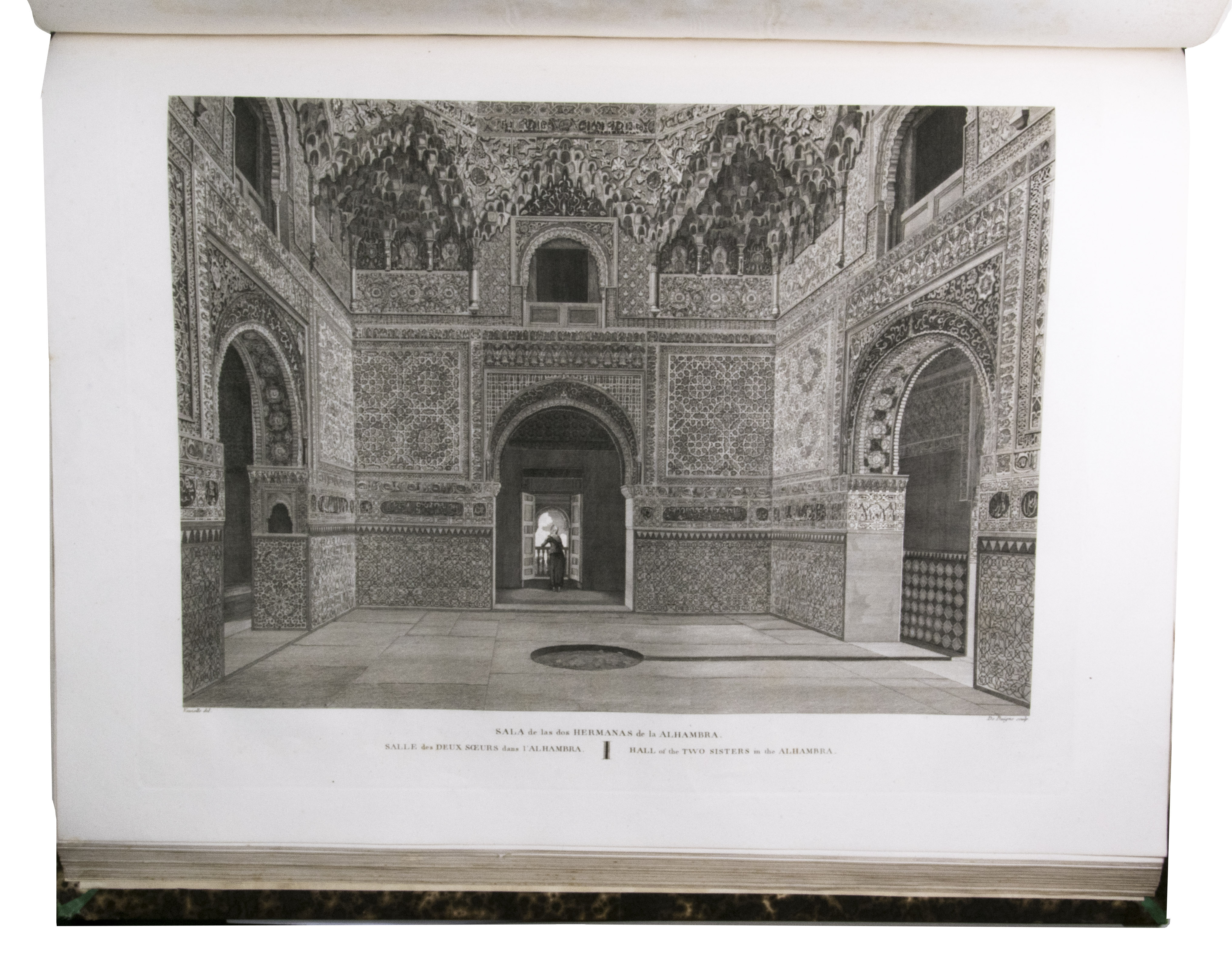 The production of his sumptuous travelogue almost led to his financial ruin, but the result is still impressive today. He was assisted by a team of scholars, artists and writers and had the work set in a beautiful roman type, printed Pierre Didot, one France's most distinguished printers. Although at least the large capitals on the title-pages are the Firmin Didot types that Pierre Didot usually used, the imprints of all four title-pages strangely say "avec les caracteres de Bodoni", the Didots' leading rival. The striking plates show monuments, ancient inscriptions, landscapes and building plans. Truly remarkable are the dozens of illustrations representing the Alhambra. Laborde was particularly impressed by this Islamic palace: "Something in the overall look of the Alhambra makes it truly impressive, and resuscitates an irresistible emotion: the emotion stirred by any monument that embodies strength, greatness and permanence" (vol. 2, p. 17).