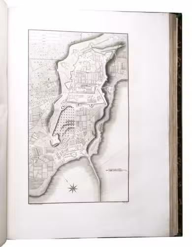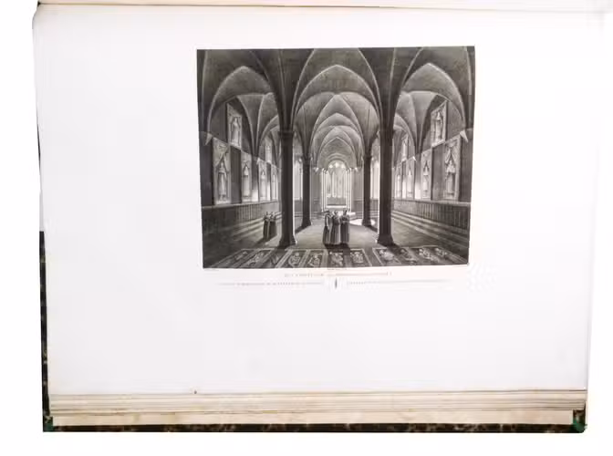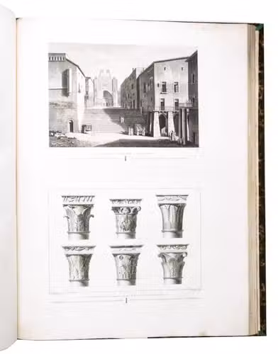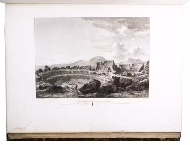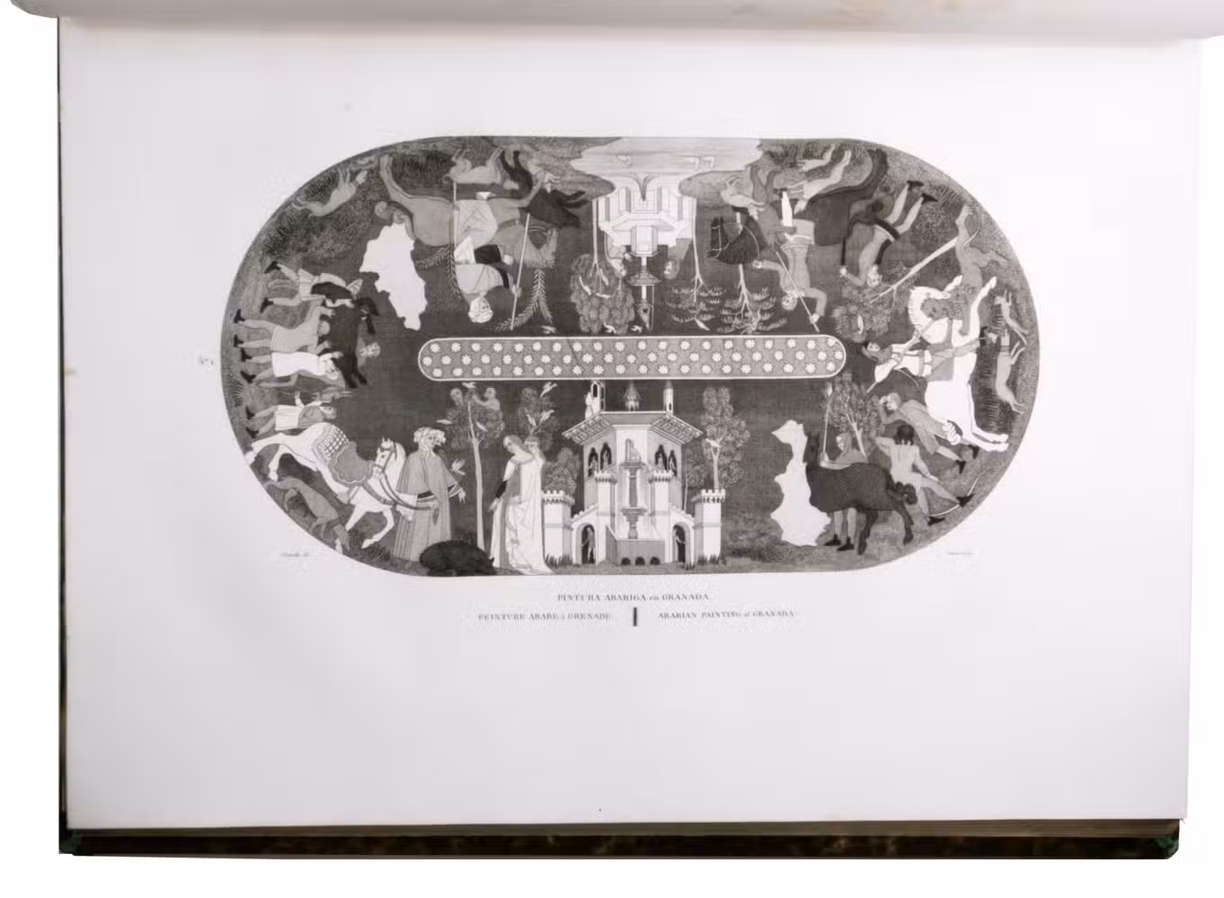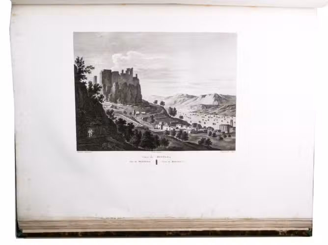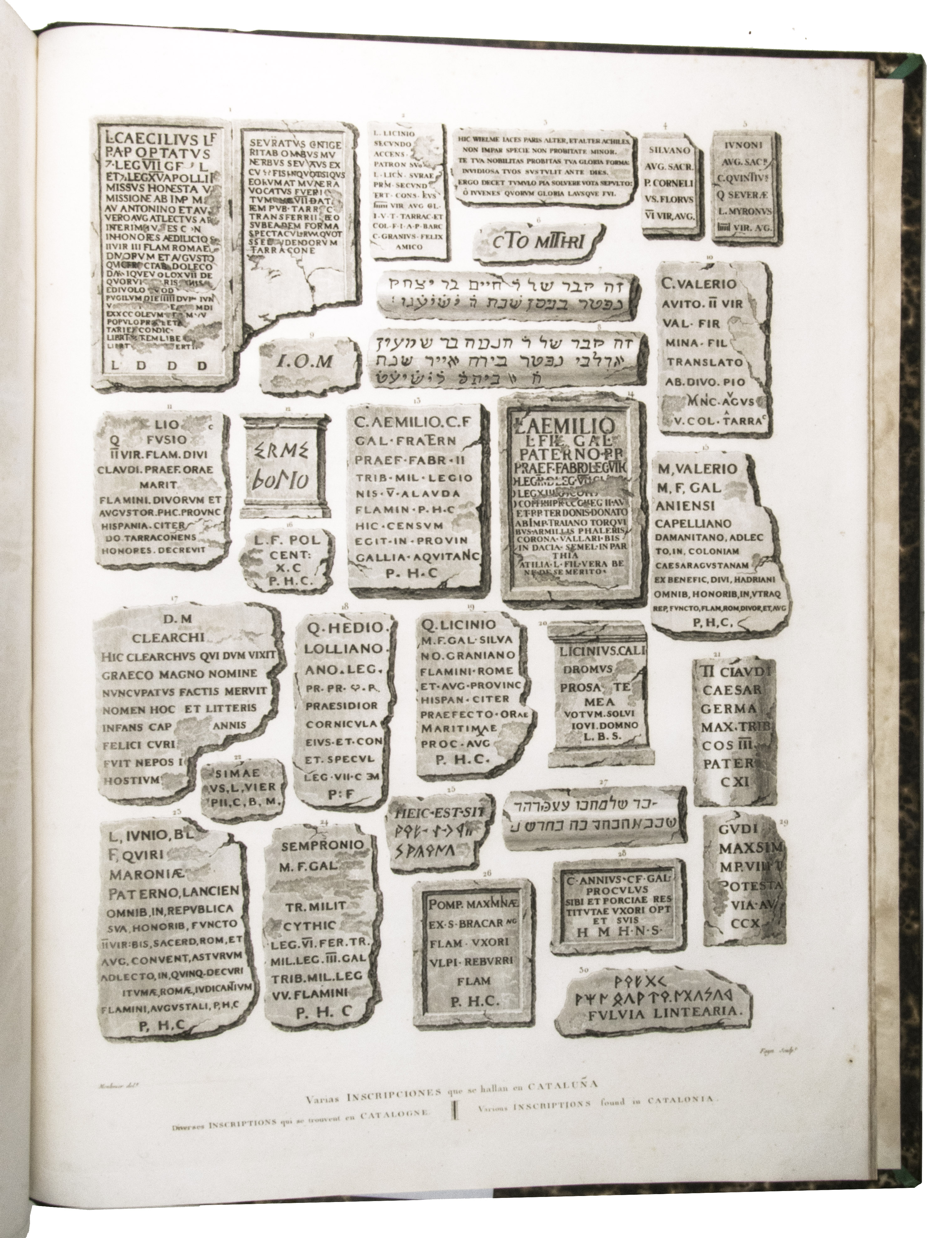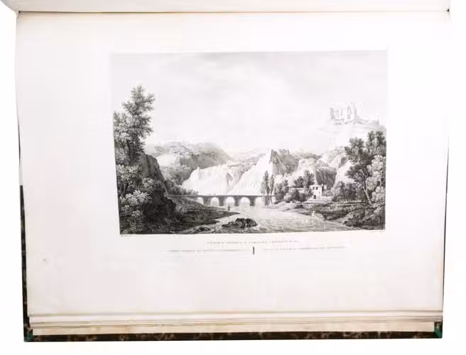 The production of his sumptuous travelogue almost led to his financial ruin, but the result is still impressive today. He was assisted by a team of scholars, artists and writers and had the work set in a beautiful roman type, printed Pierre Didot, one France's most distinguished printers. Although at least the large capitals on the title-pages are the Firmin Didot types that Pierre Didot usually used, the imprints of all four title-pages strangely say "avec les caracteres de Bodoni", the Didots' leading rival. The striking plates show monuments, ancient inscriptions, landscapes and building plans. Truly remarkable are the dozens of illustrations representing the Alhambra. Laborde was particularly impressed by this Islamic palace: "Something in the overall look of the Alhambra makes it truly impressive, and resuscitates an irresistible emotion: the emotion stirred by any monument that embodies strength, greatness and permanence" (vol. 2, p. 17).