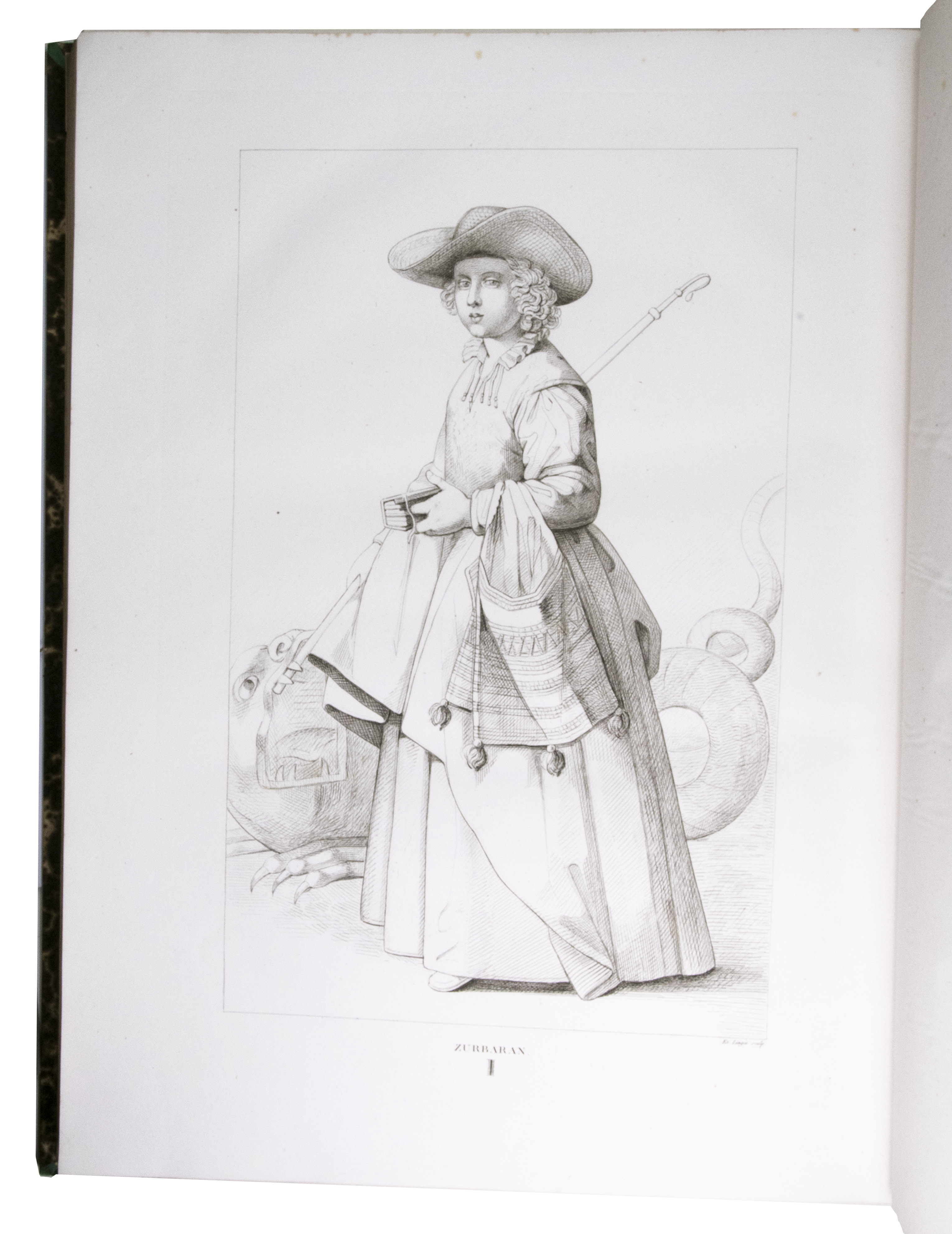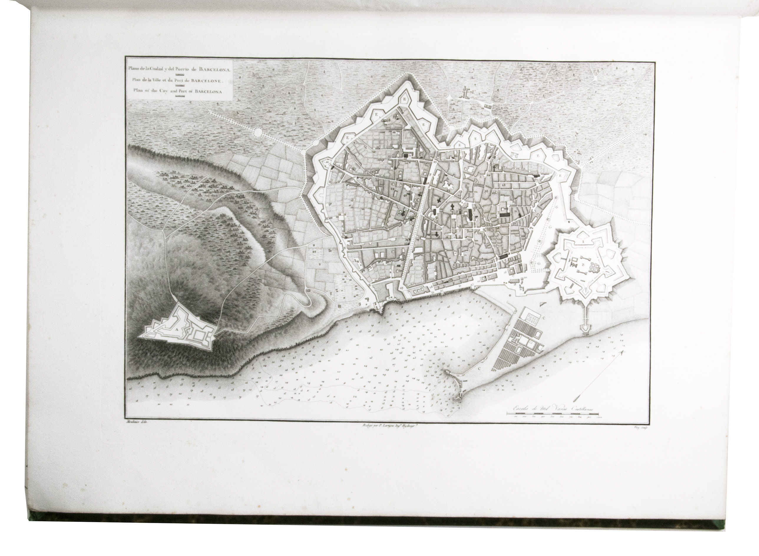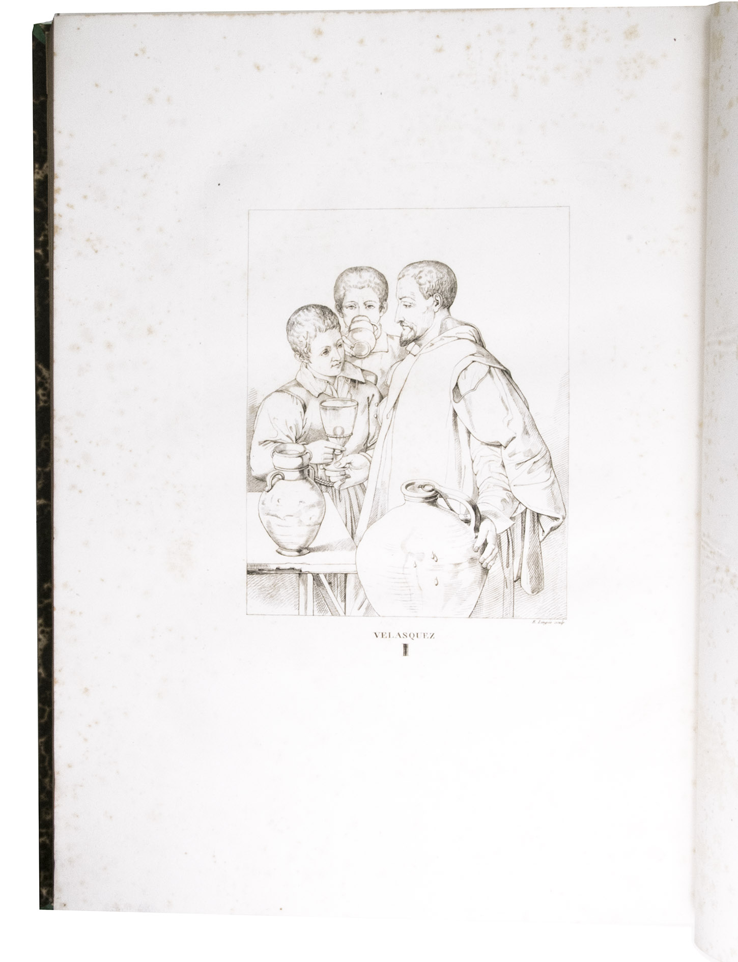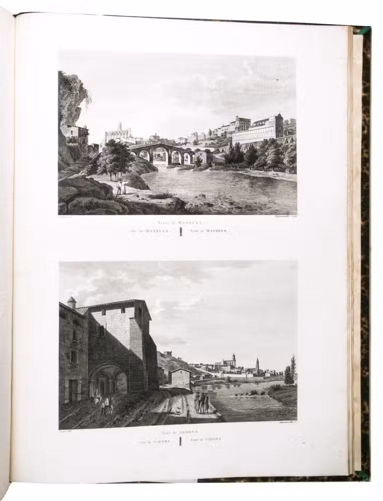 Many towns and cities are depicted, in vol. I: Barcelona, S. Michel del Fay, Martorel, Mont-Serrat, Olerdola, Tarragone, Tartose, Lérida, Poblet, Belpuch, Cardona, Manresa, and Girone; vol. II: Valence, Murviedro, Almenara, Cabanes, Villafames, Chulilla, Chelves, San Felippe, Montesa, Dayemus, Denia, Calp, Villa-Joyosa, Alicante, Elche, Badajoz, Merida, Alconeta, Alcantare, Caceras, Caria, Caperra Talavero, and Guadalupe; vol. III: Belmes, Espiel, Sierra Morena, Cordova, Grenada, Alhambra, Loxa, Sevilla, Italica, Malaga, Gibraltar, and Cadix; vol. IV: Pampelune, Renceveaux, Saragossa, Burgos, Segovia, Talavera, Valladolid, Coca, Saint-Ildephonse, l'Escurial, Tolede, Aranjuez, Madrid, Ocana, Grenada, and some plates depicting paintings by famous Spanish artists like Velasquez, Fernand-Cortès, Claude Coello, Ribera, and Murillo.