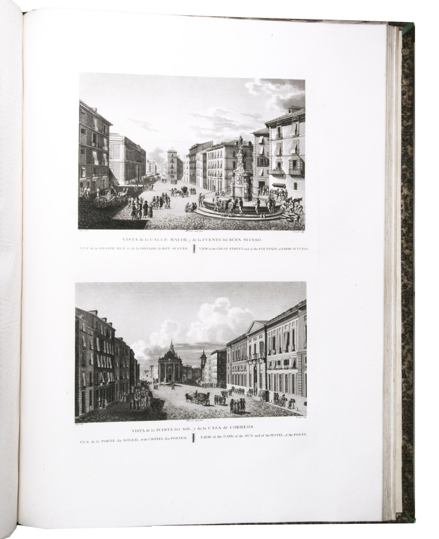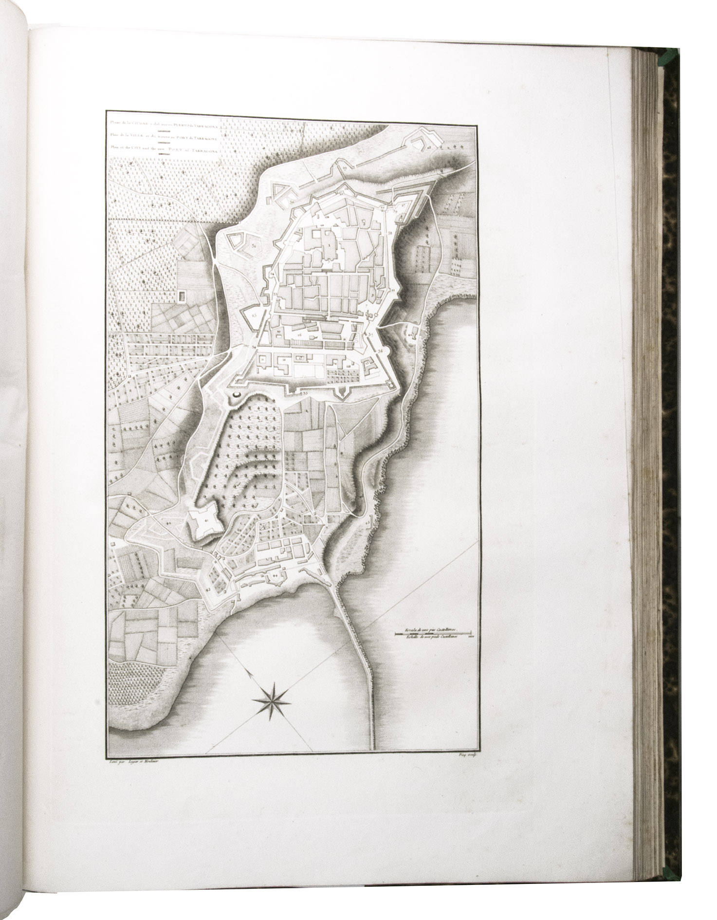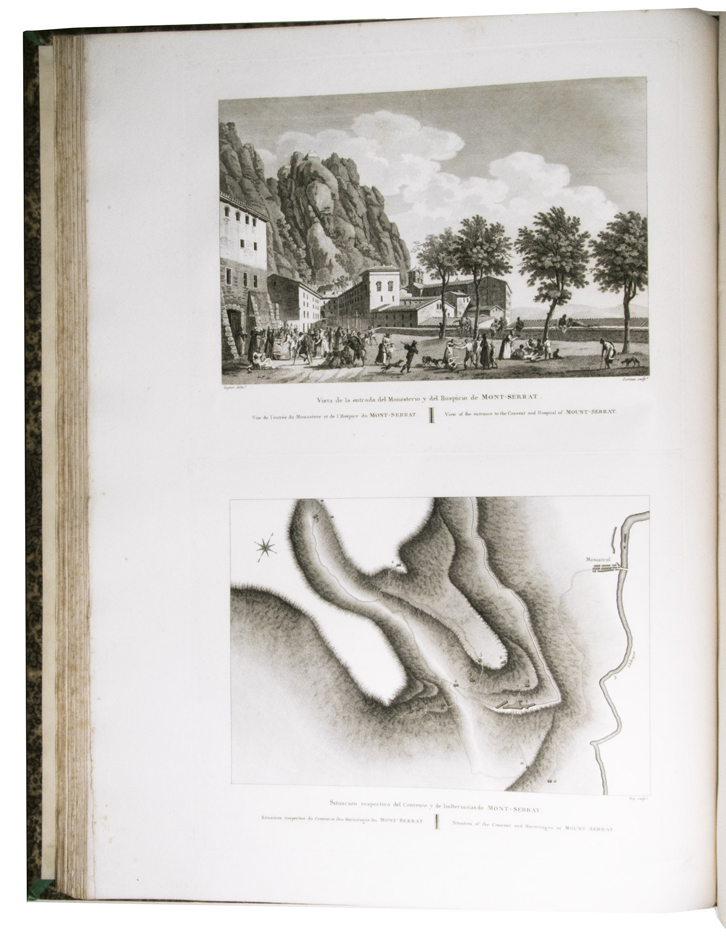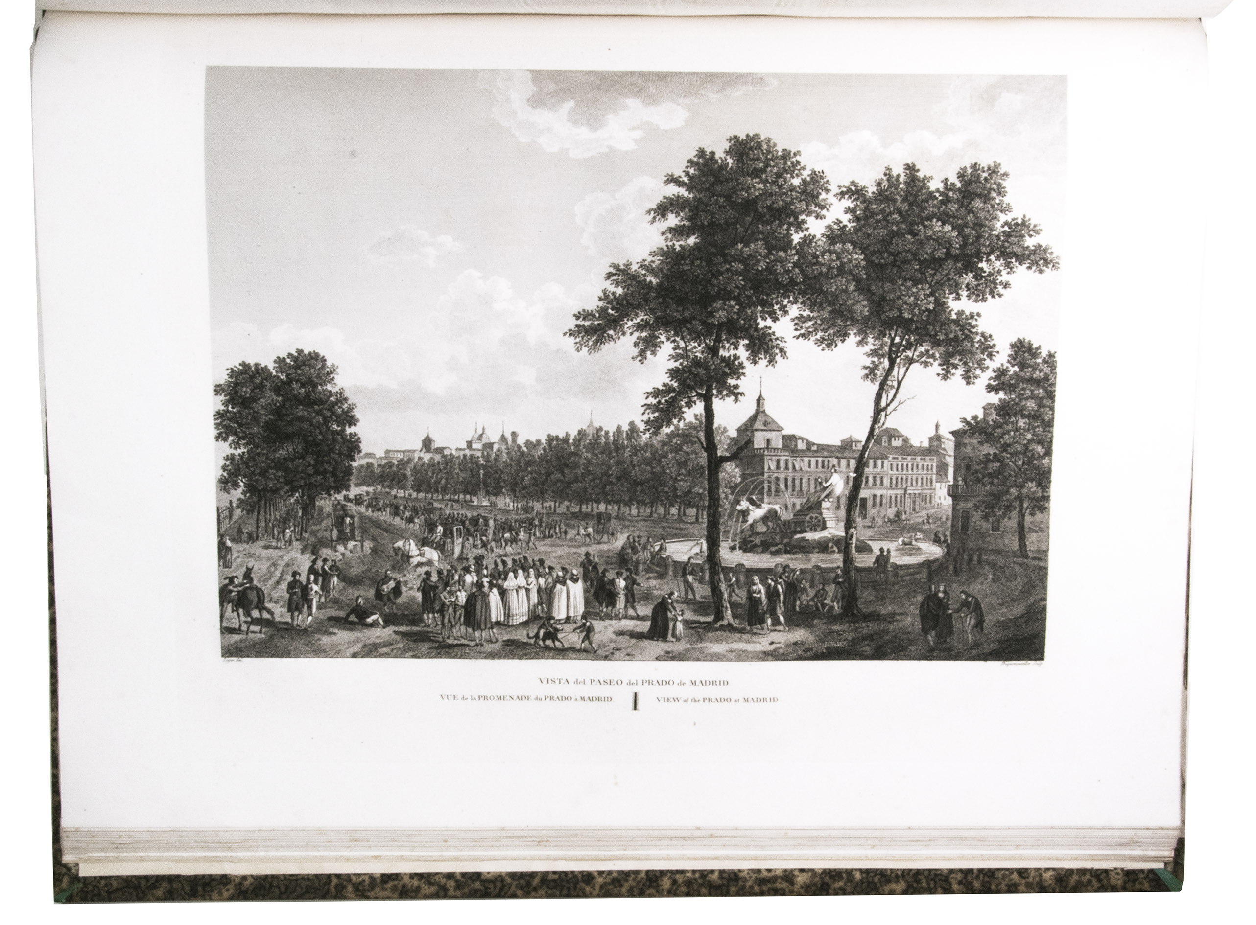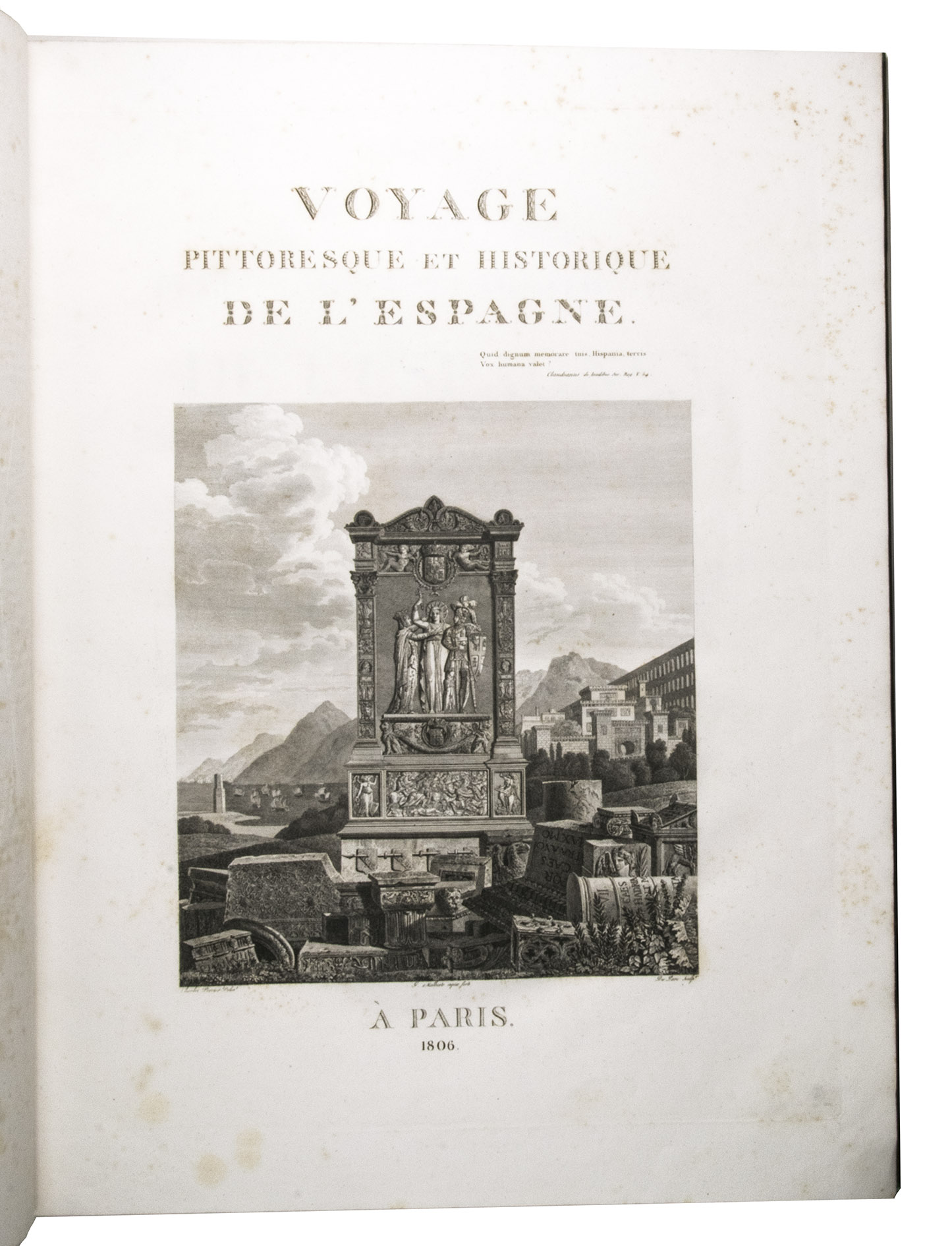 Paris, Pierre Didot l'aîné, 1806-1820. 2 volumes, each in 2 parts, bound as 4. 1mo (57 x 44 cm). With engraved illustrated title-page by Du Parc after Charles Percier, 4 letterpress title-pages, each with a different engraved illustration, 272 engraved plates and 2 large double-page engraved maps, of Spain and Portugal. Contemporary green half morocco. XLVI, 72, [2]; 73-132; XLV, [1 blank], 33, [1 blank] [2]; XCI [= LXXXI], [1 blank] pp.