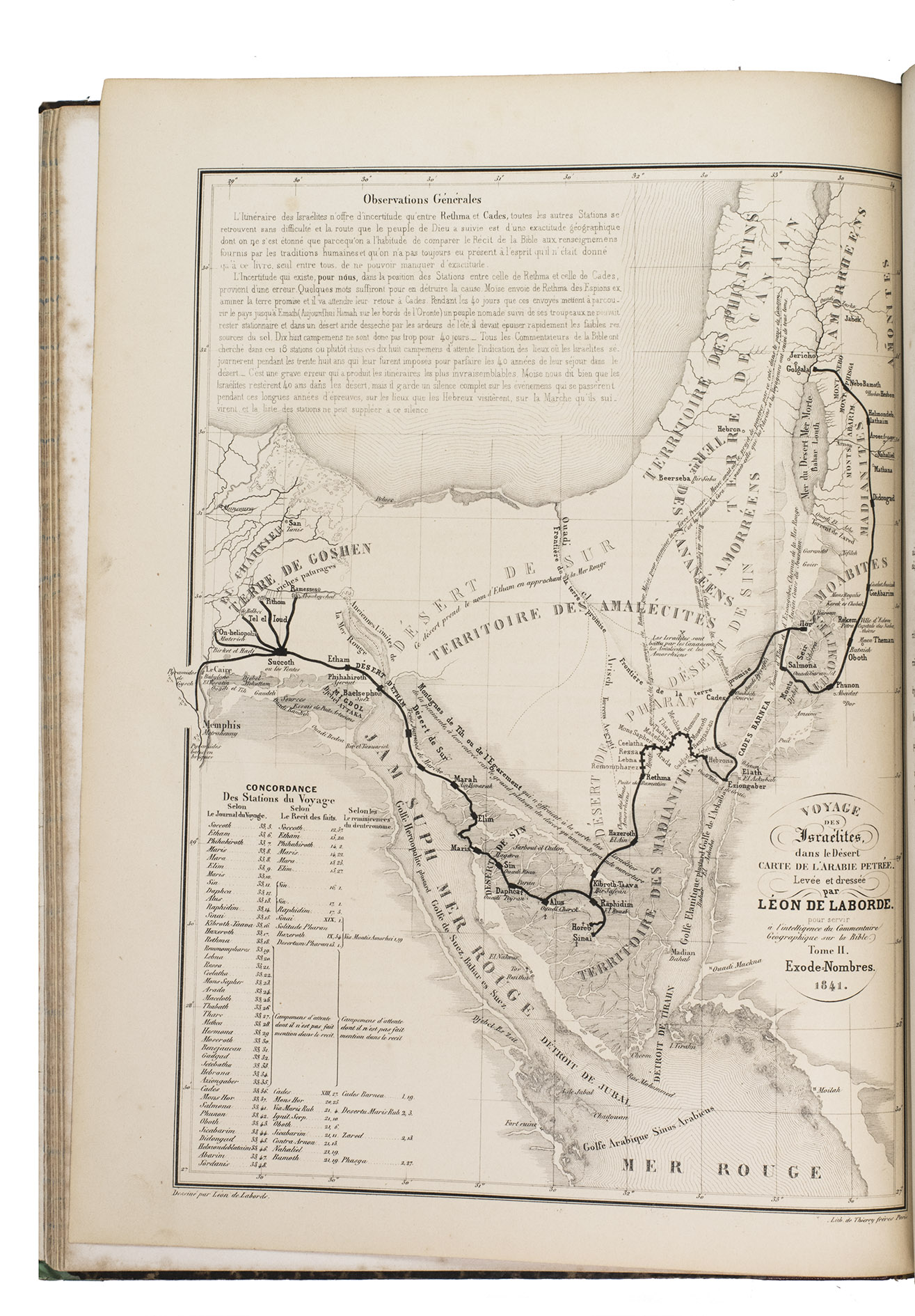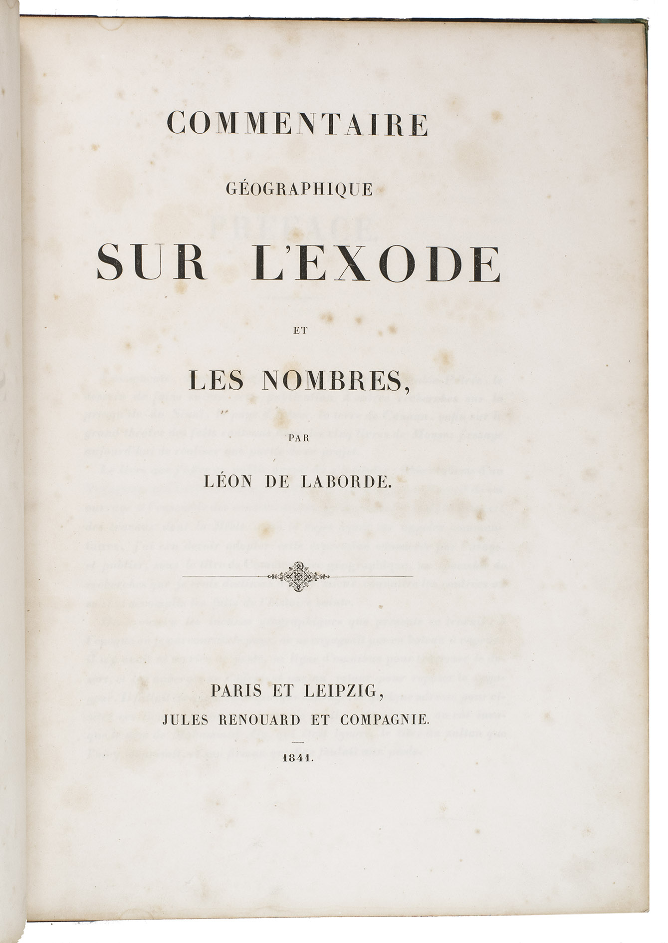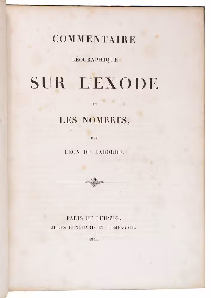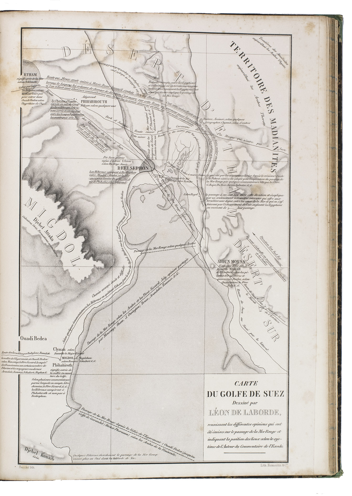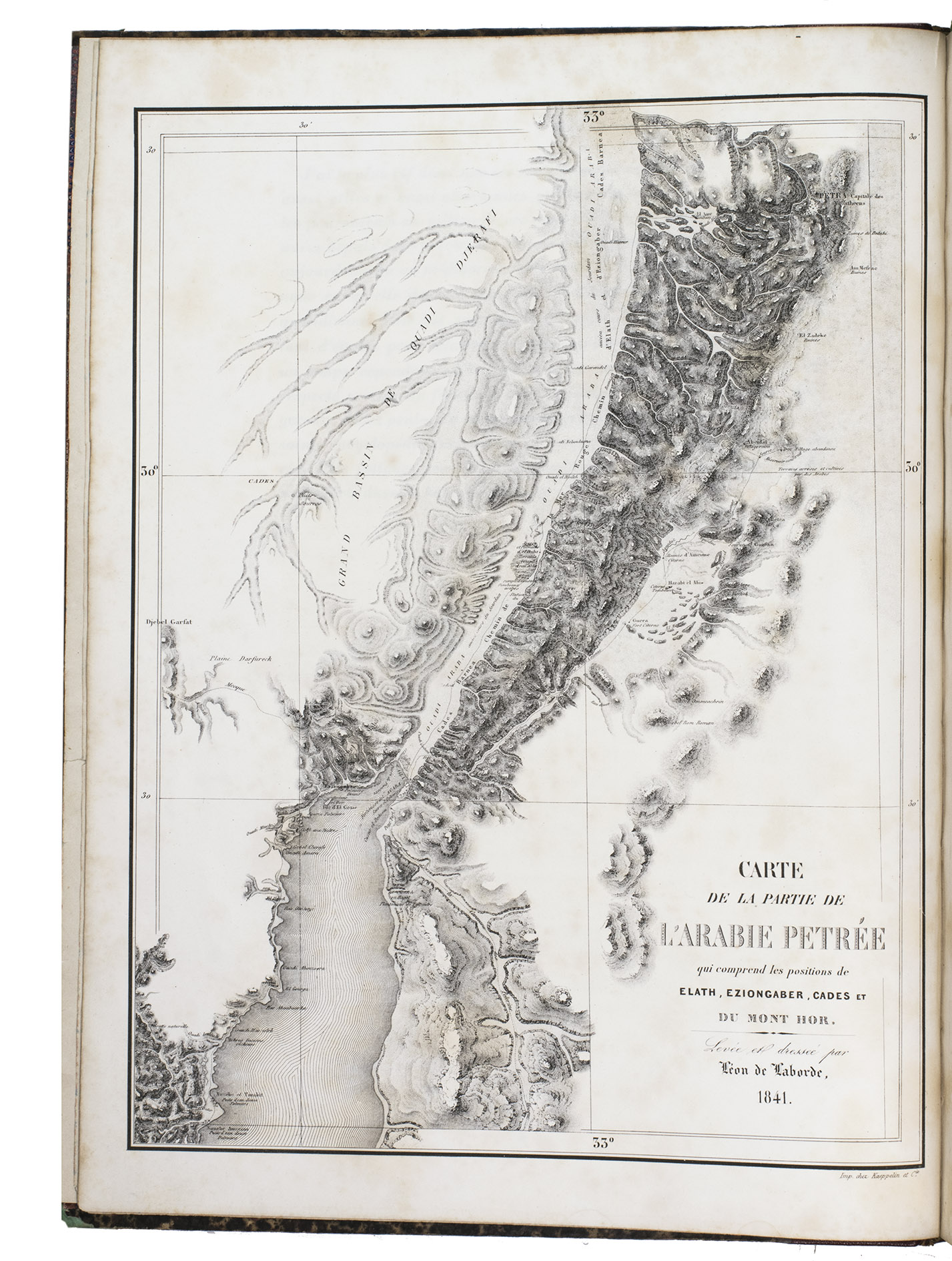 First and only edition of this groundbreaking geographical and sociological commentary on the Exodus of the Israelites from Egypt described in the Old Testament. This work by the French archaeologist and traveler Léon Emmanuel Simon Joseph Laborde (1807-1869) is particularly impressive due to the bold and cleanly lithographed plates produced by the Parisian firm of Formentin, Kaeppelin, and Thierry after his detailed drawings. These plates show the following images, which also contained new cartographic findings at the time: an overview map of the route of the Exodus, parts of the former Roman province of Arabia Petraea (roughly encompassing the Sinai Peninsula and the west of present-day Jordan), the western part of present-day Egypt and the area around the city of Suez, the Gulf of Suez, Wadi Feiran on the Sinai Peninsula, the mountain range around Horeb and Mount Catherine in the south of Sinai, the area around Dahab on the Red Sea, and the Gulf of Aqaba. Also noteworthy is Laborde's knowledgeable analysis of the biblical texts, which are also printed in ancient Greek and Latin versions. "One would like to read, for example, the observations on magic effected on Egyptian beaches, or everything that Laborde wrote on animals, illnesses, or the costumes of the Orient" (François Laplanche).