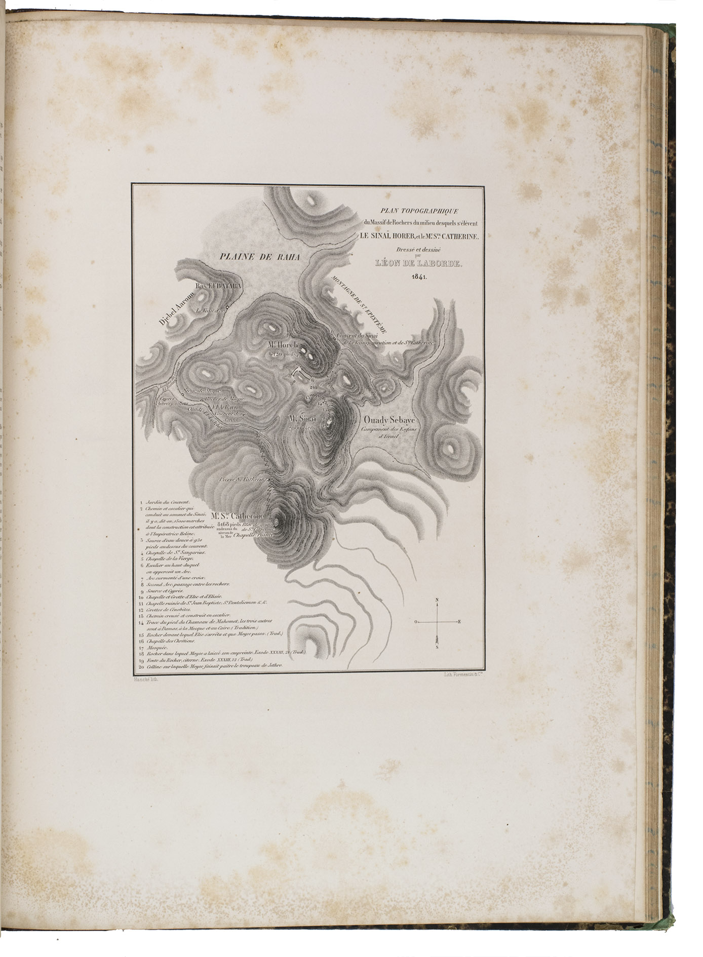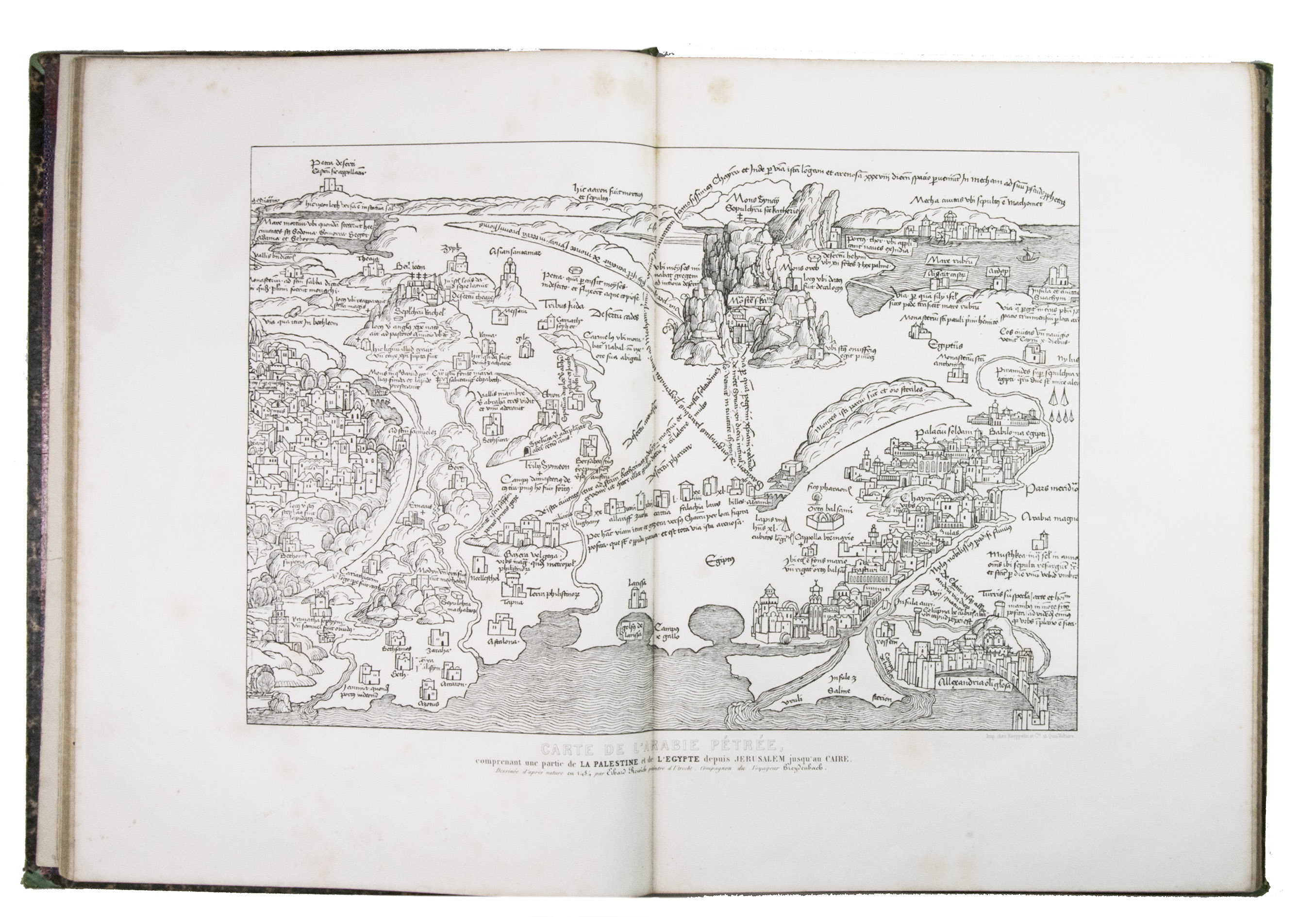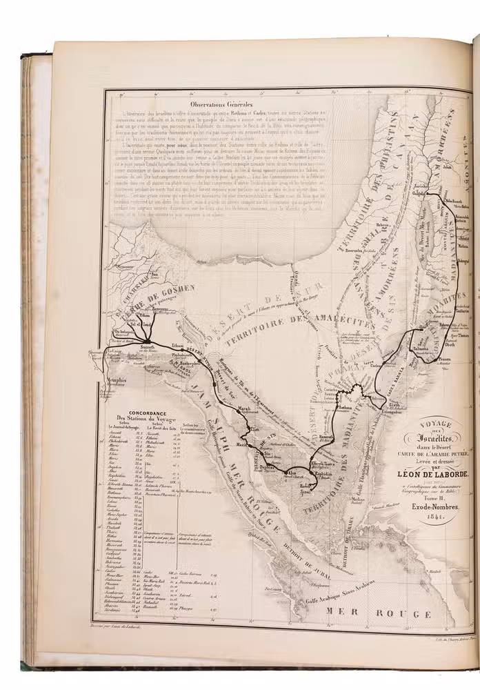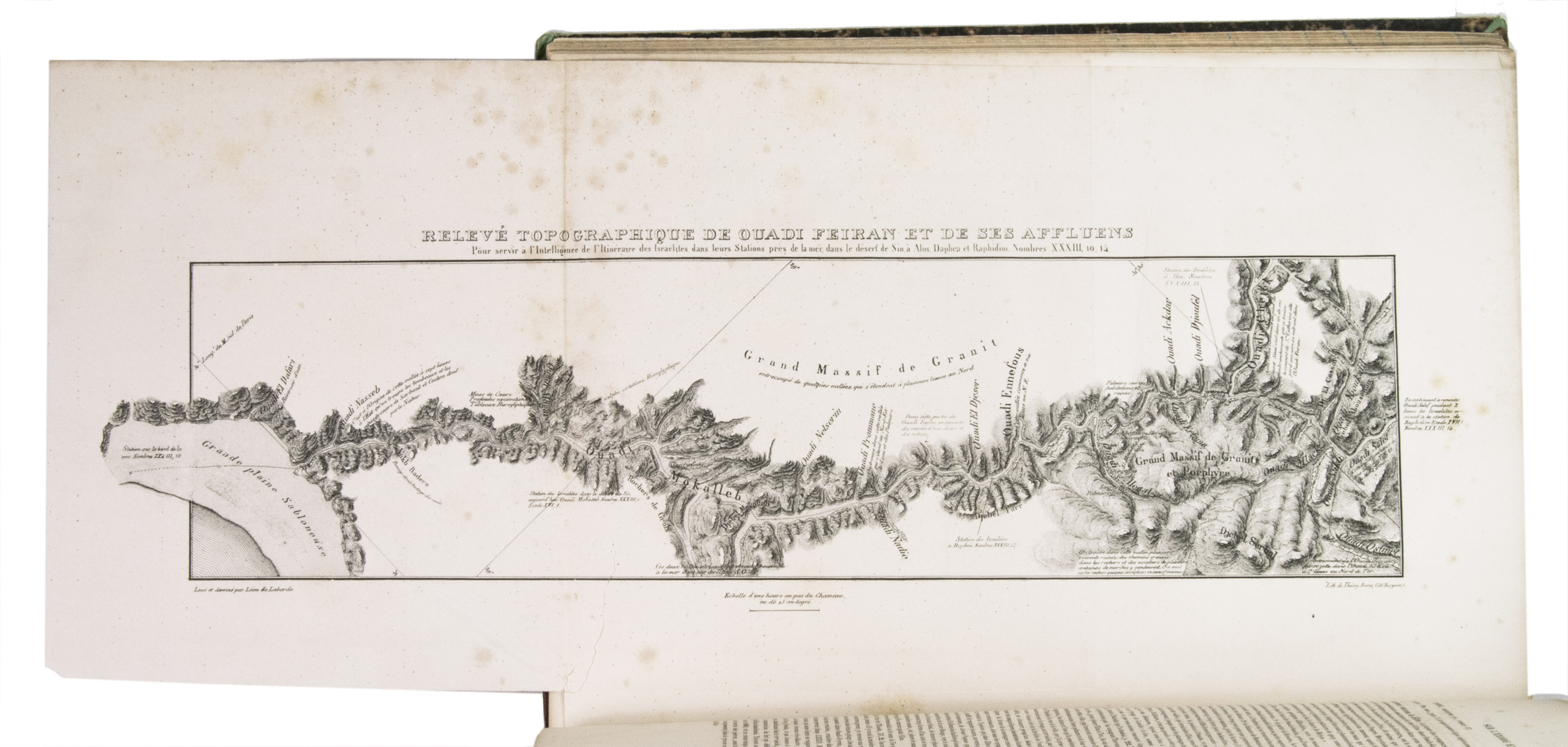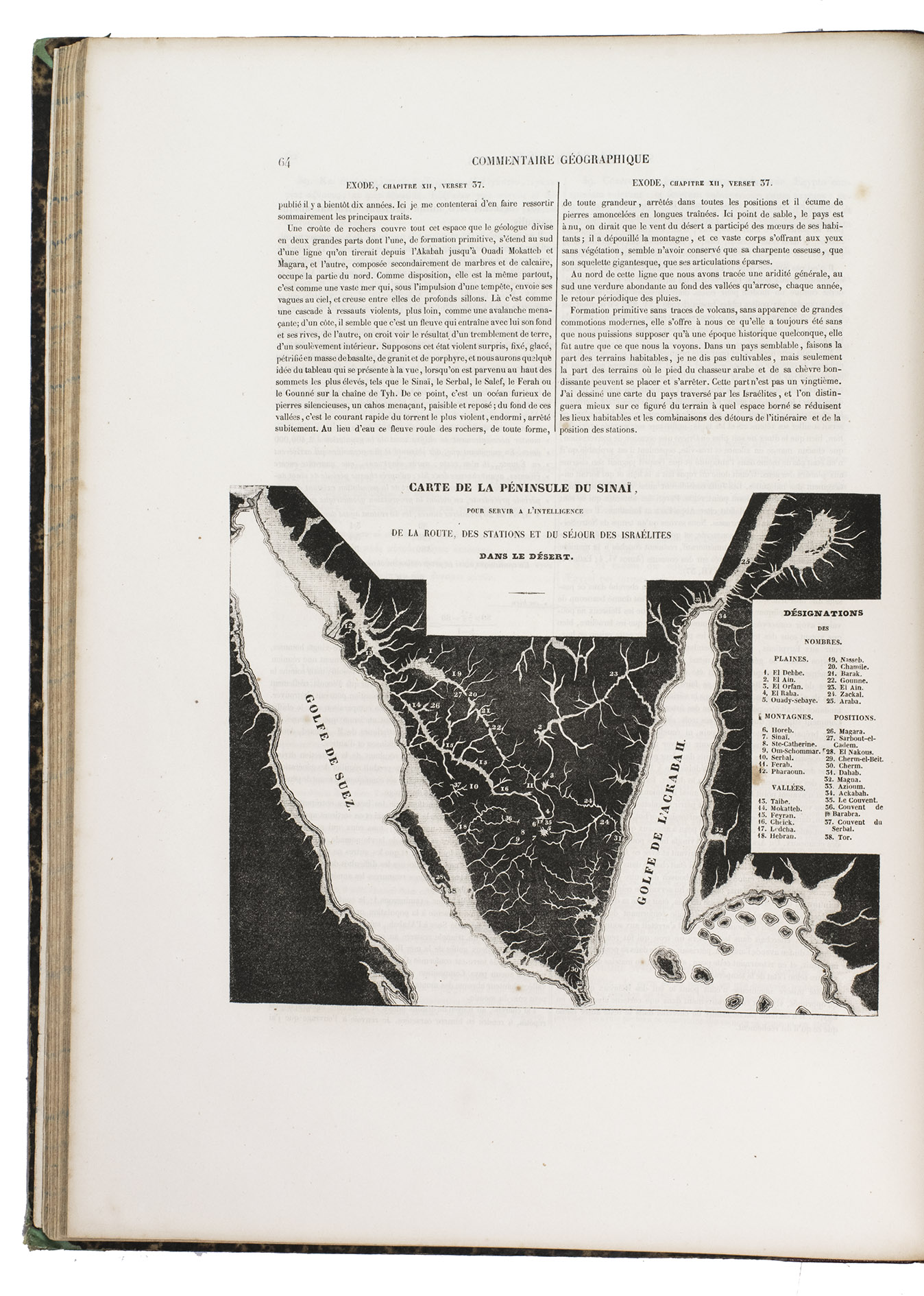 First and only edition of this groundbreaking geographical and sociological commentary on the Exodus of the Israelites from Egypt described in the Old Testament. This work by the French archaeologist and traveler Léon Emmanuel Simon Joseph Laborde (1807-1869) is particularly impressive due to the bold and cleanly lithographed plates produced by the Parisian firm of Formentin, Kaeppelin, and Thierry after his detailed drawings. These plates show the following images, which also contained new cartographic findings at the time: an overview map of the route of the Exodus, parts of the former Roman province of Arabia Petraea (roughly encompassing the Sinai Peninsula and the west of present-day Jordan), the western part of present-day Egypt and the area around the city of Suez, the Gulf of Suez, Wadi Feiran on the Sinai Peninsula, the mountain range around Horeb and Mount Catherine in the south of Sinai, the area around Dahab on the Red Sea, and the Gulf of Aqaba. Also noteworthy is Laborde's knowledgeable analysis of the biblical texts, which are also printed in ancient Greek and Latin versions. "One would like to read, for example, the observations on magic effected on Egyptian beaches, or everything that Laborde wrote on animals, illnesses, or the costumes of the Orient" (François Laplanche).