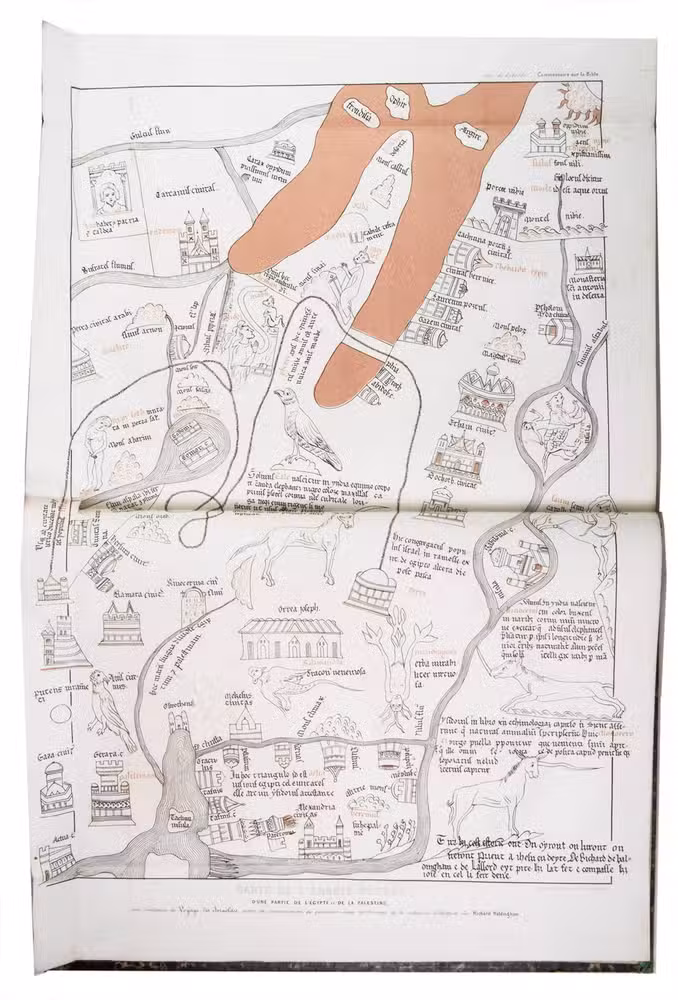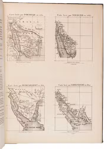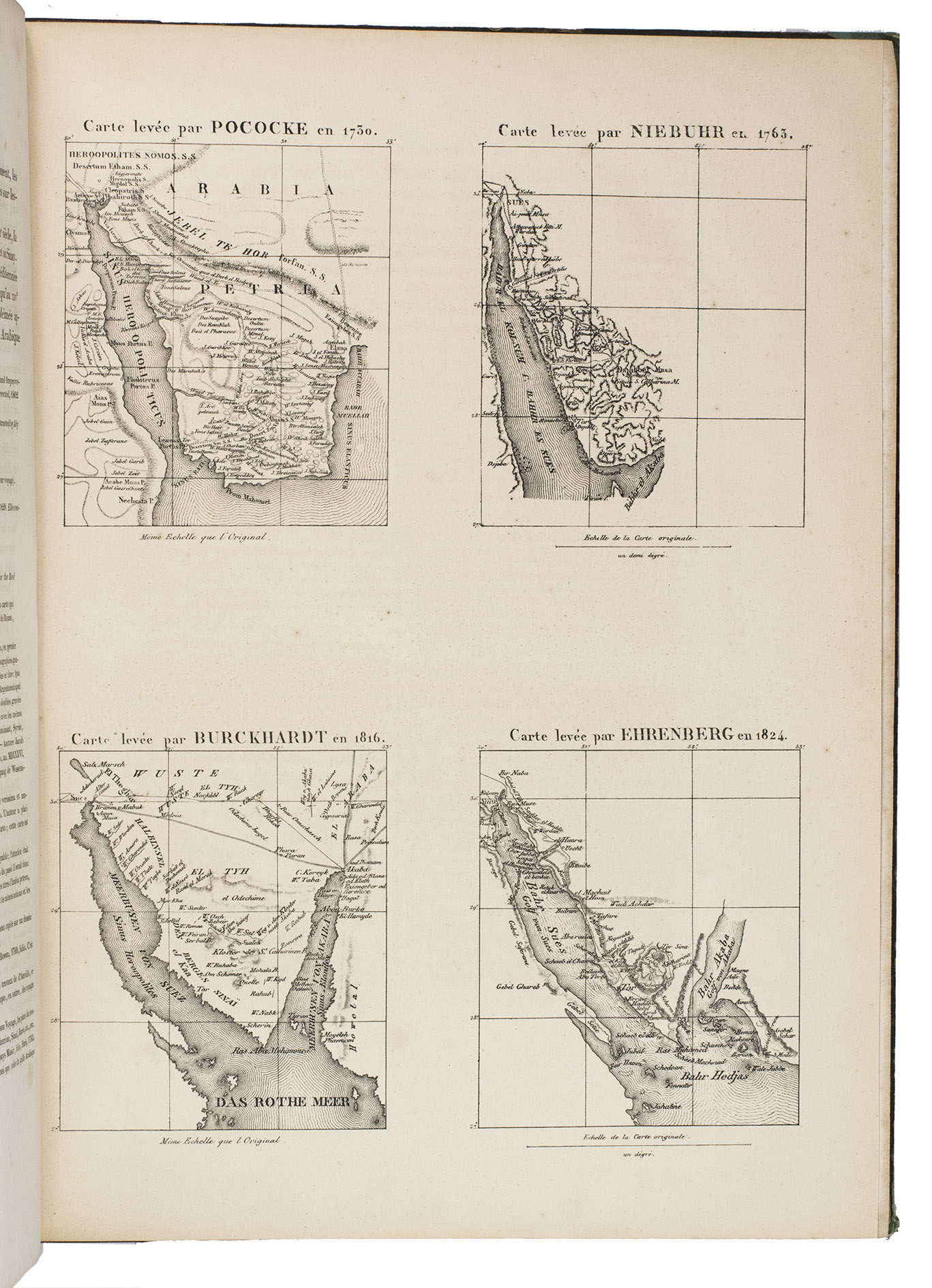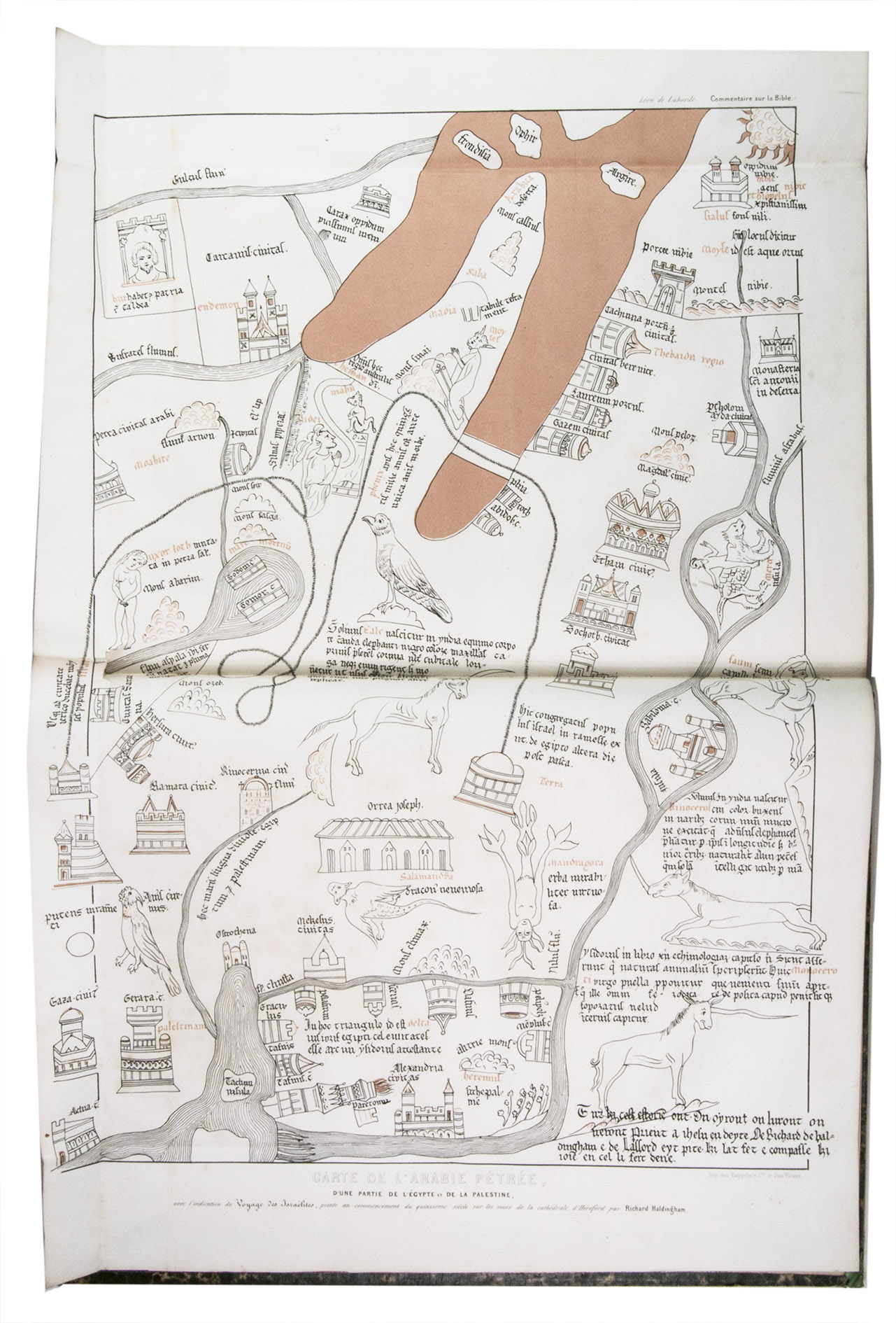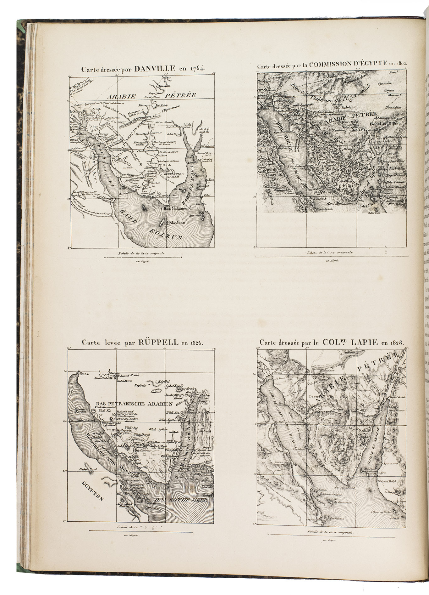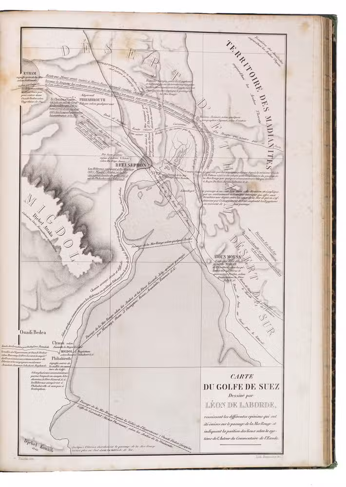 First and only edition of this groundbreaking geographical and sociological commentary on the Exodus of the Israelites from Egypt described in the Old Testament. This work by the French archaeologist and traveler Léon Emmanuel Simon Joseph Laborde (1807-1869) is particularly impressive due to the bold and cleanly lithographed plates produced by the Parisian firm of Formentin, Kaeppelin, and Thierry after his detailed drawings. These plates show the following images, which also contained new cartographic findings at the time: an overview map of the route of the Exodus, parts of the former Roman province of Arabia Petraea (roughly encompassing the Sinai Peninsula and the west of present-day Jordan), the western part of present-day Egypt and the area around the city of Suez, the Gulf of Suez, Wadi Feiran on the Sinai Peninsula, the mountain range around Horeb and Mount Catherine in the south of Sinai, the area around Dahab on the Red Sea, and the Gulf of Aqaba. Also noteworthy is Laborde's knowledgeable analysis of the biblical texts, which are also printed in ancient Greek and Latin versions. "One would like to read, for example, the observations on magic effected on Egyptian beaches, or everything that Laborde wrote on animals, illnesses, or the costumes of the Orient" (François Laplanche).