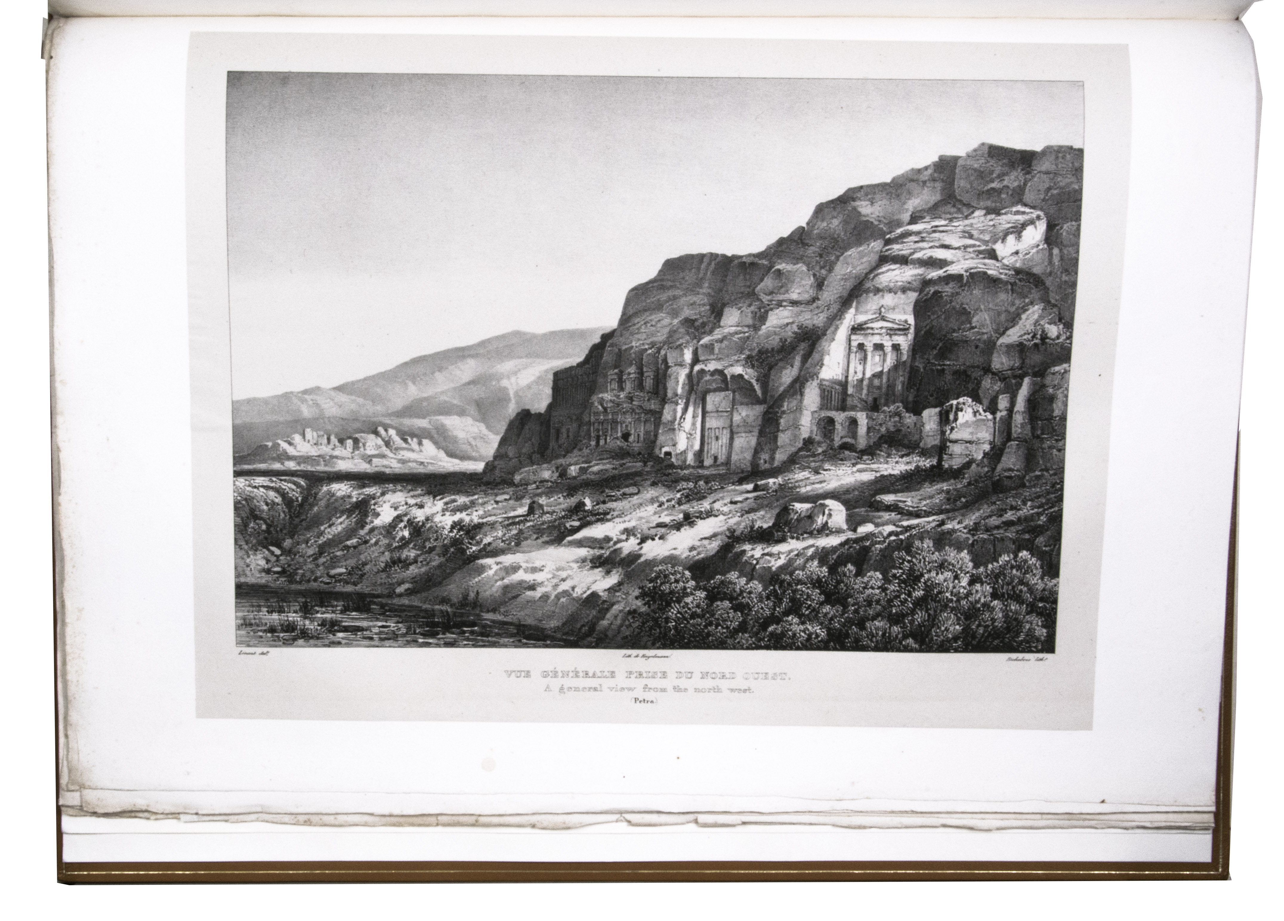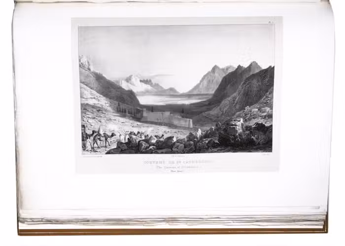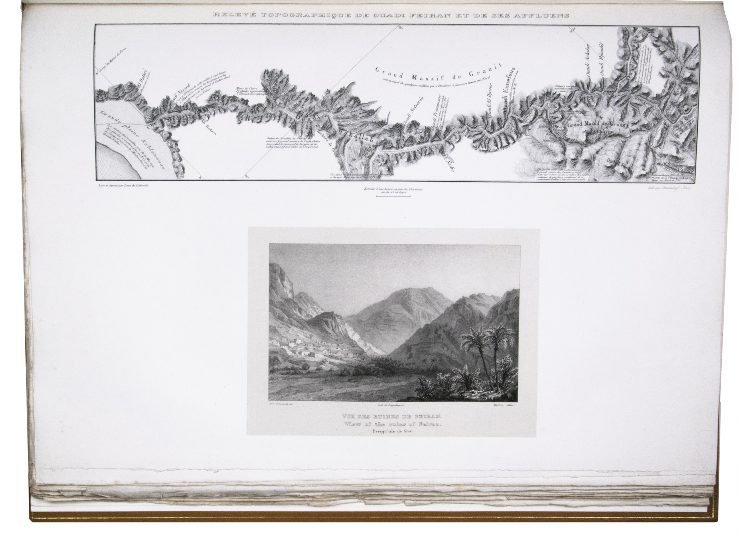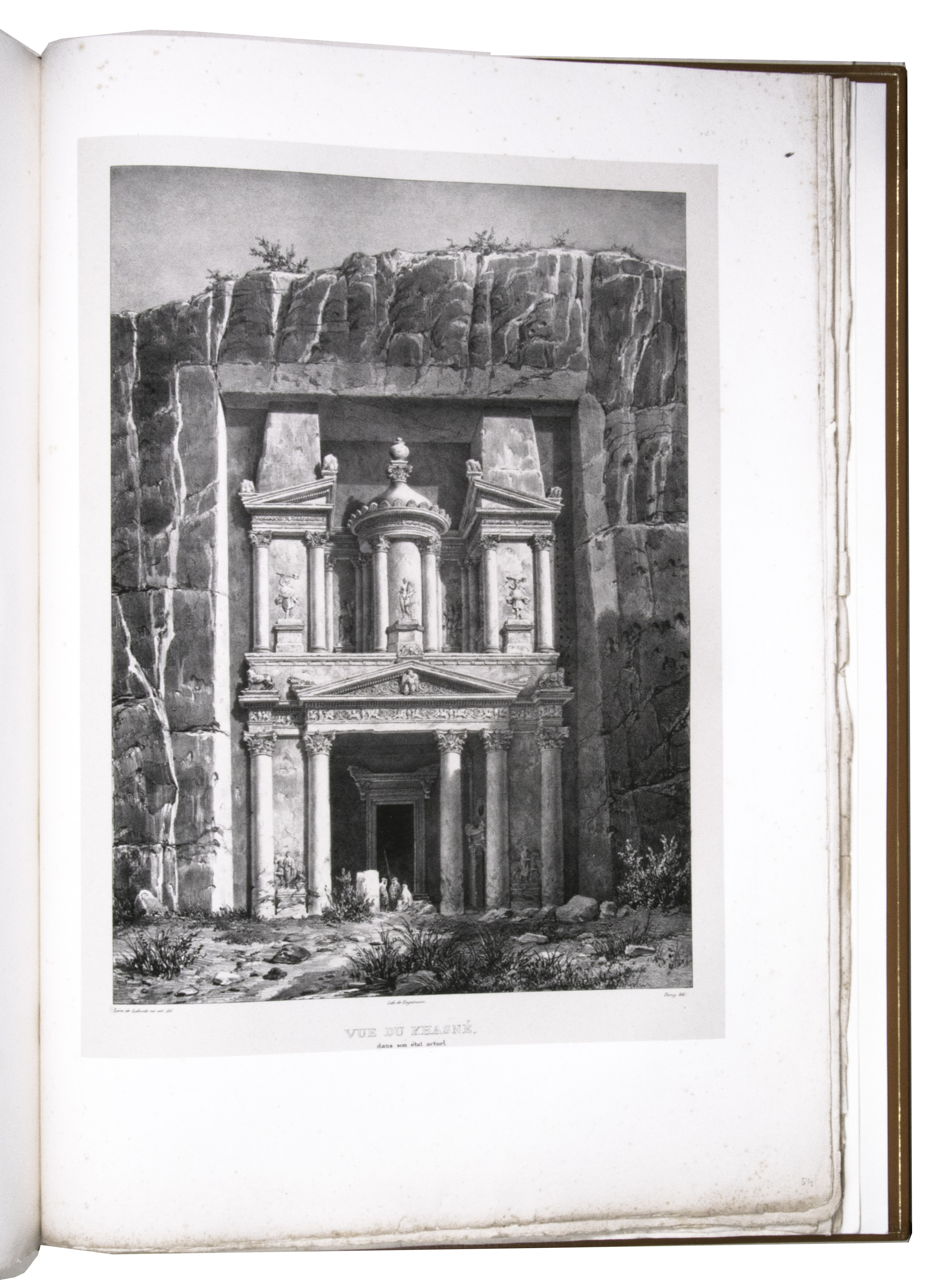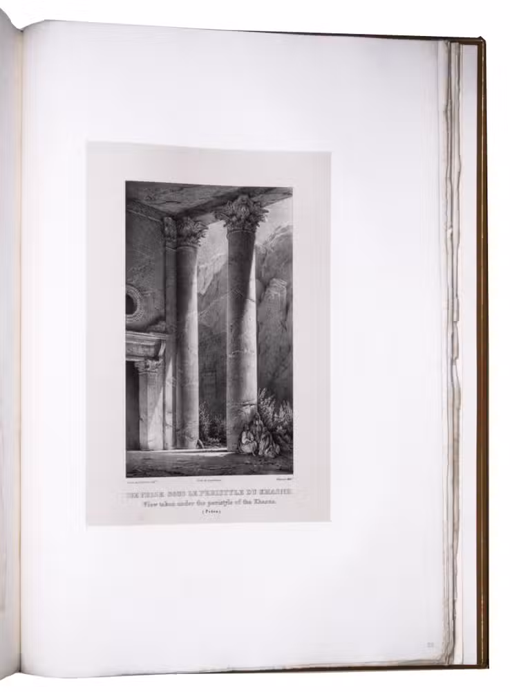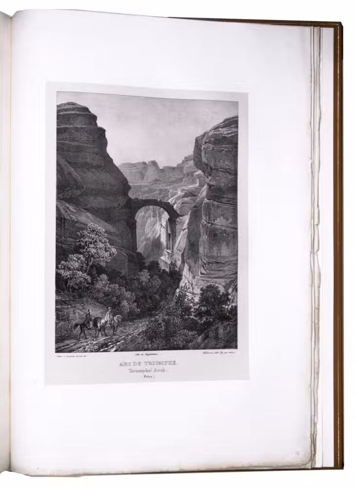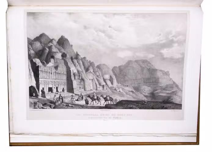 First edition of "an important work" (Blackmer) of a stunning and beautifully illustrated account of some of the earliest explorations in the Sinai, southern Jordan and northwest Arabia, complete with all the magnificent views in extremely large format, the double-page plates measuring about 58.5 x 83 cm and the folding map of the Sinai about 74 x 102 cm. All subsequent editions, including the English one, were published in octavo and contained only a few plates based on the present first edition, all in drastically reduced format. The plates show maps, plans of ancient sites, views of ruins and other buildings, coastal and other topographic views, costume plates, hieroglyphic and other inscriptions, flora and fauna. Laborde journeyed to the ancient city of Petra in what is now Jordan with the engineer Linant de Bellefonds in 1828, travelling from Suez via St. Catherine's and through Wadi al-Araba to Akabah. The topographic term Arabie Pétrée derives from Ptolemy's division of Arabia into three regions. The maps in the present book show it as the Sinai peninsula, the southern part of what is now Jordan and the northwestern part of the Arabian peninsula. The city of Petra itself is extensively documented in many of the present beautiful plates.