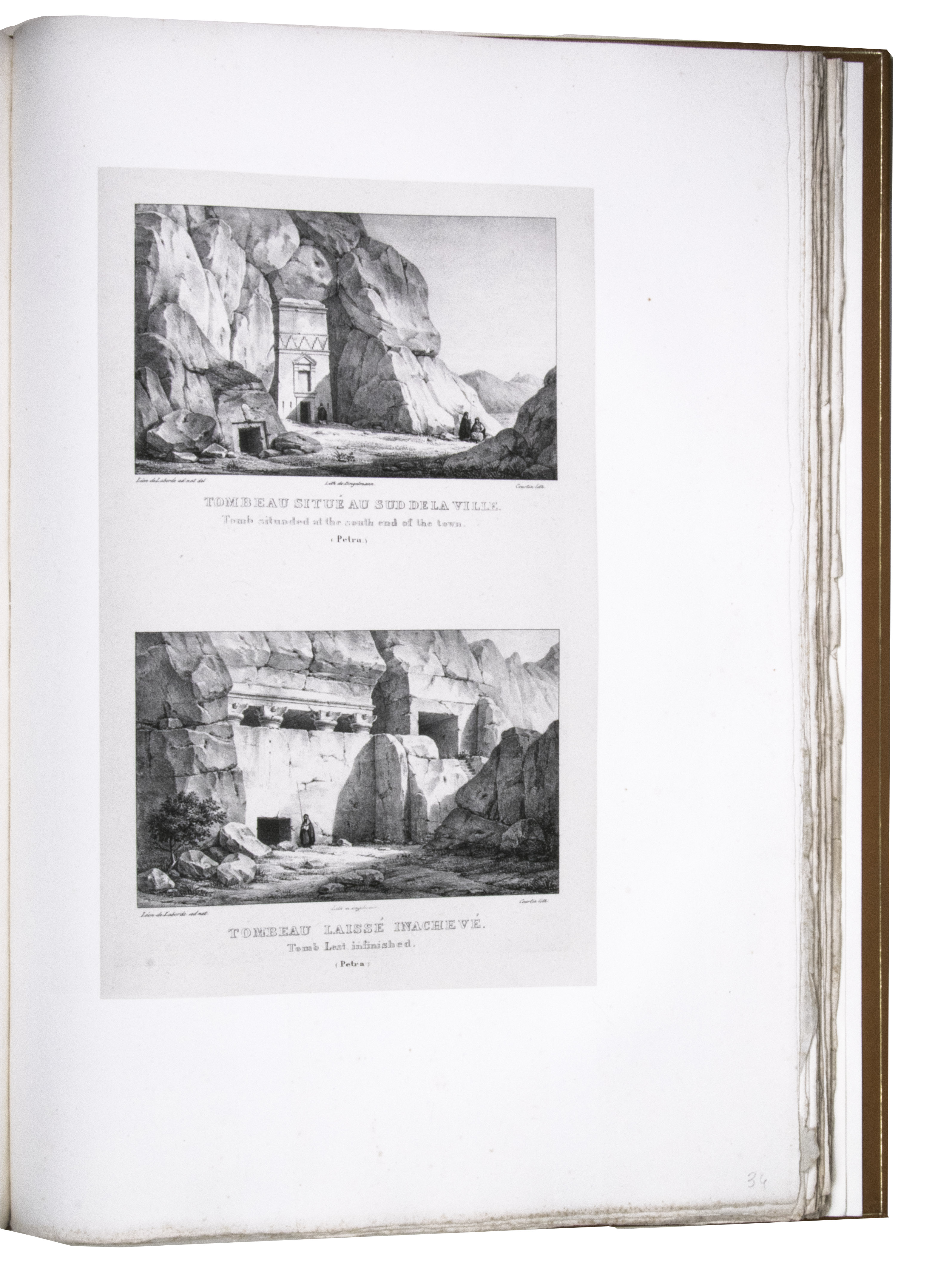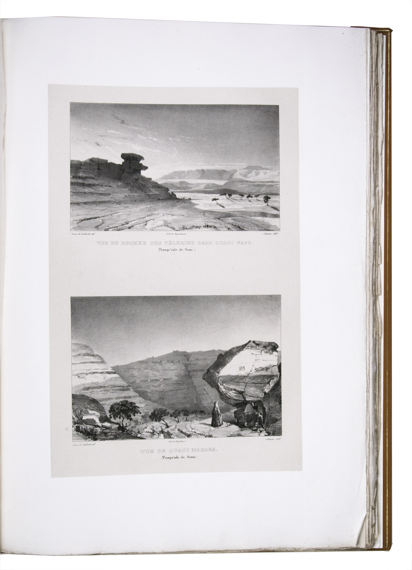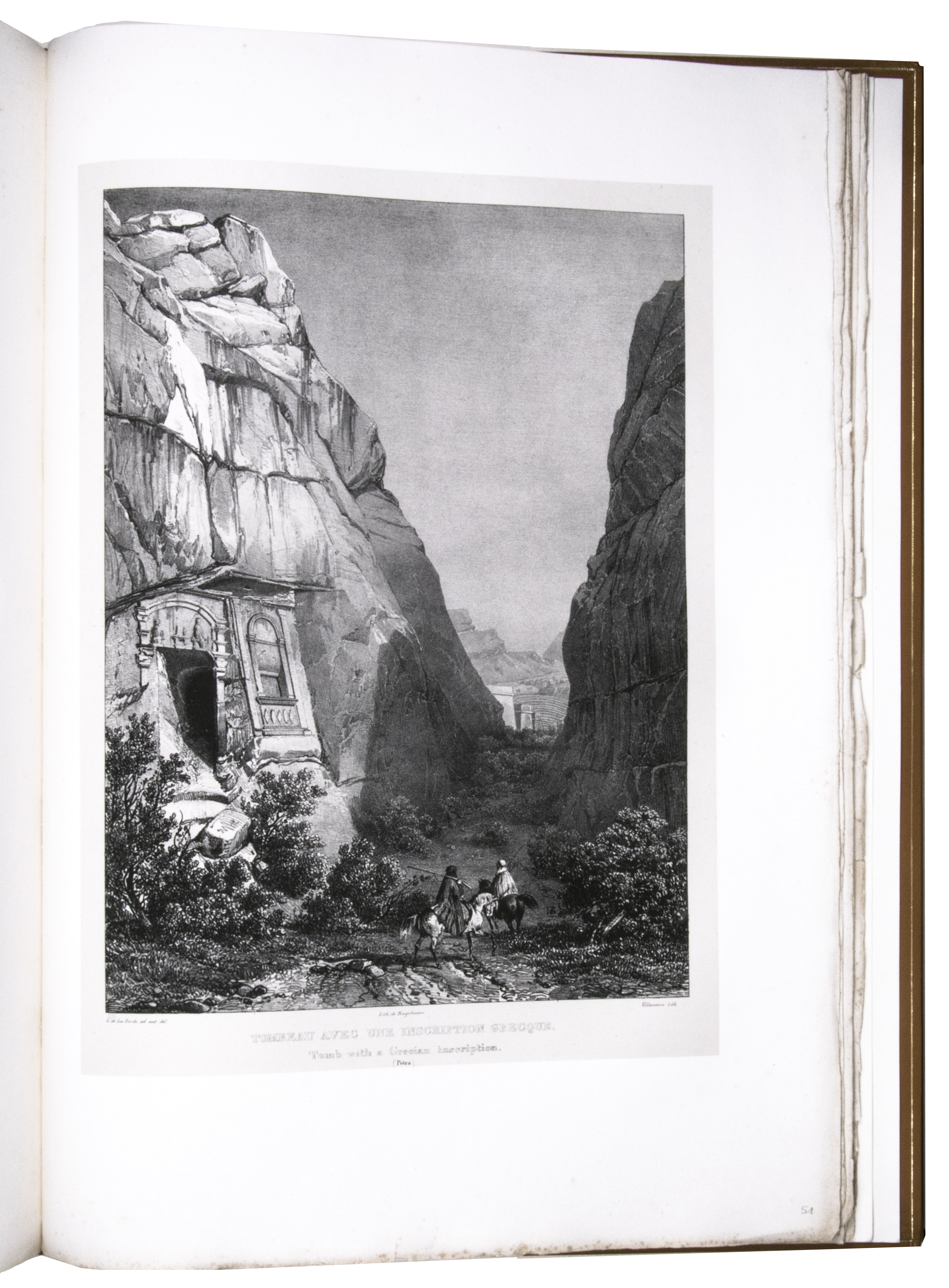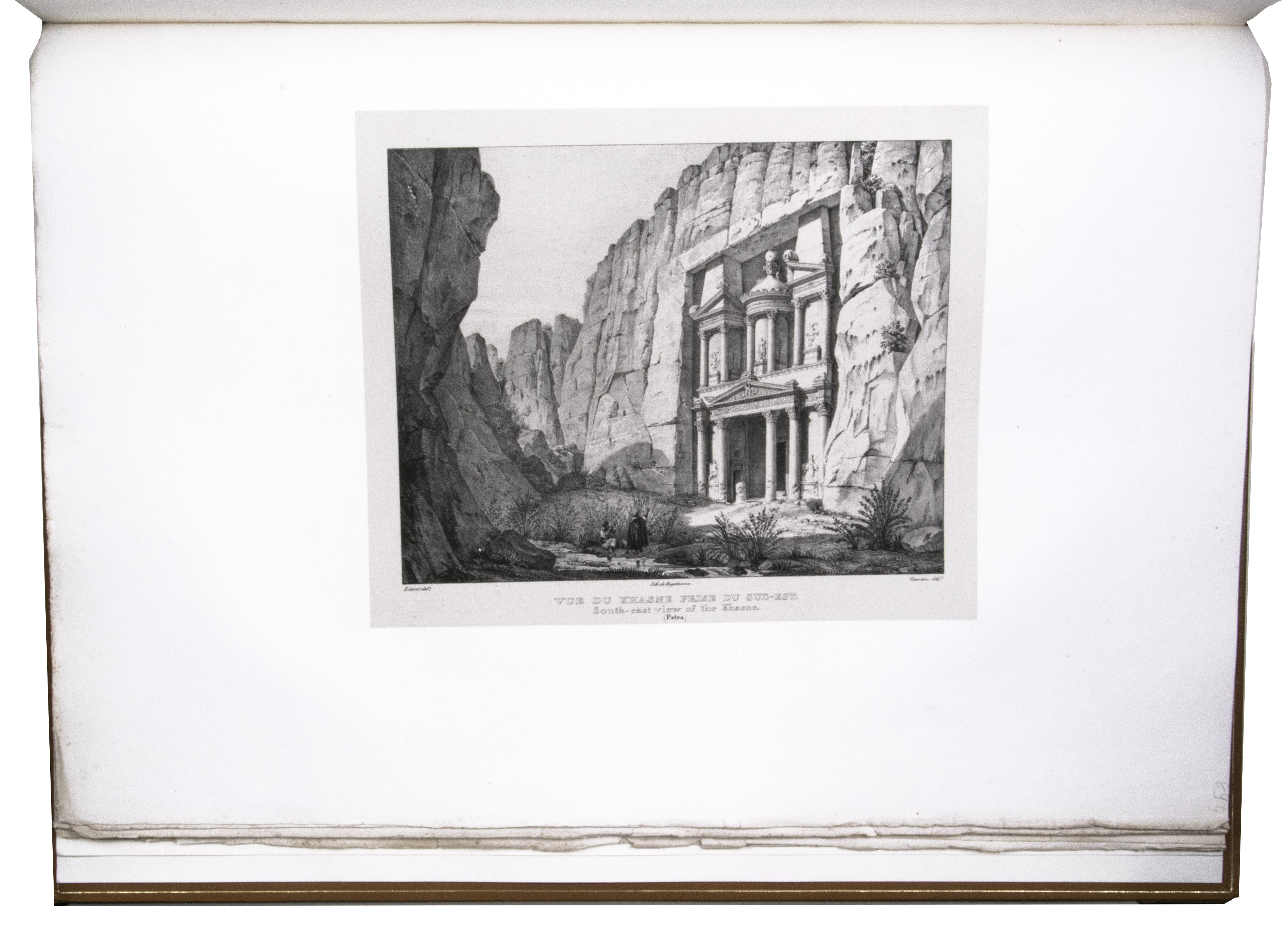 First edition of "an important work" (Blackmer) of a stunning and beautifully illustrated account of some of the earliest explorations in the Sinai, southern Jordan and northwest Arabia, complete with all the magnificent views in extremely large format, the double-page plates measuring about 58.5 x 83 cm and the folding map of the Sinai about 74 x 102 cm. All subsequent editions, including the English one, were published in octavo and contained only a few plates based on the present first edition, all in drastically reduced format. The plates show maps, plans of ancient sites, views of ruins and other buildings, coastal and other topographic views, costume plates, hieroglyphic and other inscriptions, flora and fauna. Laborde journeyed to the ancient city of Petra in what is now Jordan with the engineer Linant de Bellefonds in 1828, travelling from Suez via St. Catherine's and through Wadi al-Araba to Akabah. The topographic term Arabie Pétrée derives from Ptolemy's division of Arabia into three regions. The maps in the present book show it as the Sinai peninsula, the southern part of what is now Jordan and the northwestern part of the Arabian peninsula. The city of Petra itself is extensively documented in many of the present beautiful plates.
