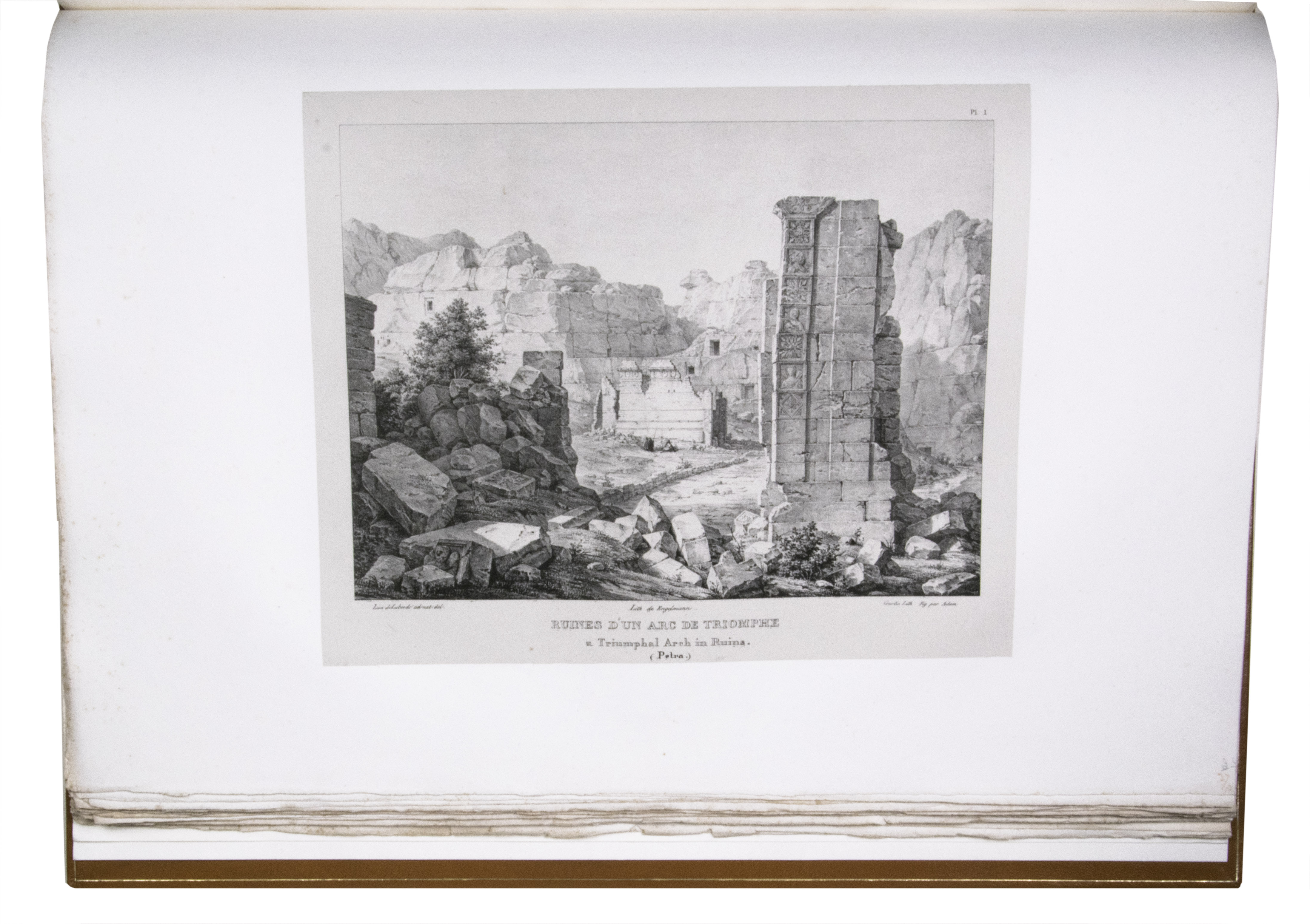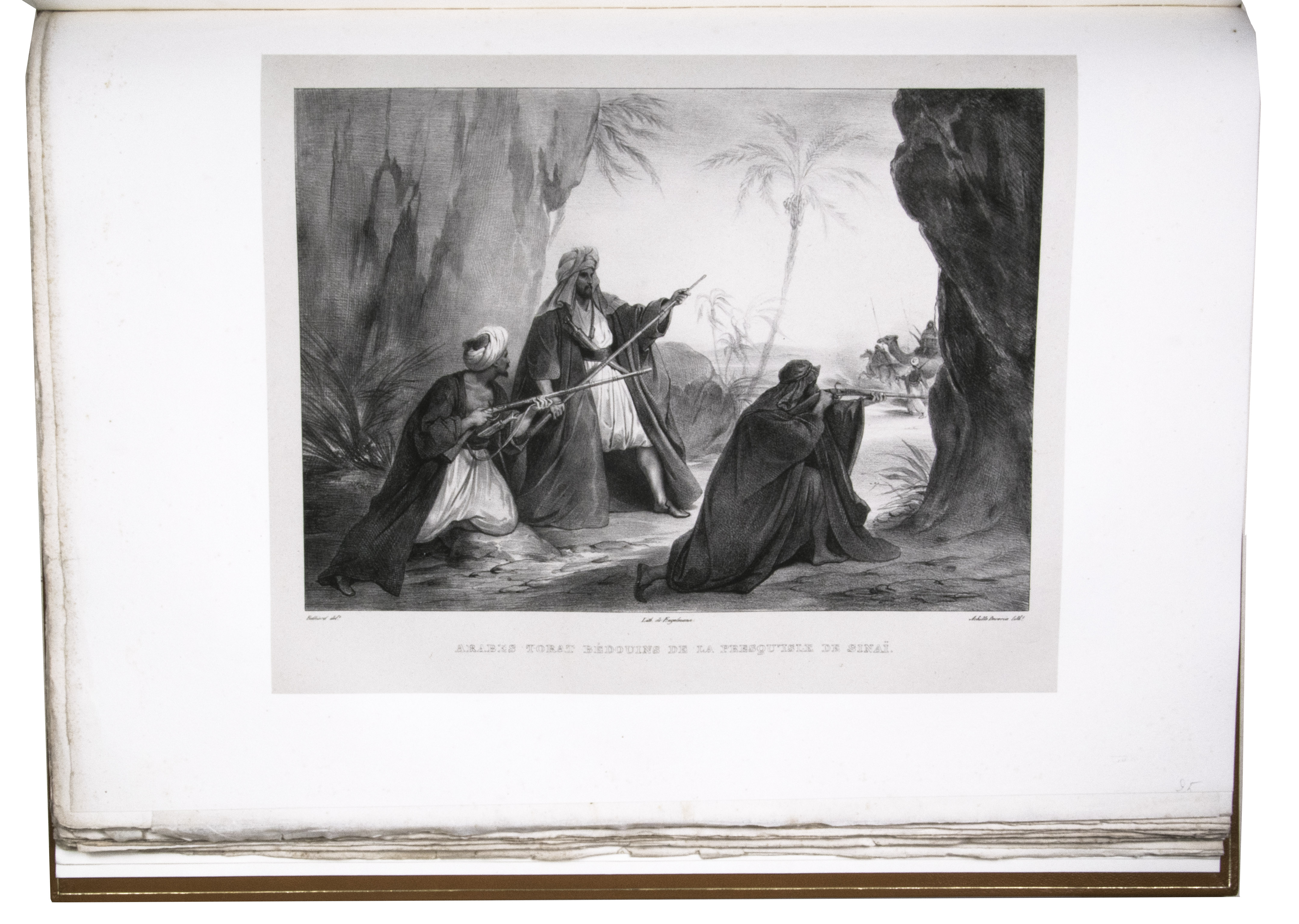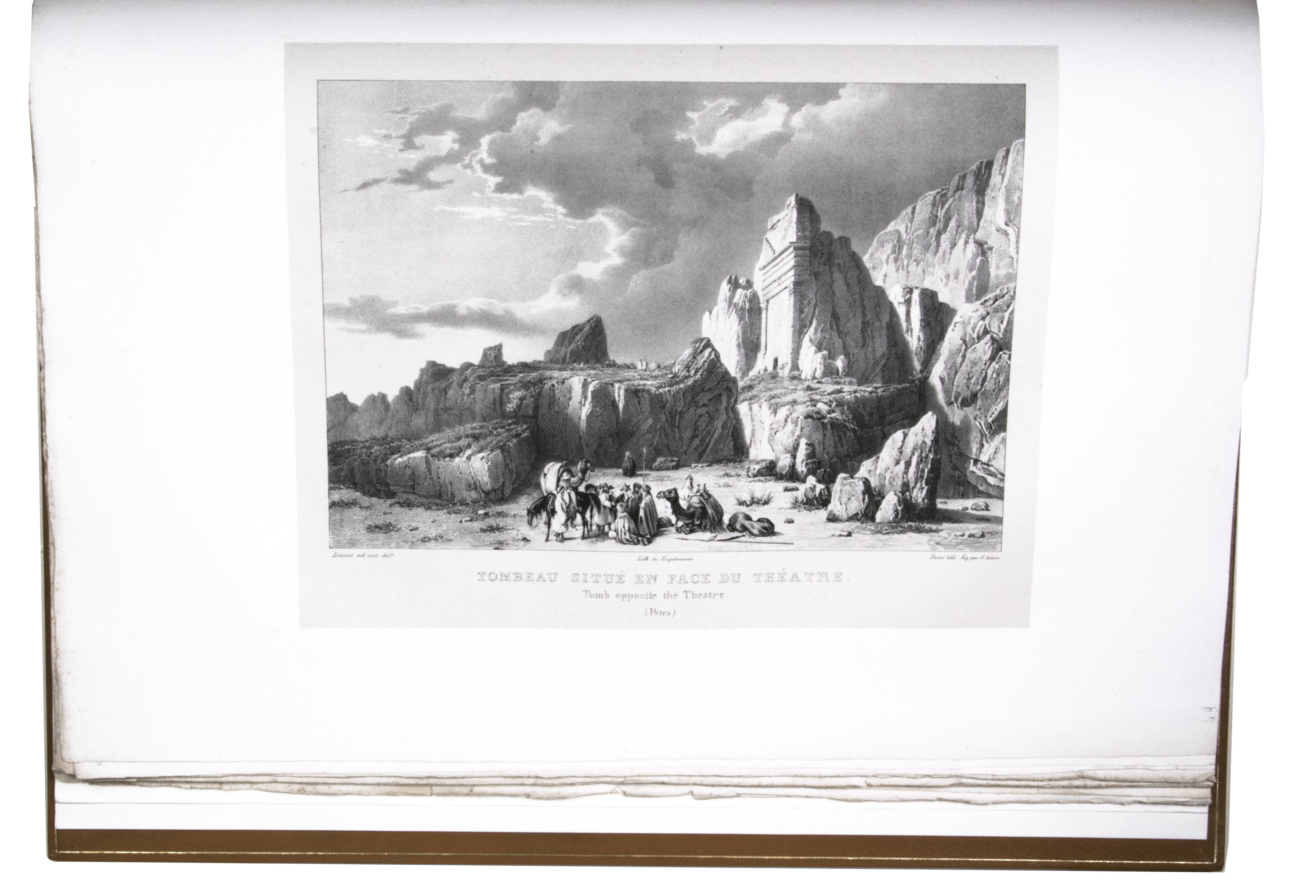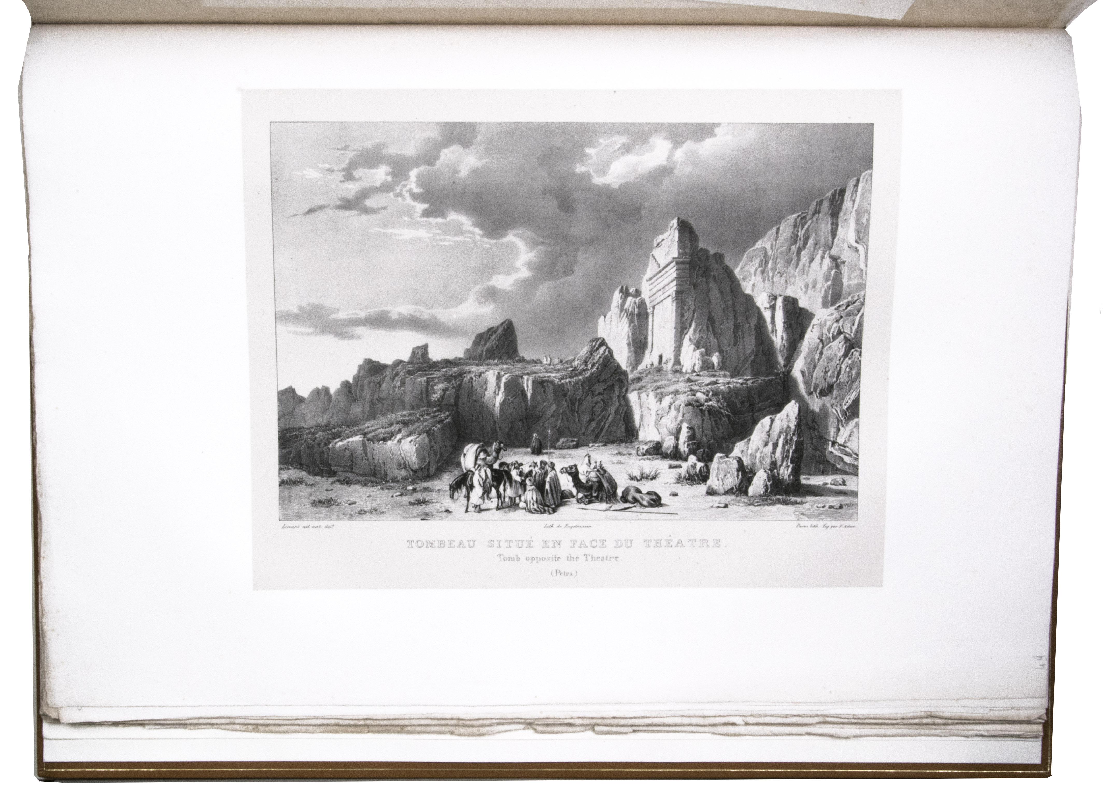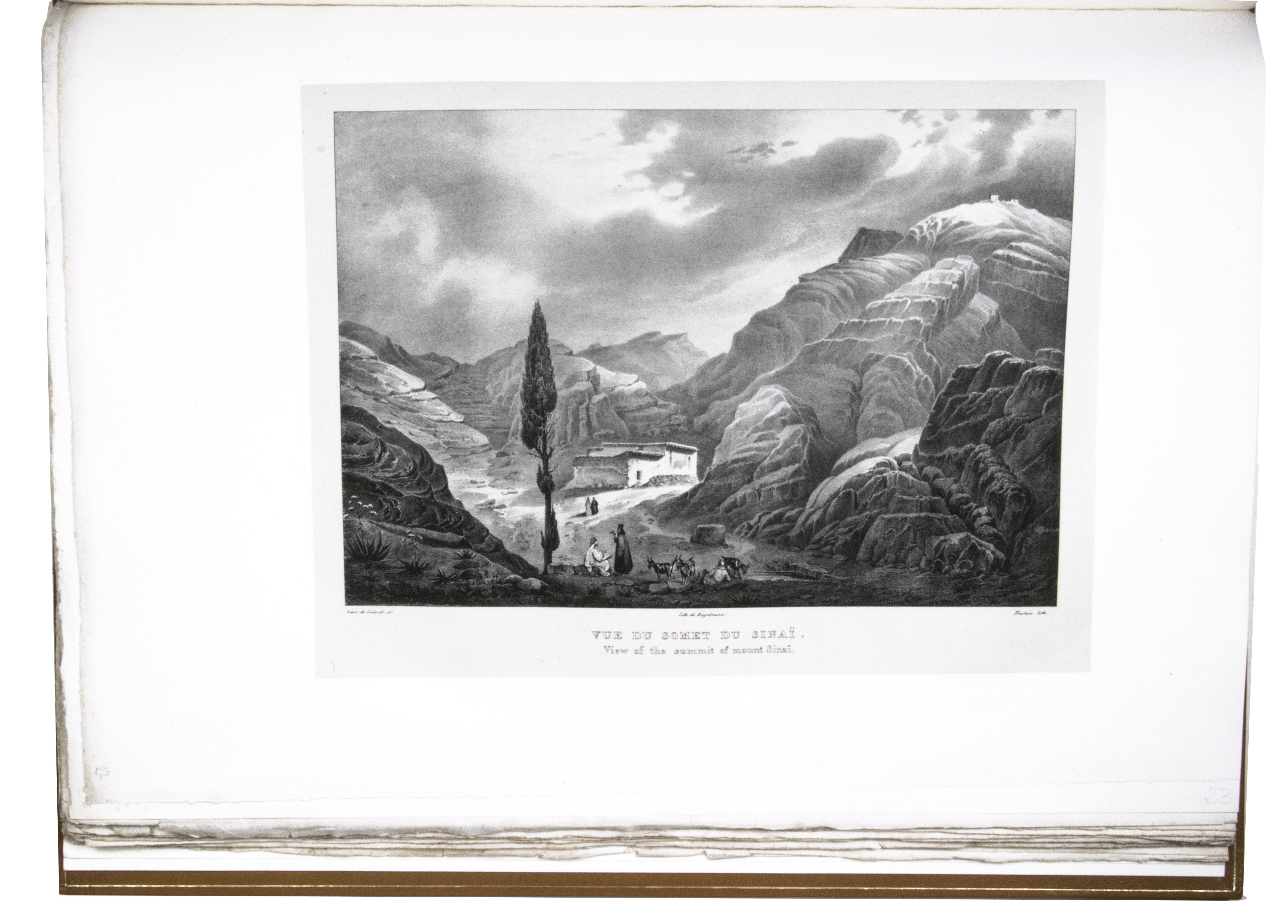 First edition of "an important work" (Blackmer) of a stunning and beautifully illustrated account of some of the earliest explorations in the Sinai, southern Jordan and northwest Arabia, complete with all the magnificent views in extremely large format, the double-page plates measuring about 58.5 x 83 cm and the folding map of the Sinai about 74 x 102 cm. All subsequent editions, including the English one, were published in octavo and contained only a few plates based on the present first edition, all in drastically reduced format. The plates show maps, plans of ancient sites, views of ruins and other buildings, coastal and other topographic views, costume plates, hieroglyphic and other inscriptions, flora and fauna. Laborde journeyed to the ancient city of Petra in what is now Jordan with the engineer Linant de Bellefonds in 1828, travelling from Suez via St. Catherine's and through Wadi al-Araba to Akabah. The topographic term Arabie Pétrée derives from Ptolemy's division of Arabia into three regions. The maps in the present book show it as the Sinai peninsula, the southern part of what is now Jordan and the northwestern part of the Arabian peninsula. The city of Petra itself is extensively documented in many of the present beautiful plates.