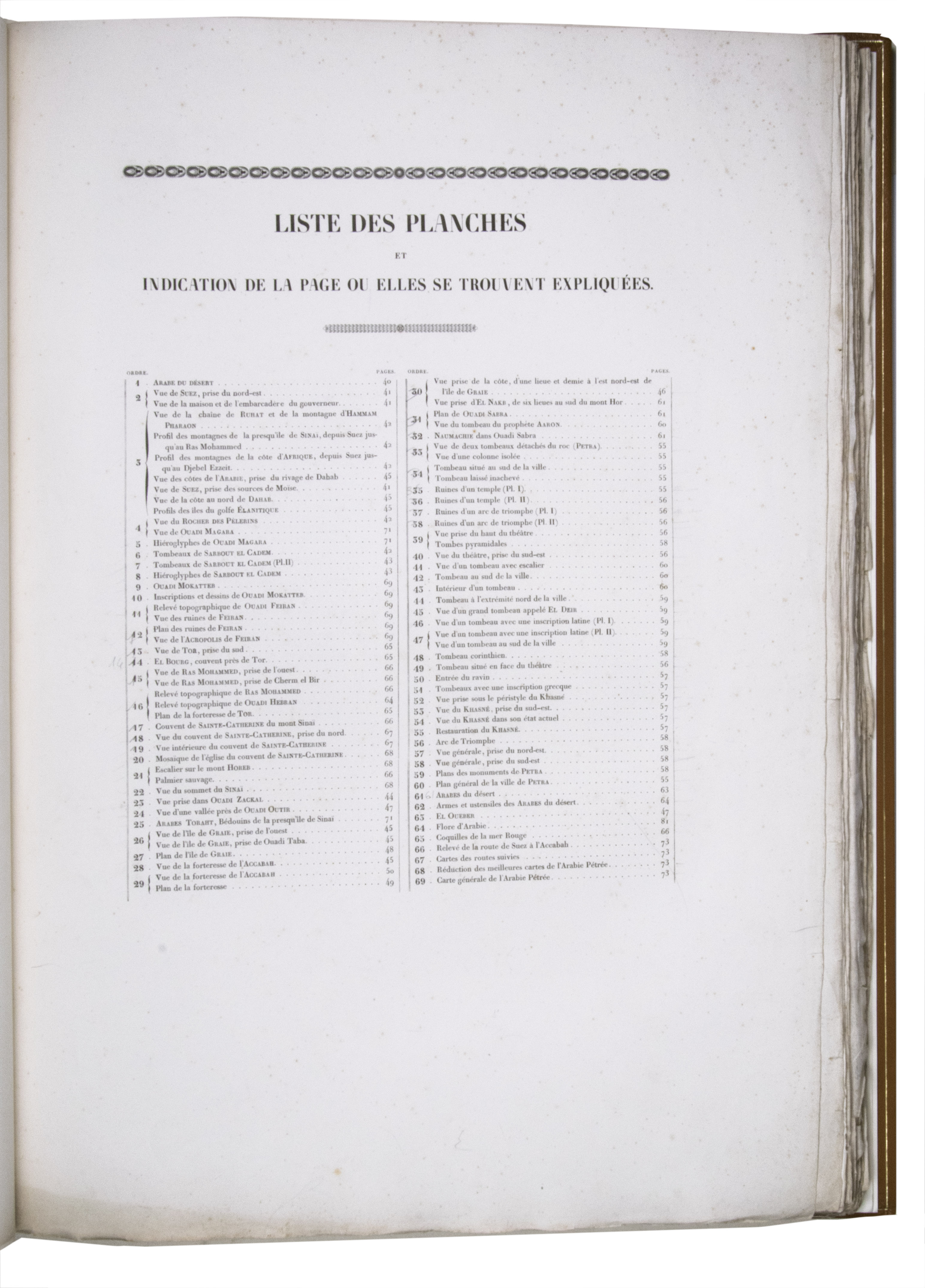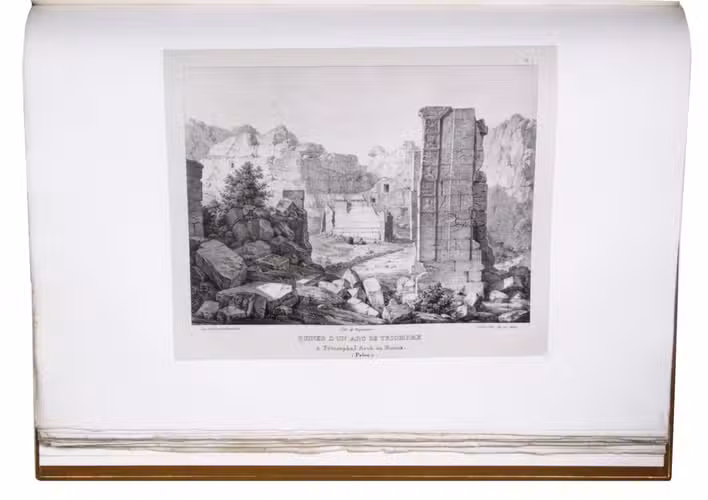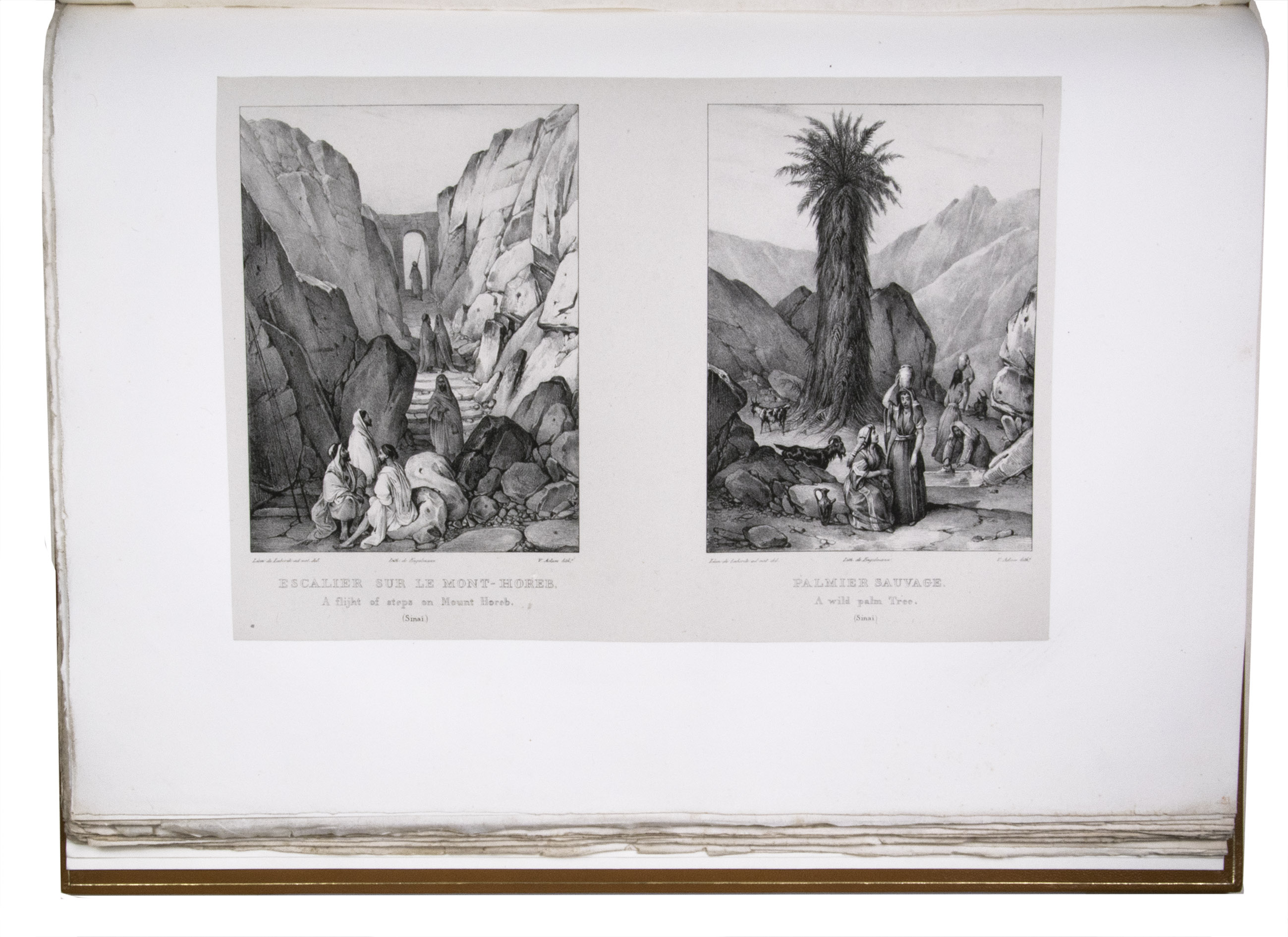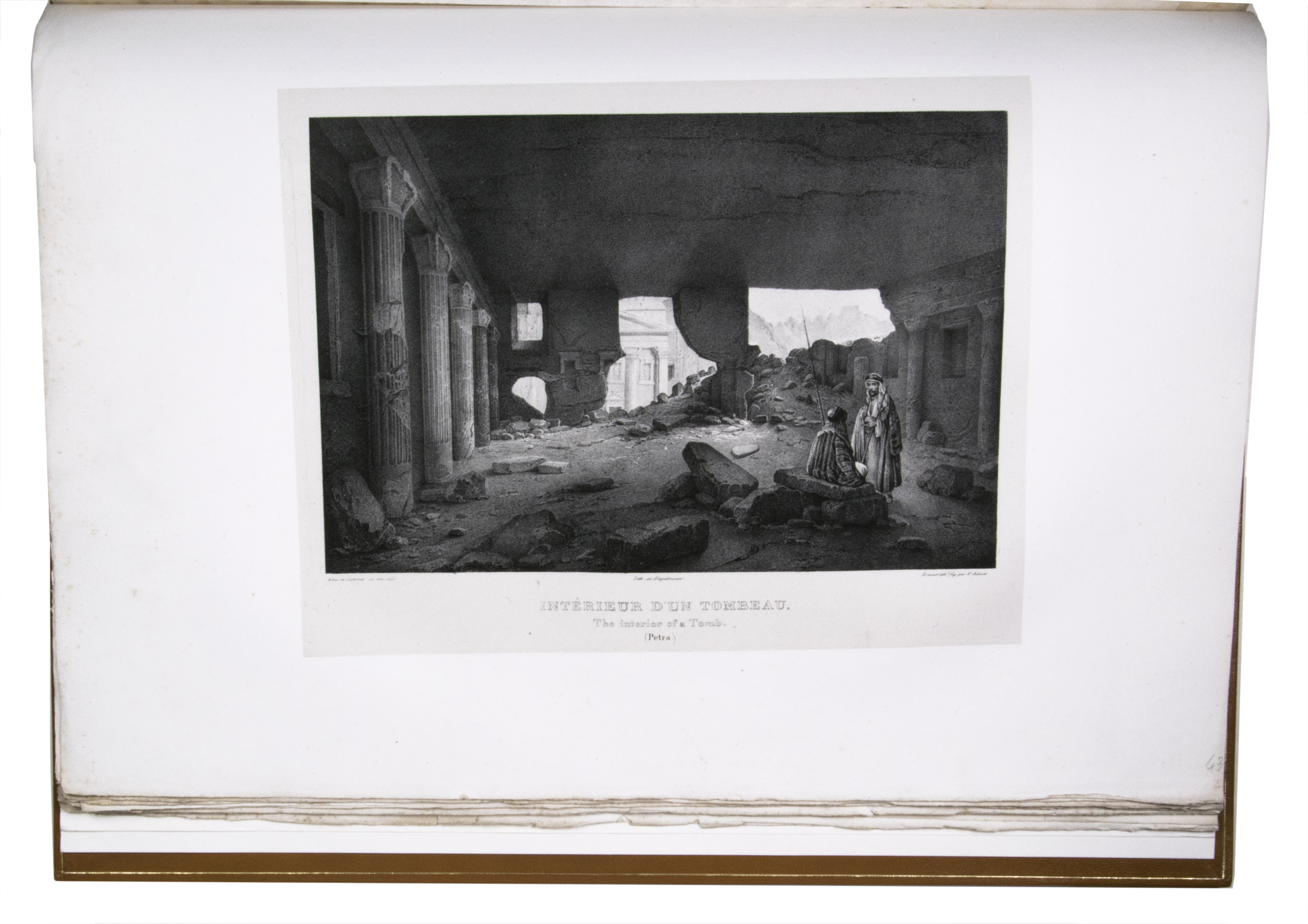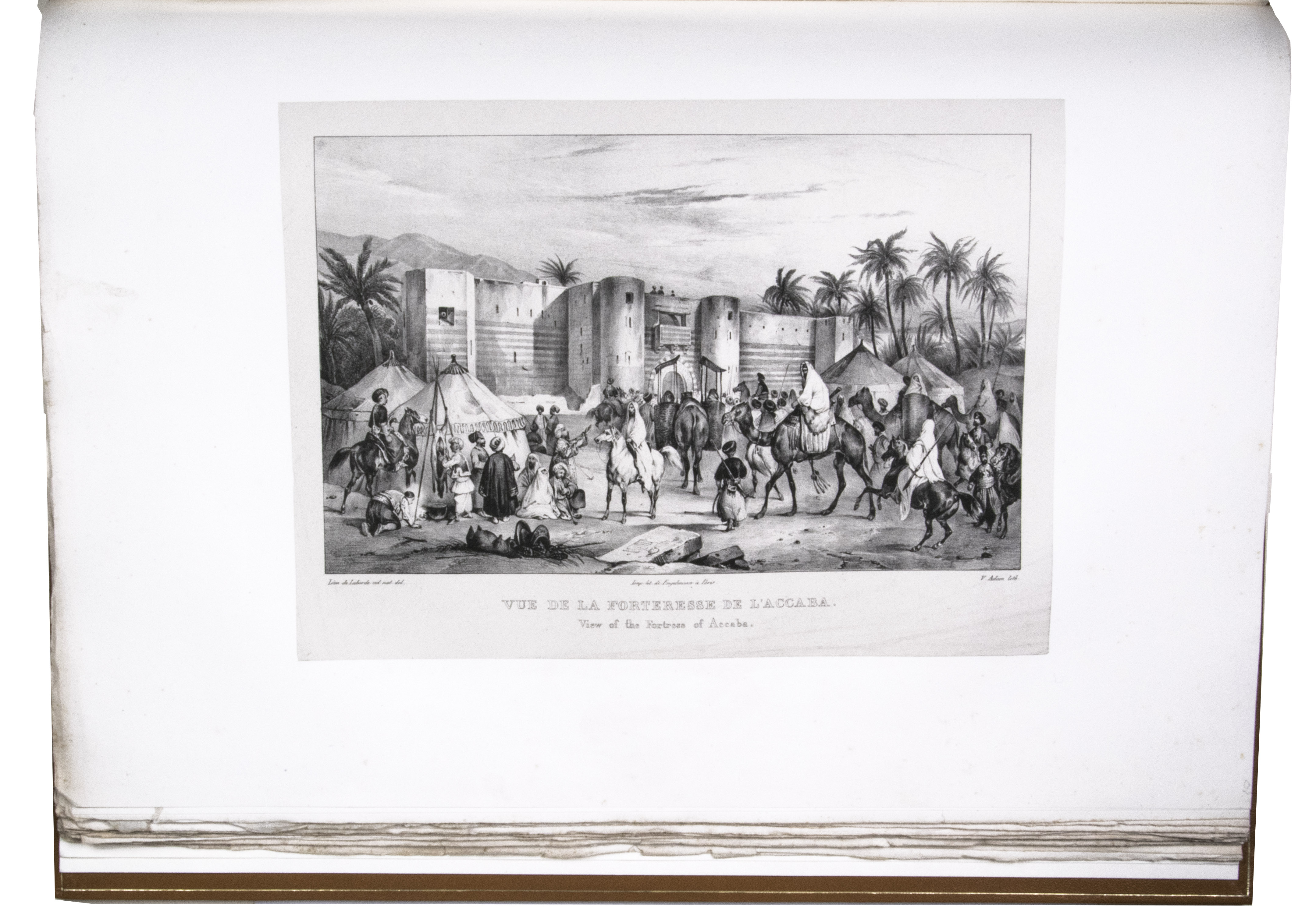 First edition of "an important work" (Blackmer) of a stunning and beautifully illustrated account of some of the earliest explorations in the Sinai, southern Jordan and northwest Arabia, complete with all the magnificent views in extremely large format, the double-page plates measuring about 58.5 x 83 cm and the folding map of the Sinai about 74 x 102 cm. All subsequent editions, including the English one, were published in octavo and contained only a few plates based on the present first edition, all in drastically reduced format. The plates show maps, plans of ancient sites, views of ruins and other buildings, coastal and other topographic views, costume plates, hieroglyphic and other inscriptions, flora and fauna. Laborde journeyed to the ancient city of Petra in what is now Jordan with the engineer Linant de Bellefonds in 1828, travelling from Suez via St. Catherine's and through Wadi al-Araba to Akabah. The topographic term Arabie Pétrée derives from Ptolemy's division of Arabia into three regions. The maps in the present book show it as the Sinai peninsula, the southern part of what is now Jordan and the northwestern part of the Arabian peninsula. The city of Petra itself is extensively documented in many of the present beautiful plates.