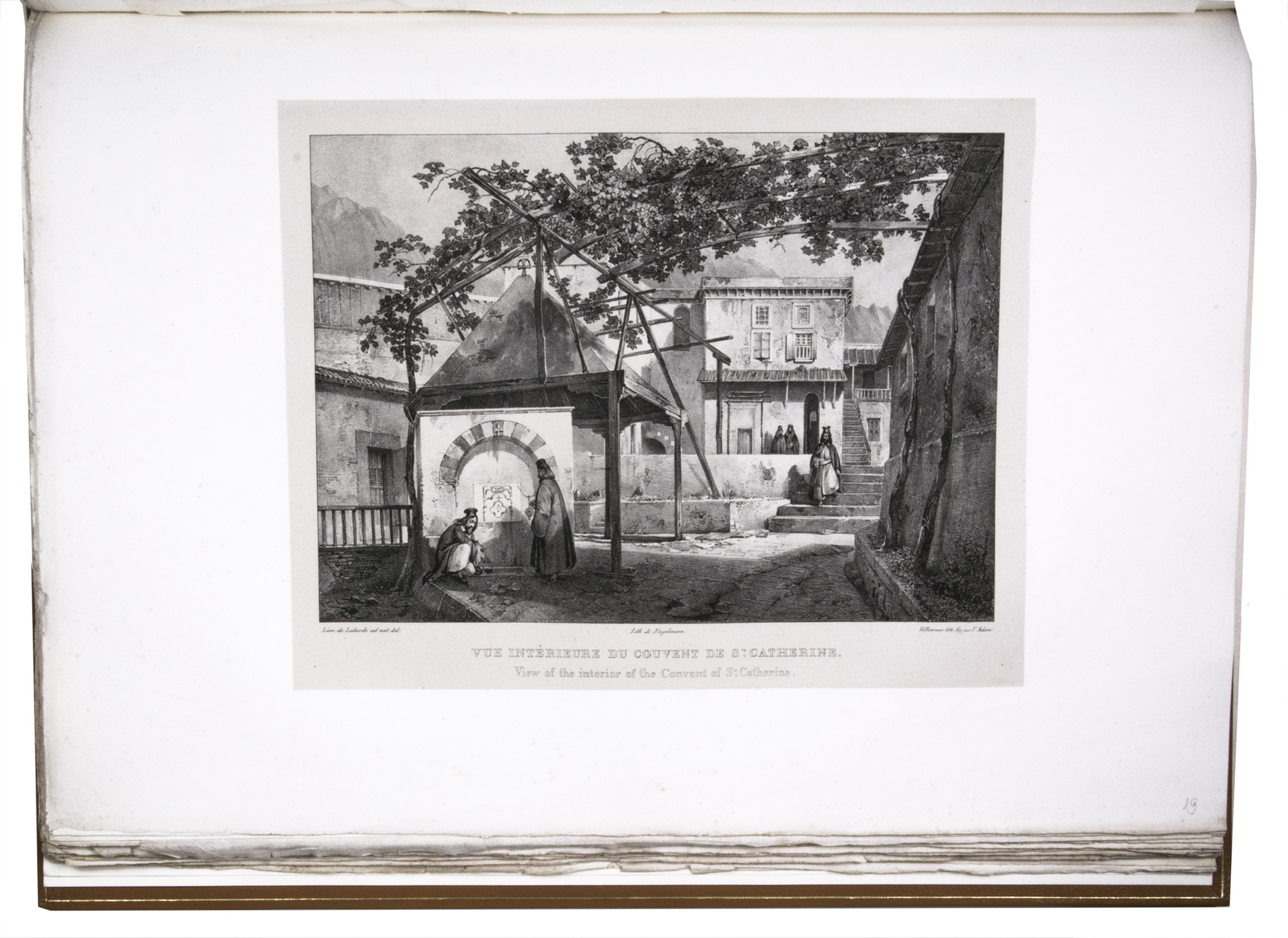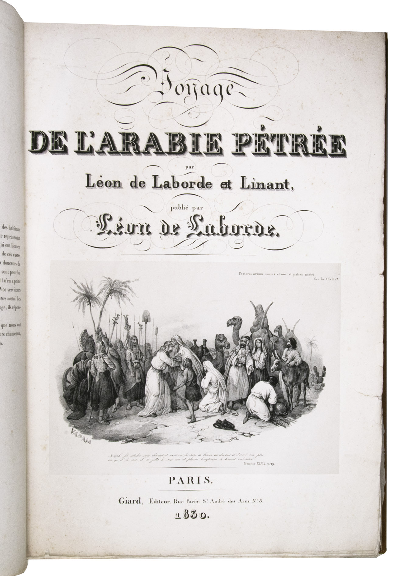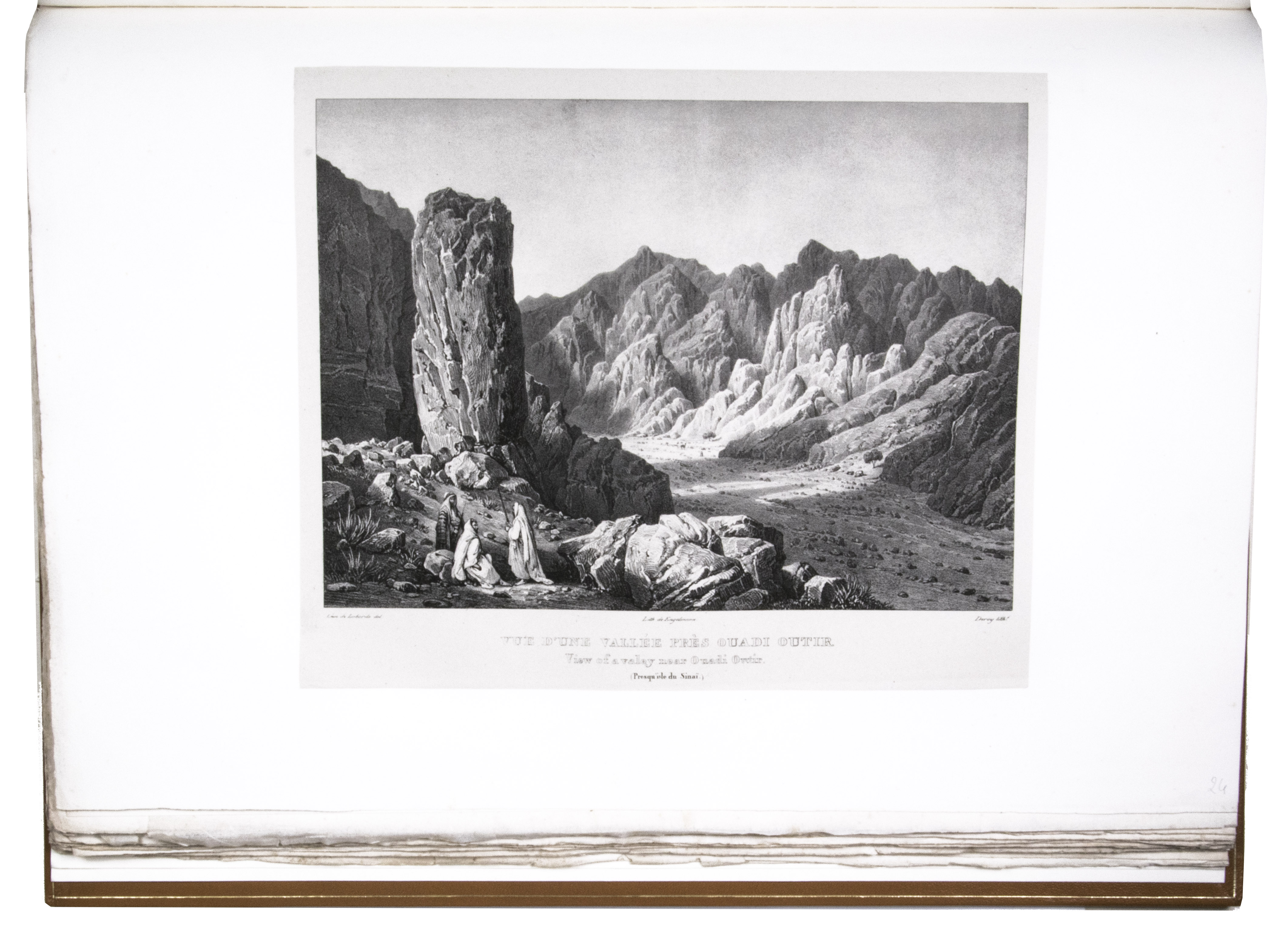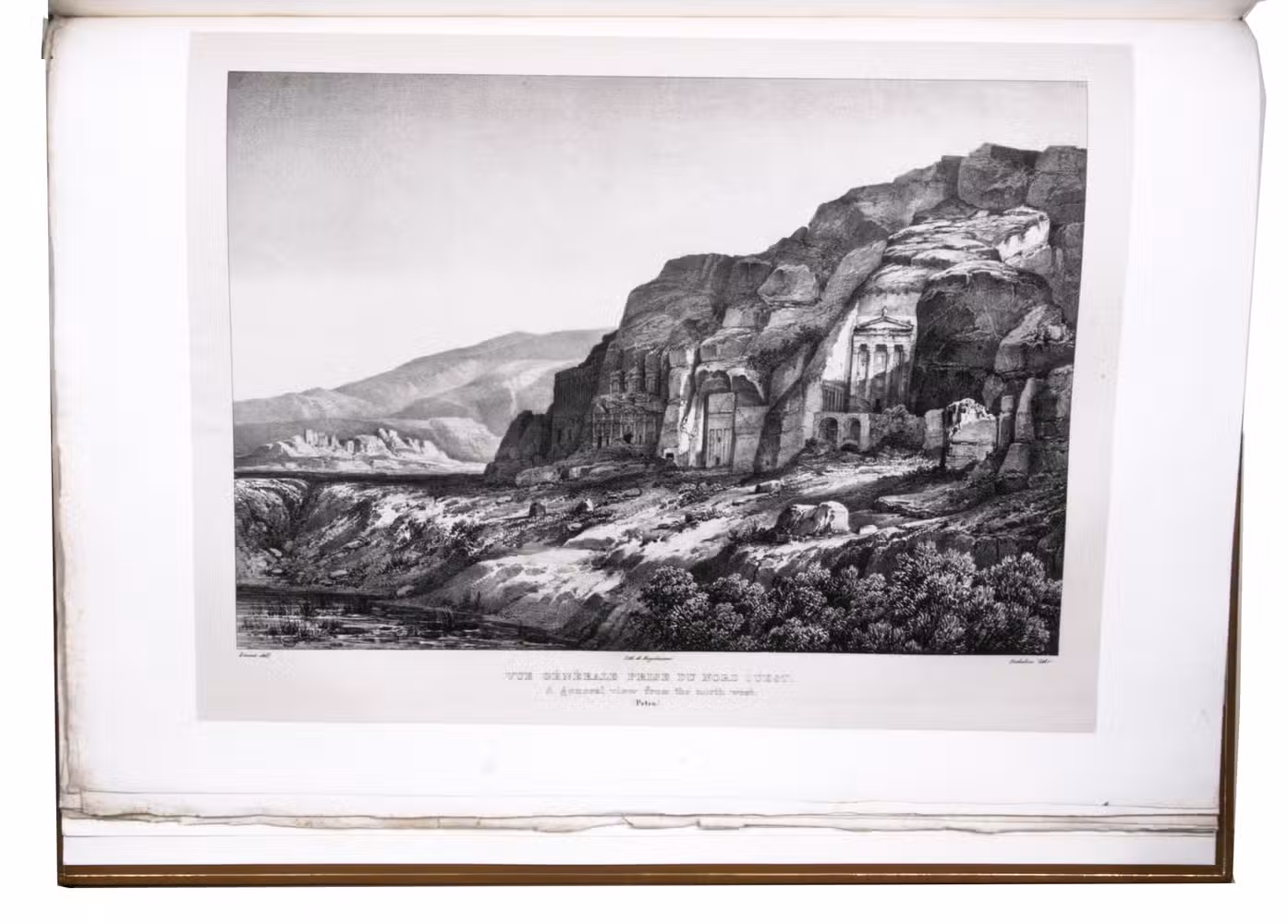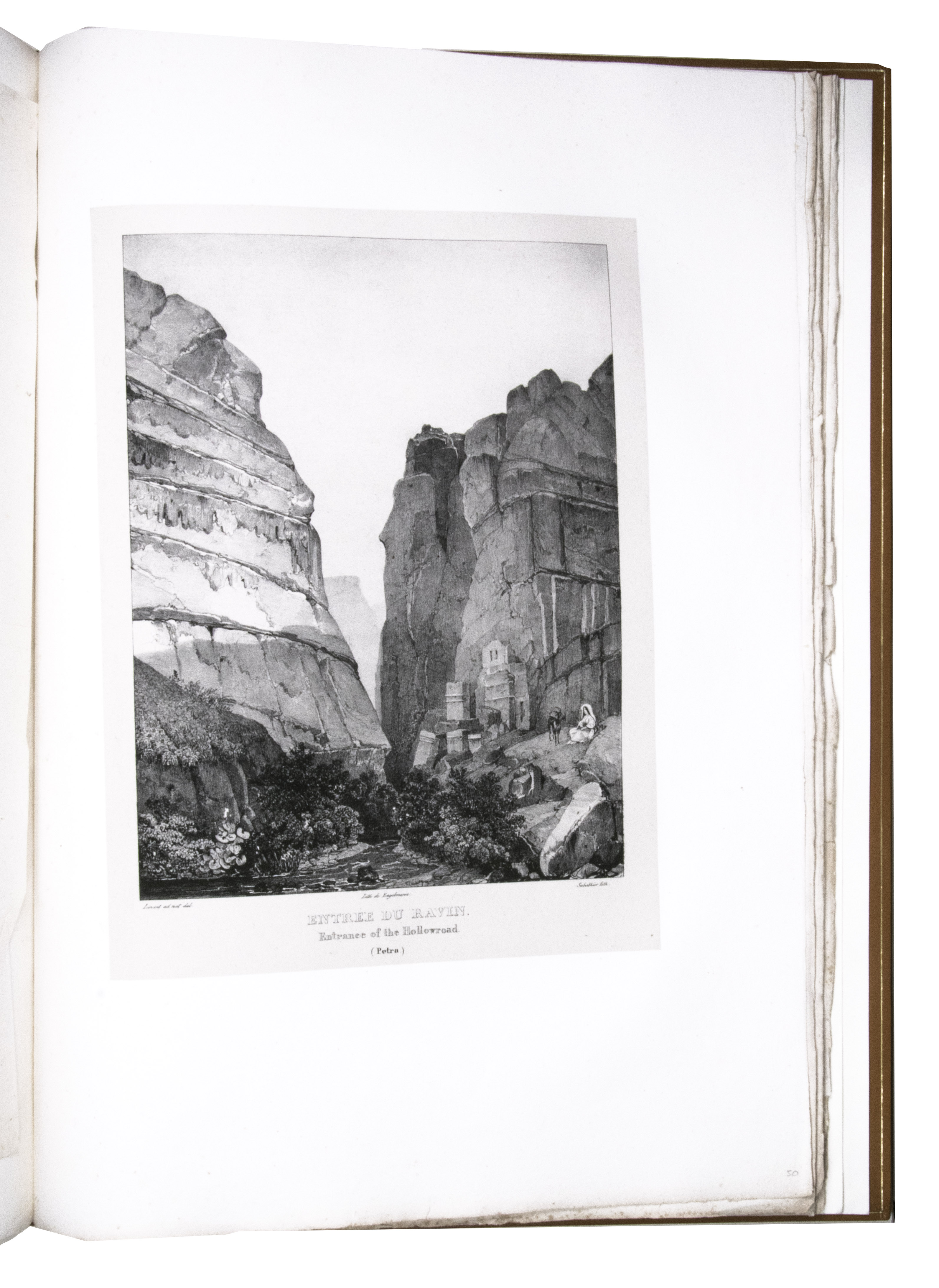 First edition of "an important work" (Blackmer) of a stunning and beautifully illustrated account of some of the earliest explorations in the Sinai, southern Jordan and northwest Arabia, complete with all the magnificent views in extremely large format, the double-page plates measuring about 58.5 x 83 cm and the folding map of the Sinai about 74 x 102 cm. All subsequent editions, including the English one, were published in octavo and contained only a few plates based on the present first edition, all in drastically reduced format. The plates show maps, plans of ancient sites, views of ruins and other buildings, coastal and other topographic views, costume plates, hieroglyphic and other inscriptions, flora and fauna. Laborde journeyed to the ancient city of Petra in what is now Jordan with the engineer Linant de Bellefonds in 1828, travelling from Suez via St. Catherine's and through Wadi al-Araba to Akabah. The topographic term Arabie Pétrée derives from Ptolemy's division of Arabia into three regions. The maps in the present book show it as the Sinai peninsula, the southern part of what is now Jordan and the northwestern part of the Arabian peninsula. The city of Petra itself is extensively documented in many of the present beautiful plates.