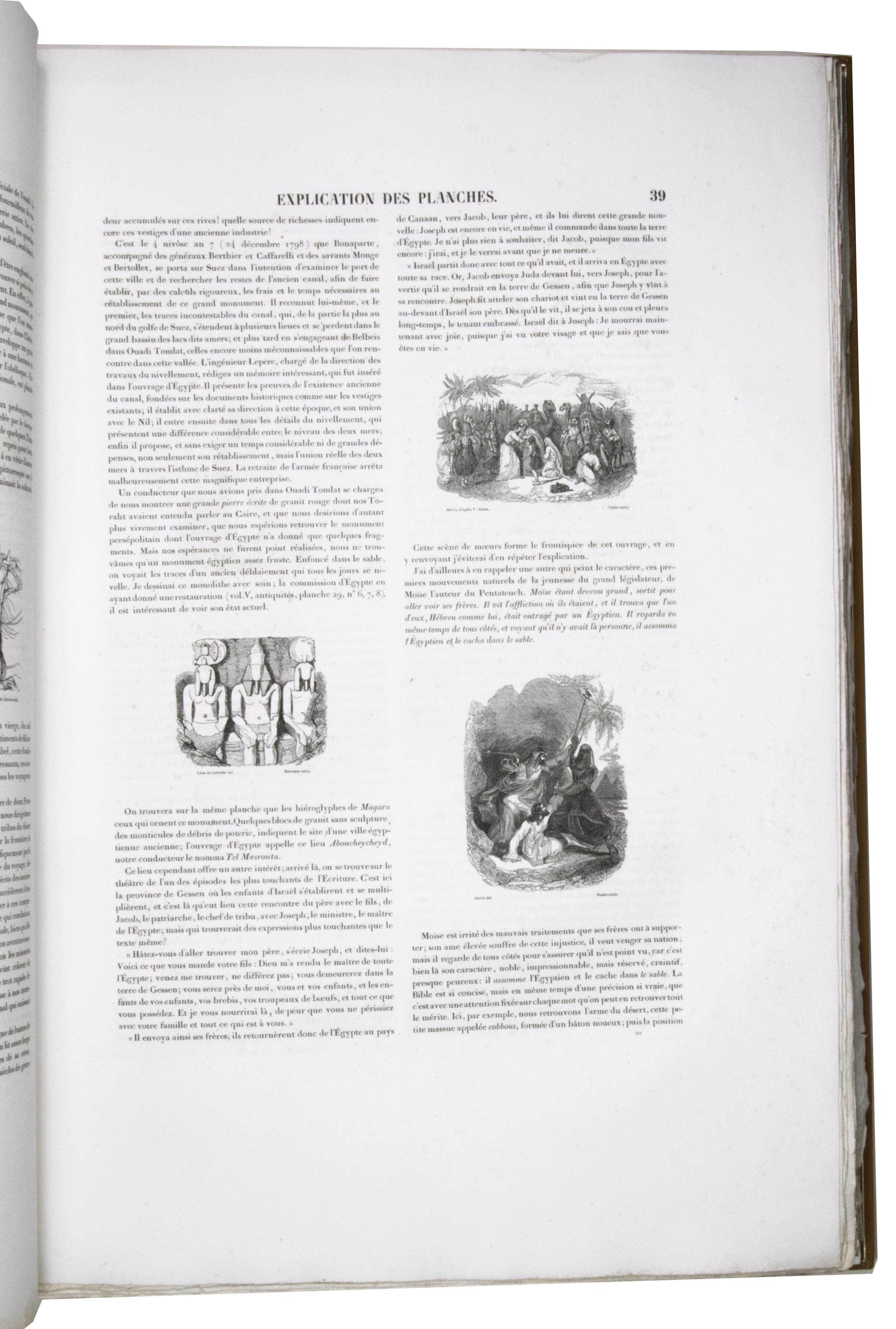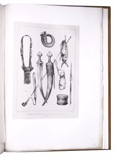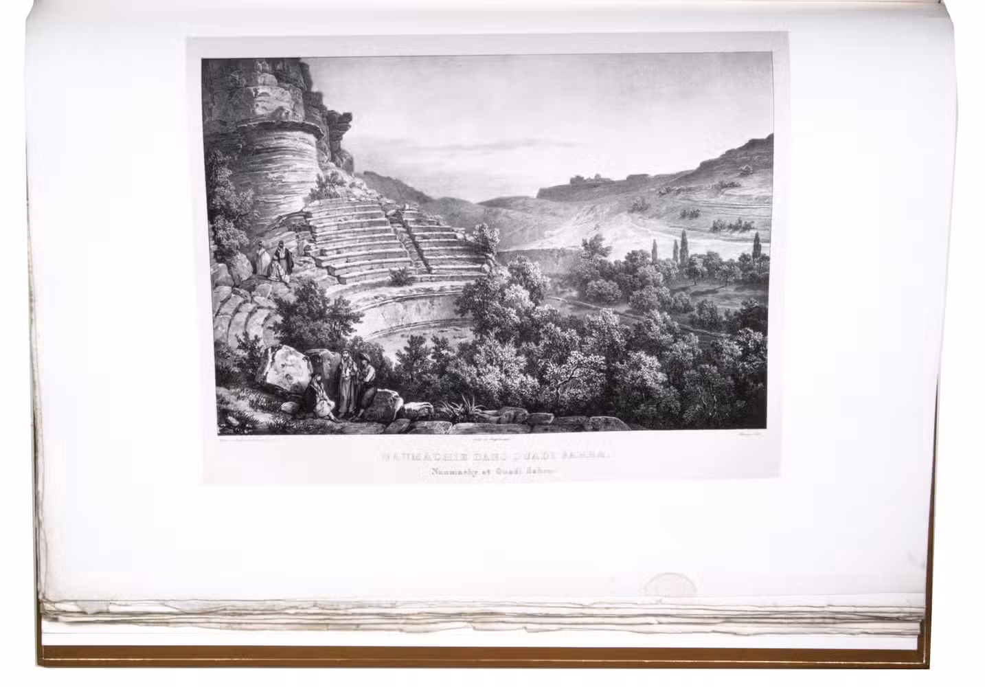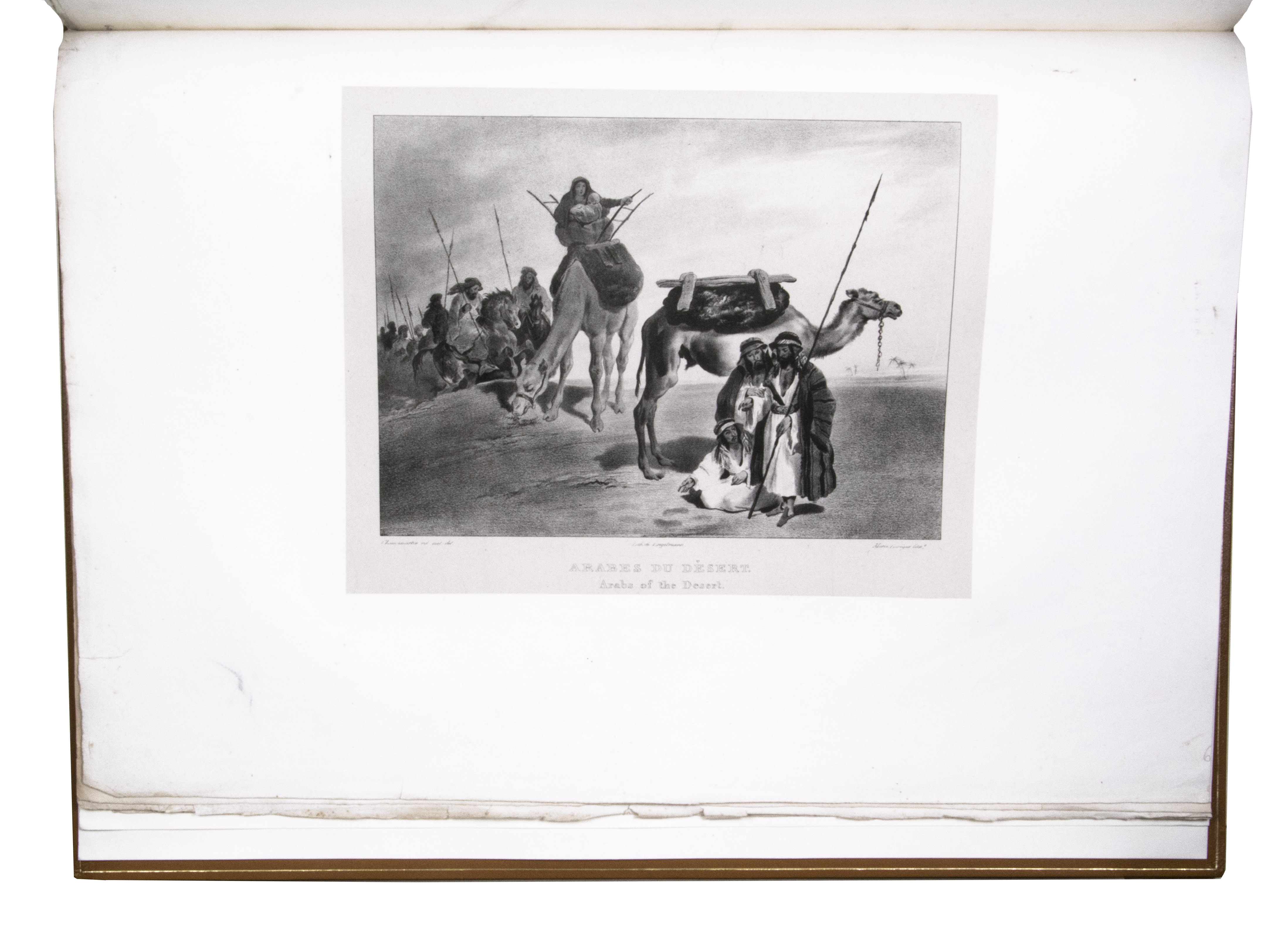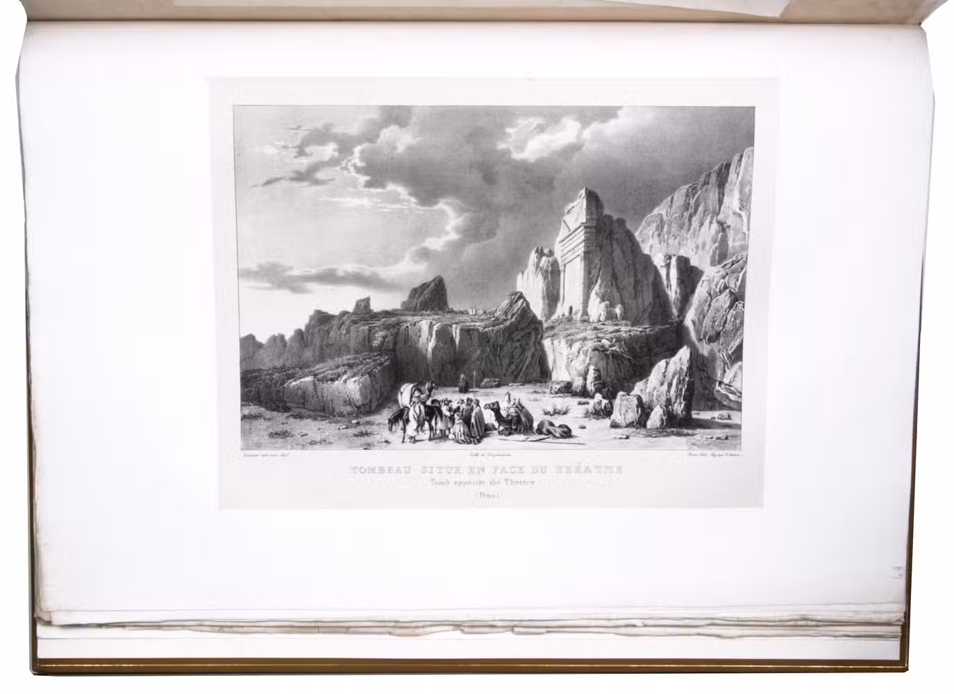 First edition of "an important work" (Blackmer) of a stunning and beautifully illustrated account of some of the earliest explorations in the Sinai, southern Jordan and northwest Arabia, complete with all the magnificent views in extremely large format, the double-page plates measuring about 58.5 x 83 cm and the folding map of the Sinai about 74 x 102 cm. All subsequent editions, including the English one, were published in octavo and contained only a few plates based on the present first edition, all in drastically reduced format. The plates show maps, plans of ancient sites, views of ruins and other buildings, coastal and other topographic views, costume plates, hieroglyphic and other inscriptions, flora and fauna. Laborde journeyed to the ancient city of Petra in what is now Jordan with the engineer Linant de Bellefonds in 1828, travelling from Suez via St. Catherine's and through Wadi al-Araba to Akabah. The topographic term Arabie Pétrée derives from Ptolemy's division of Arabia into three regions. The maps in the present book show it as the Sinai peninsula, the southern part of what is now Jordan and the northwestern part of the Arabian peninsula. The city of Petra itself is extensively documented in many of the present beautiful plates.