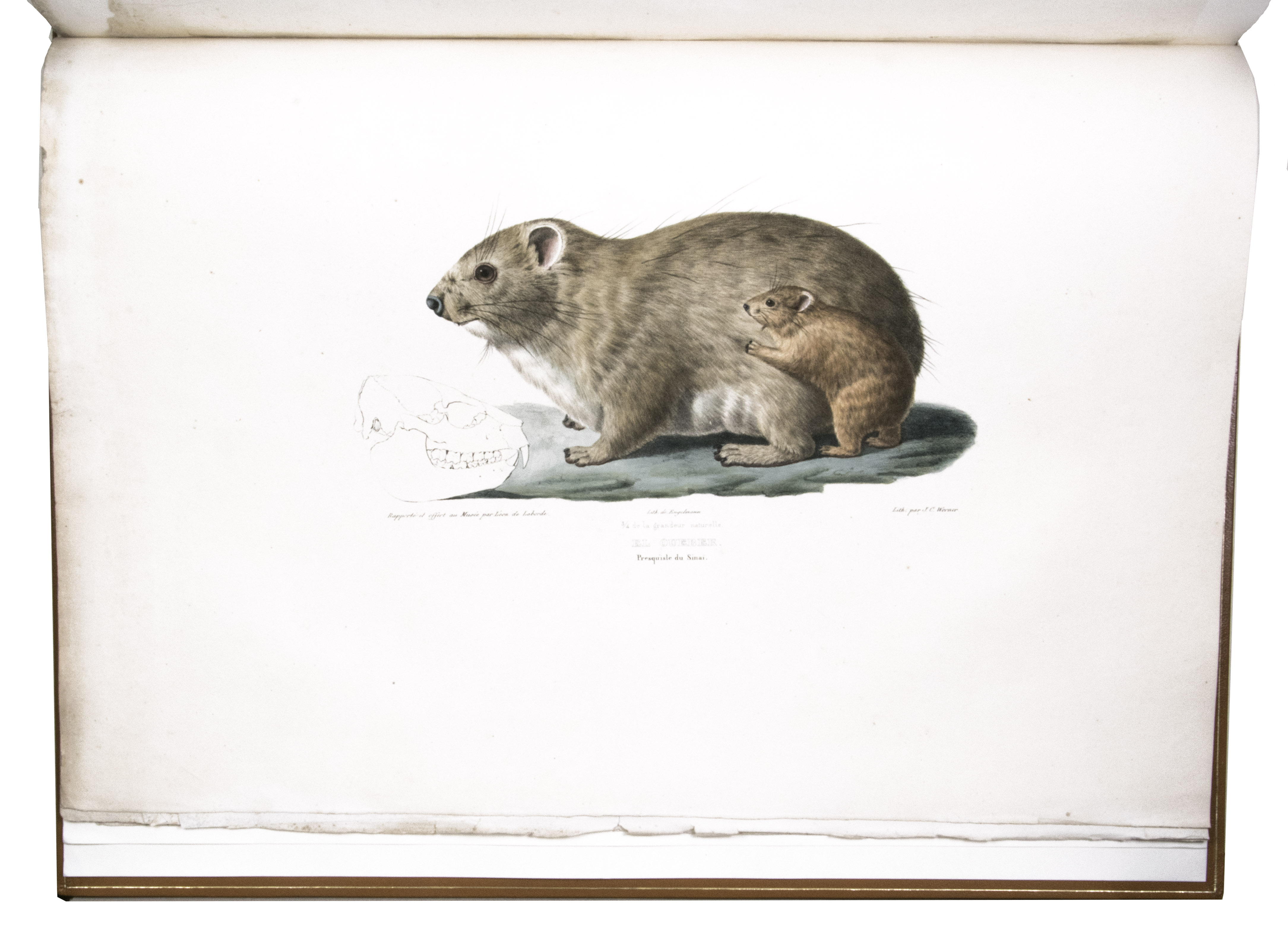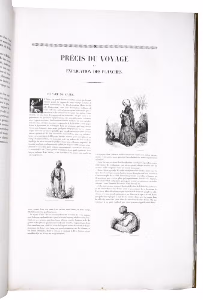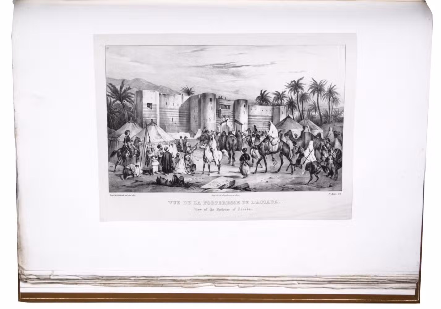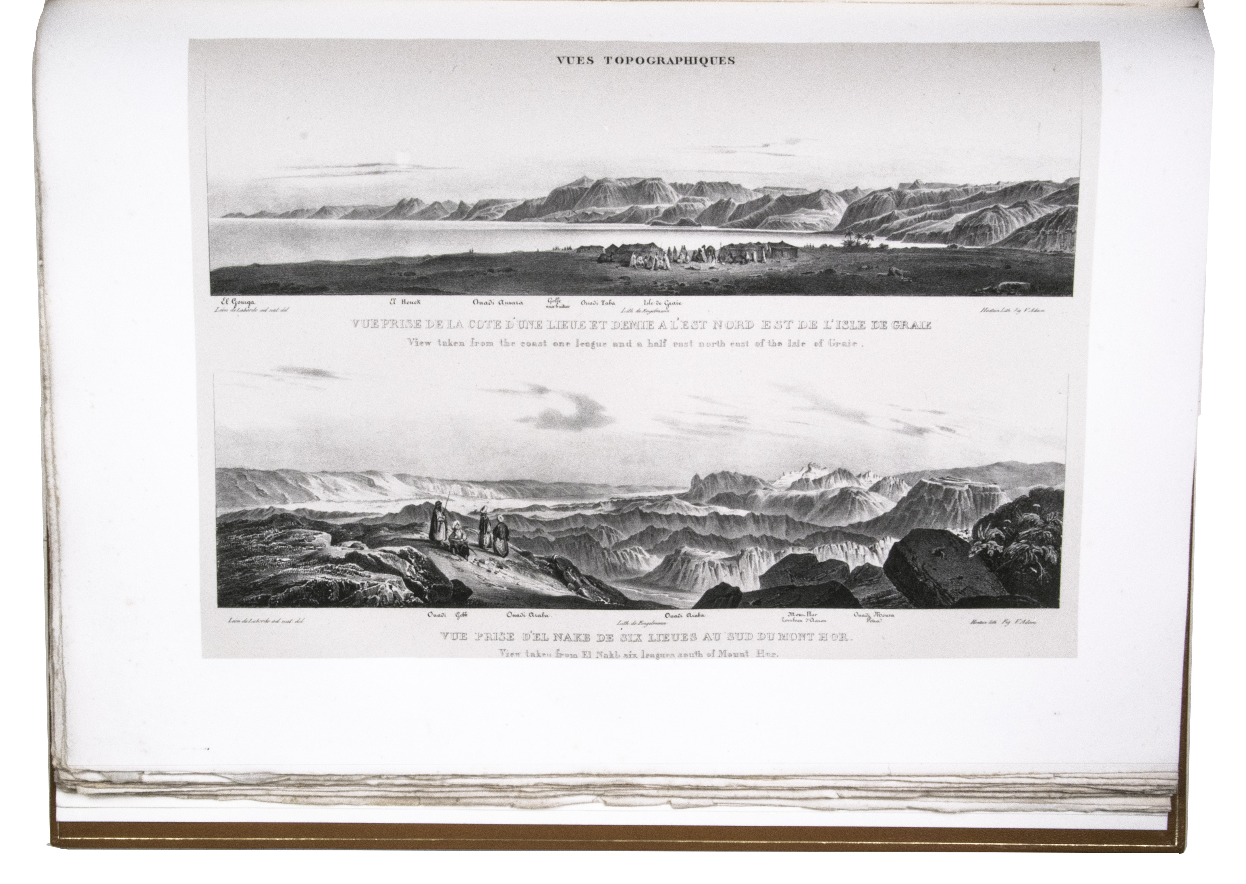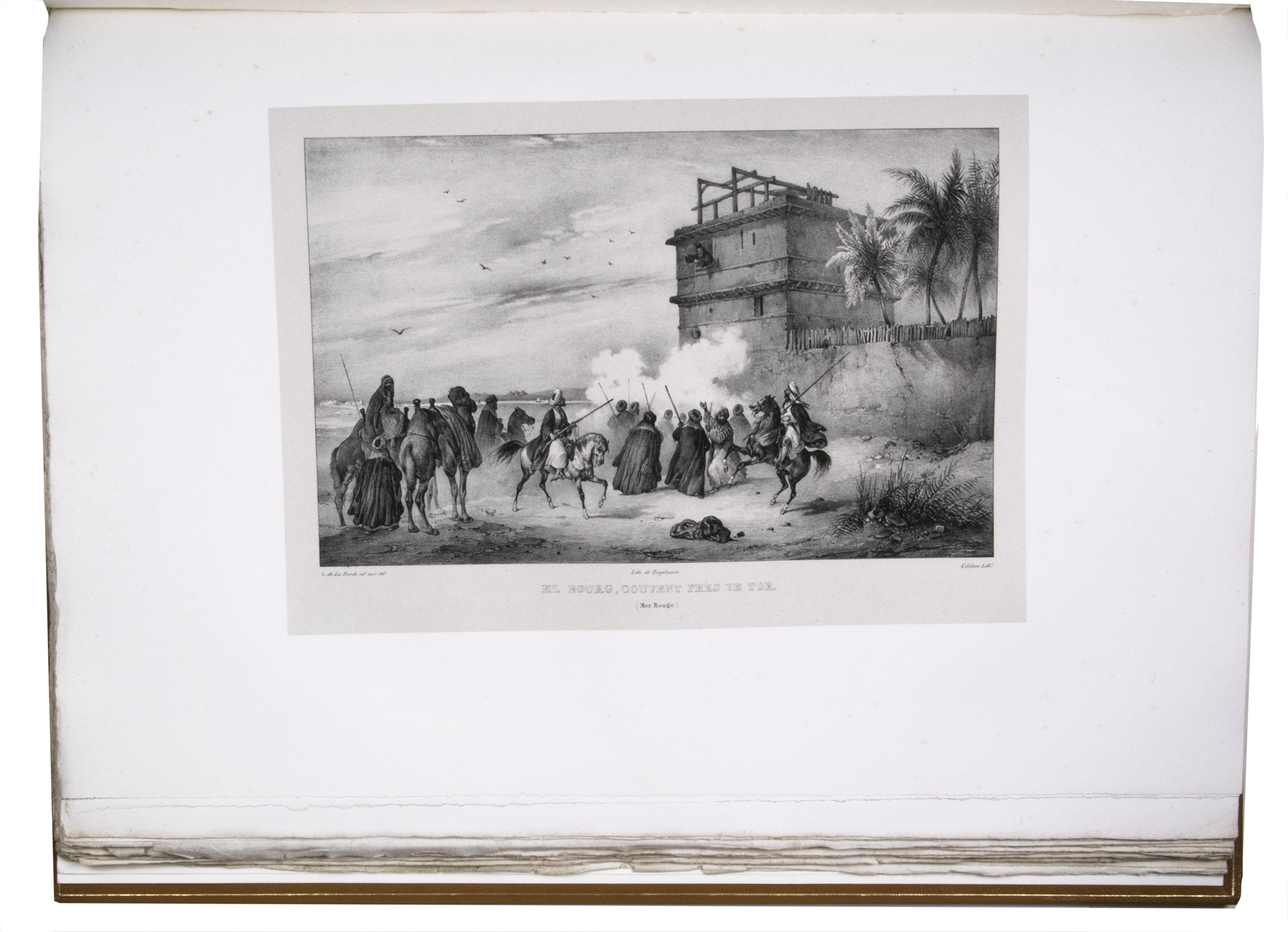 Paris, Giard (colophon: printed by the Imprimerie Normale/Jules Didot l'ainé), 1830[-1834]. Royal 1mo (42 x 59.5 cm). With a lithographic title page (with a large lithographed title vignette separately printed on "India" paper and mounted on the title page) and lithographed coat of arms of the dedicatee Wilhelm II of Hesse printed directly on dedication leaf, 69 lithographed plates (3 double-page and 1 larger folding) showing views, maps and plans after Laborde and Linant de Bellefonds, most separately printed on "India" paper and mounted on the leaves. With 1 zoological plate (of a marmot and young: "El Oueber") subtly coloured as published. Period-style half calf with gilt title to spine.