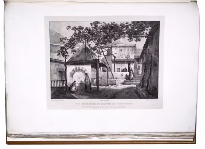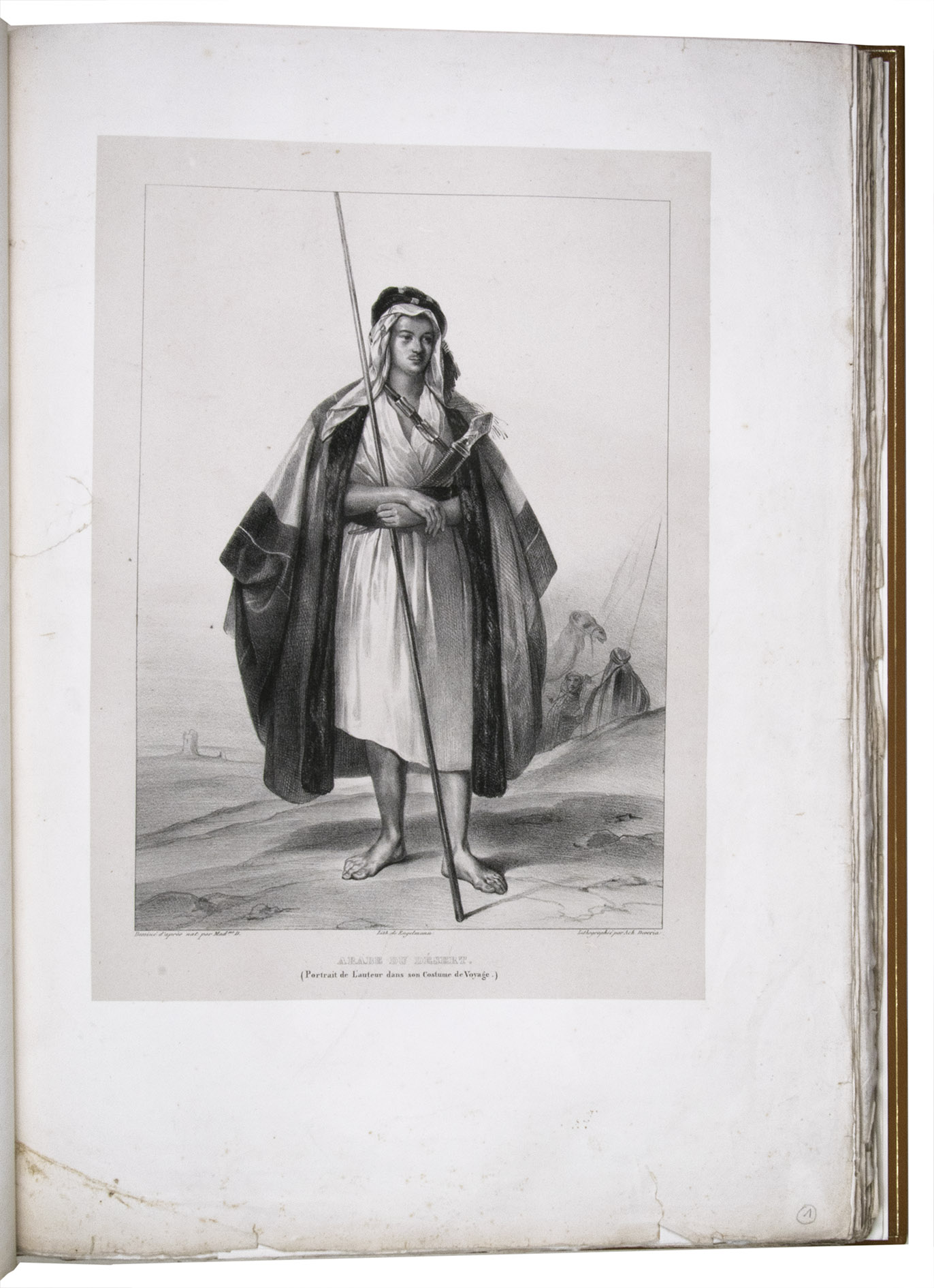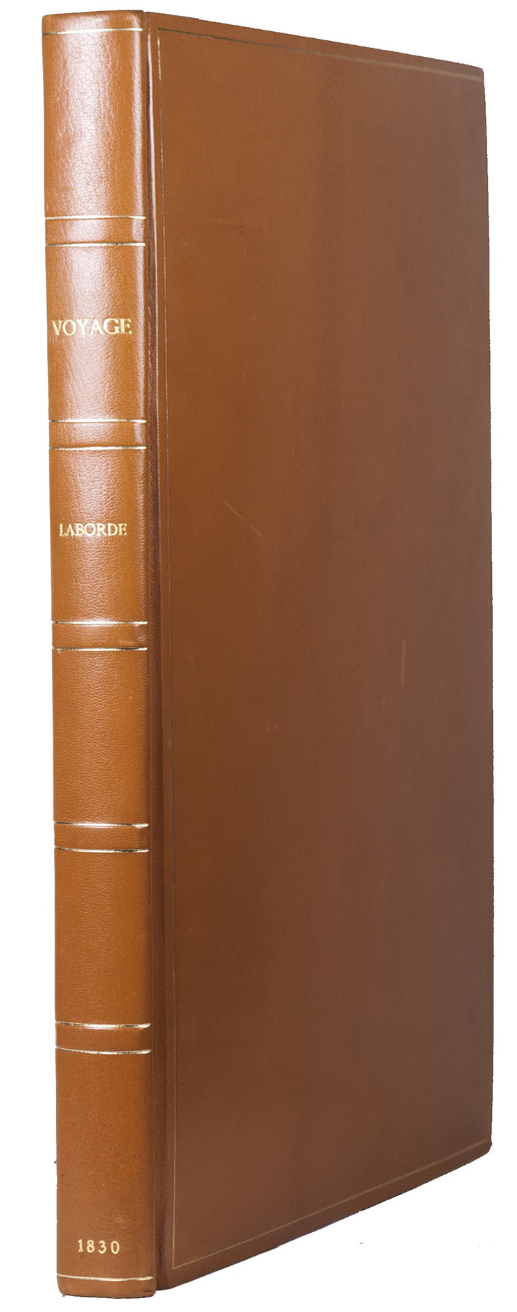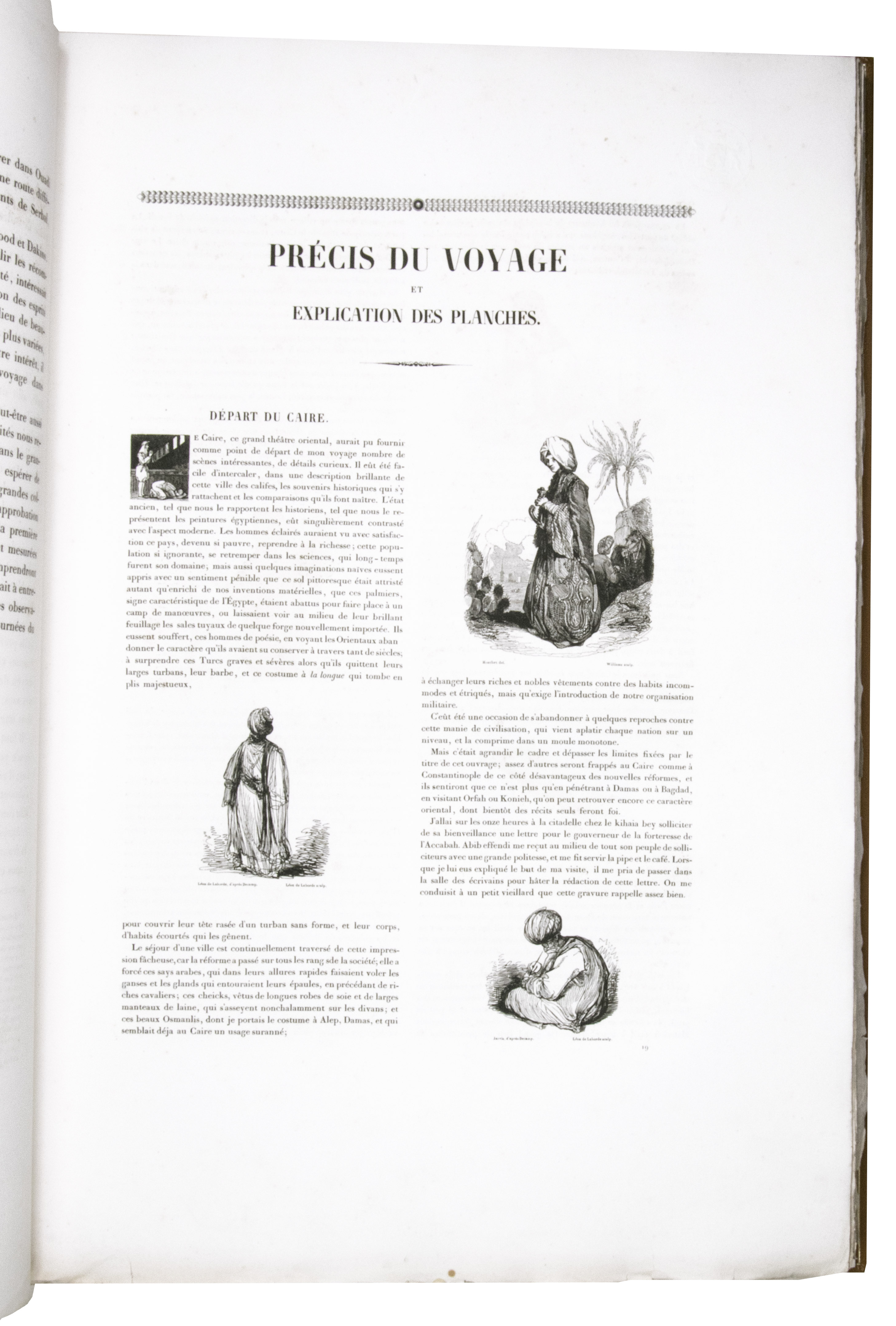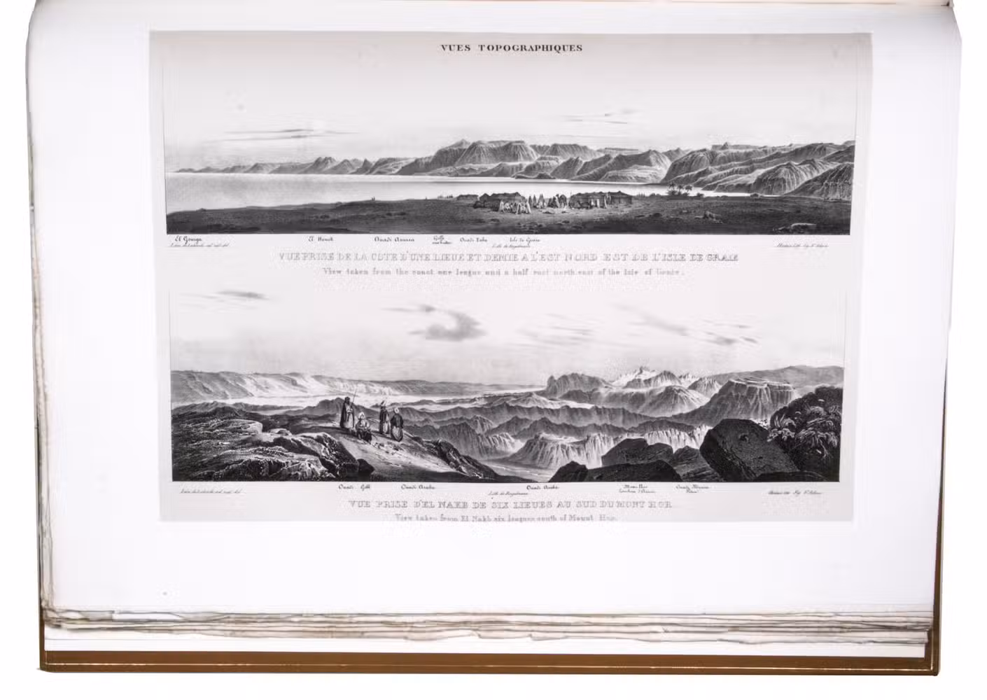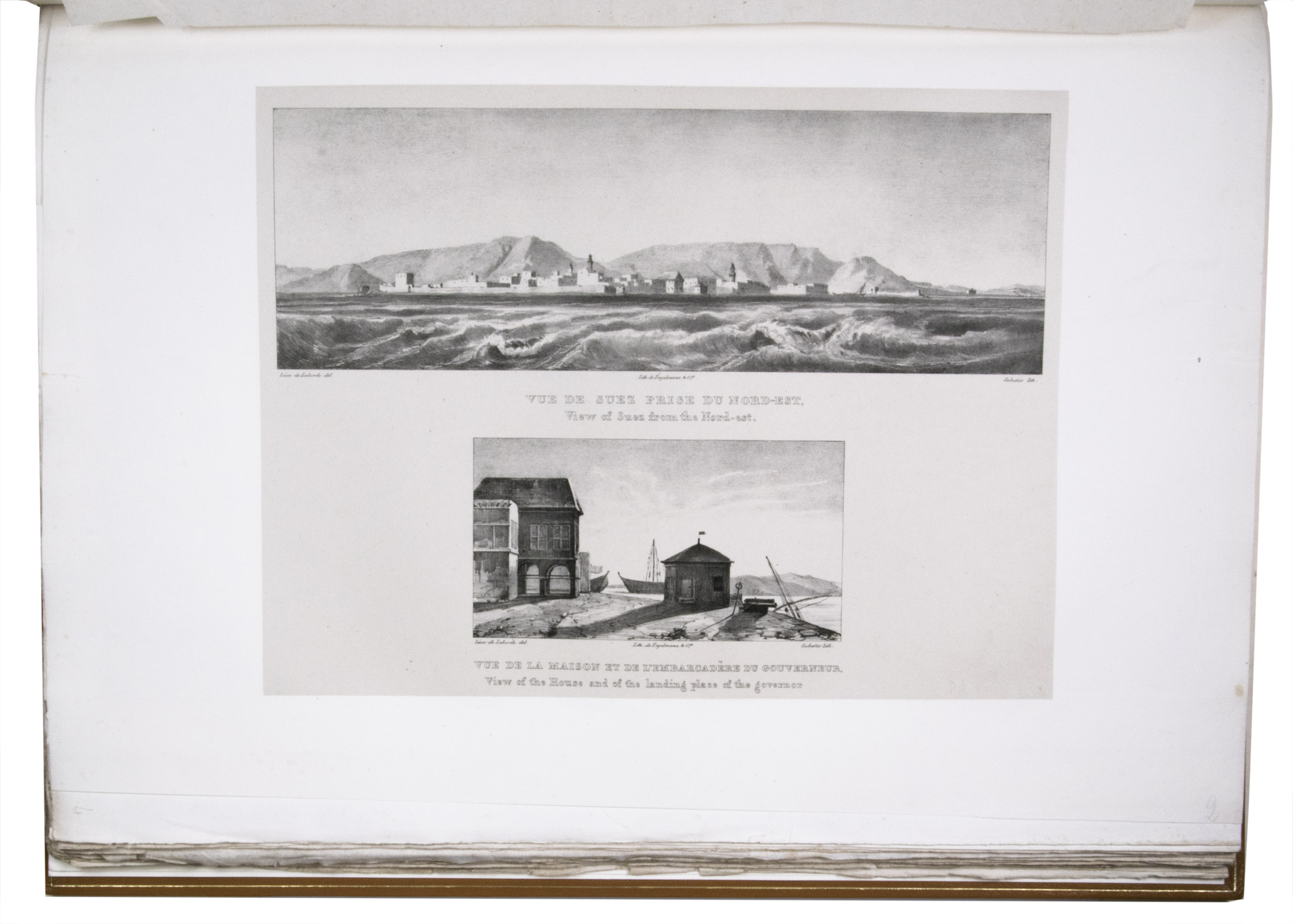 Paris, Giard (colophon: printed by the Imprimerie Normale/Jules Didot l'ainé), 1830[-1834]. Royal 1mo (42 x 59.5 cm). With a lithographic title page (with a large lithographed title vignette separately printed on "India" paper and mounted on the title page) and lithographed coat of arms of the dedicatee Wilhelm II of Hesse printed directly on dedication leaf, 69 lithographed plates (3 double-page and 1 larger folding) showing views, maps and plans after Laborde and Linant de Bellefonds, most separately printed on "India" paper and mounted on the leaves. With 1 zoological plate (of a marmot and young: "El Oueber") subtly coloured as published. Period-style half calf with gilt title to spine.