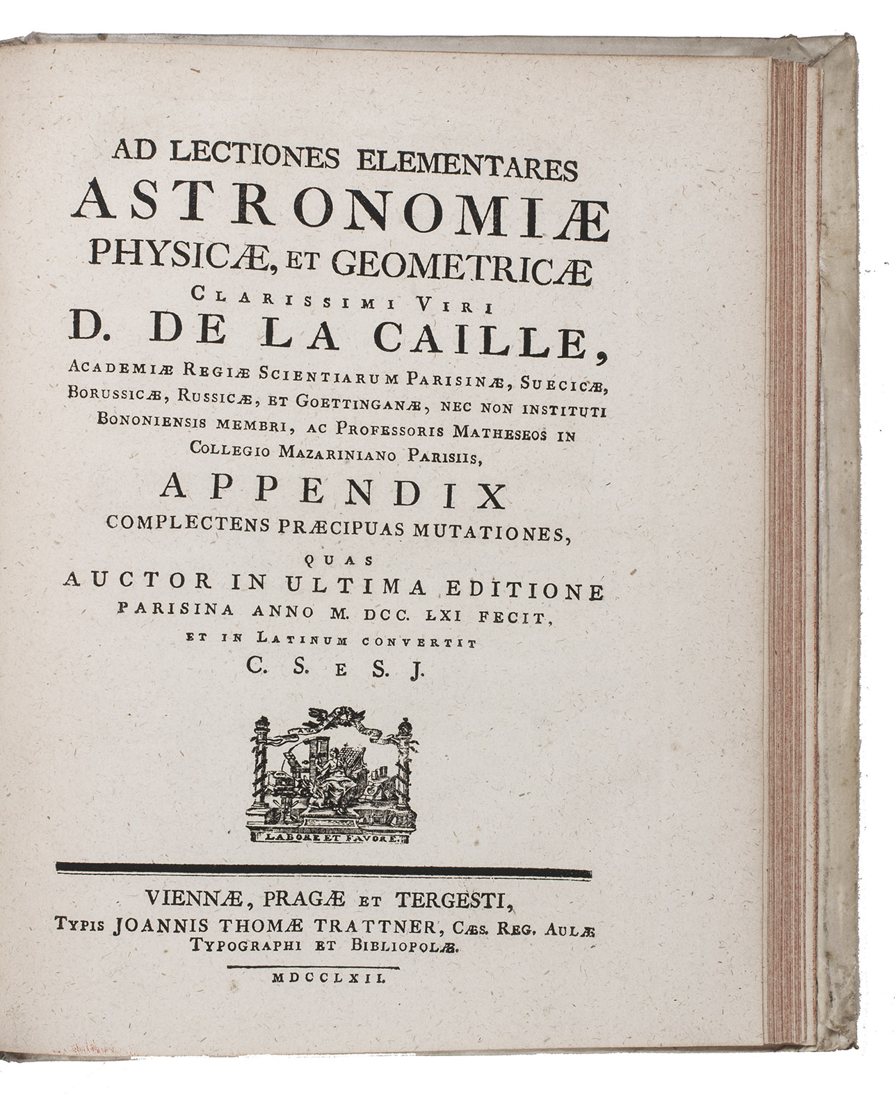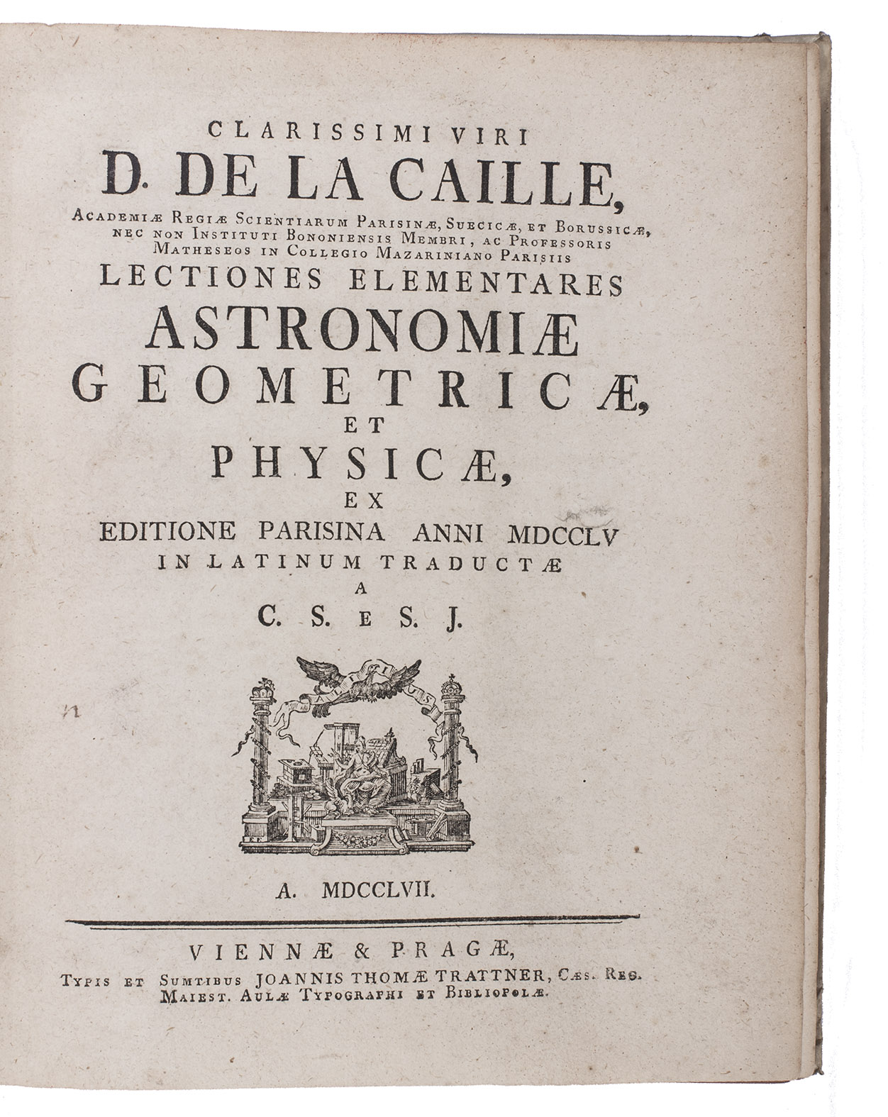 Lectiones elementares astronomiae, geometriae, et physicae, ex editione Parisina anni 1755 in Latinum traductae a C.S(chefer) e S.J. Including: Appendix, complectens Praecipuas Mutationes, quas Auctor in Ultima Editione Parisina anno 1761 fecit, et in Latinum convertit C.S(chefer) e S.J.