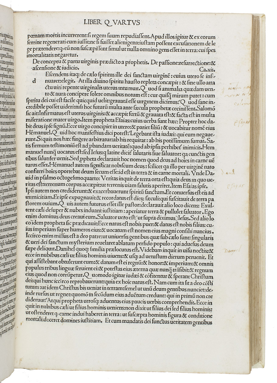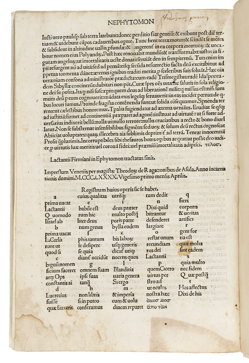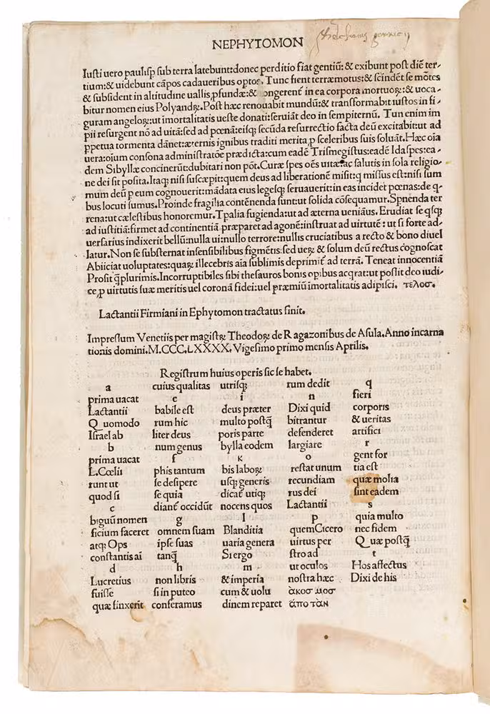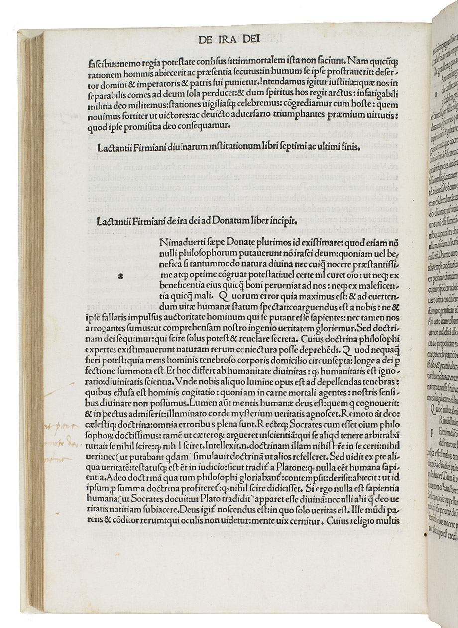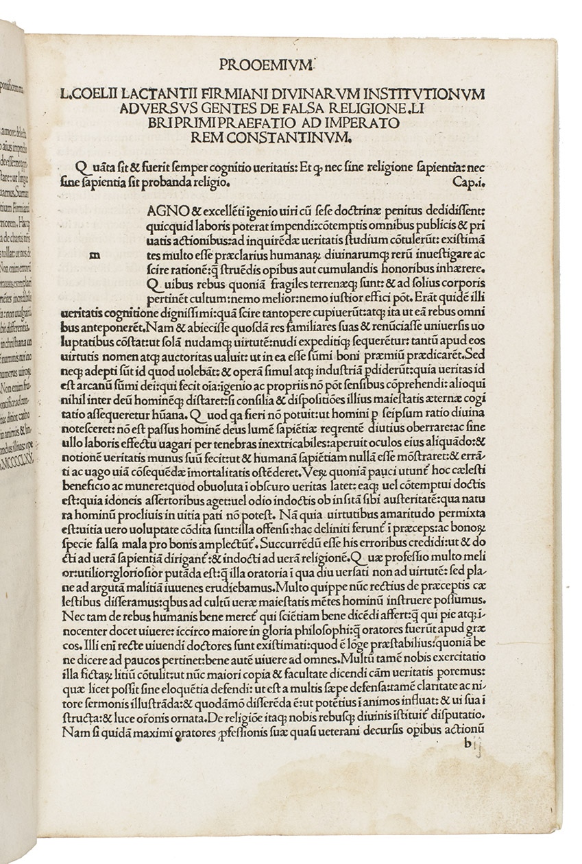 First Venice edition of Lactantius' most important works, edited by Giovanni Andrea Bussi (Joannis Andrea, bishop of Aleria, 1417-1475). Lucius Caecilius Firmianus Lactantius (ca. 240-ca. 320) was a rhetoric of Berber origin, who converted to Christianity and became an advisor to Emperor Constantine I and tutor to his son. He was one of the very first Christian apologetics and wrote works explaining Christianity in terms that would be palatable to educated people who still practiced the traditional religions of the Empire, while defending Christian beliefs against the criticisms of Hellenistic philosophers. For unknown reasons, Lactantius was considered somewhat heretical after his death and it was therefore forbidden to read and study his work. It was only copied and printed in the 15th century, when the early humanists took a renewed interest in him for his elegant writing style and called him "the Christian Cicero". Bussi, who was a humanist and the bishop of Aleria (on Corsica), edited Lactantius' work. Bussi's edition was first printed in Rome in 1470. This is the second edition.