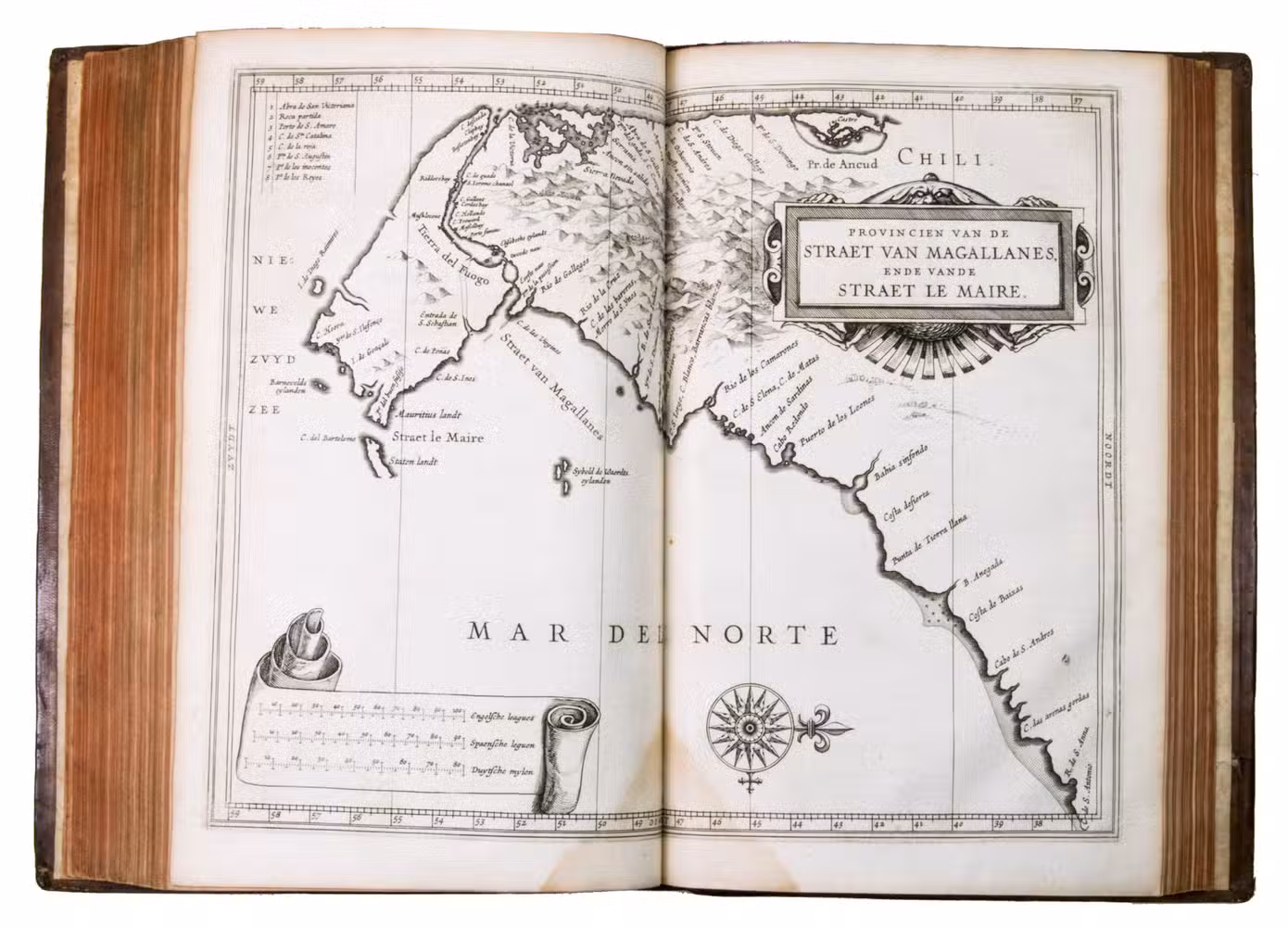 Johannes de Laet (1582-1649) was a Dutch geographer, director of the Dutch West India Company (WIC, since 1621), and polyglot. As WIC director, he was able to bring together information from older publications and contemporary eye-witness accounts to produce the present masterpiece: the most comprehensive account of the New World to that time. It went through many editions, and was translated into Latin in 1633, French in 1640, and even abridged in Spanish around the same time. De Laet went on to produce a whole library of pocket descriptions of various regions of the world, and he, quite successfully, debated in print with Hugo de Groot.