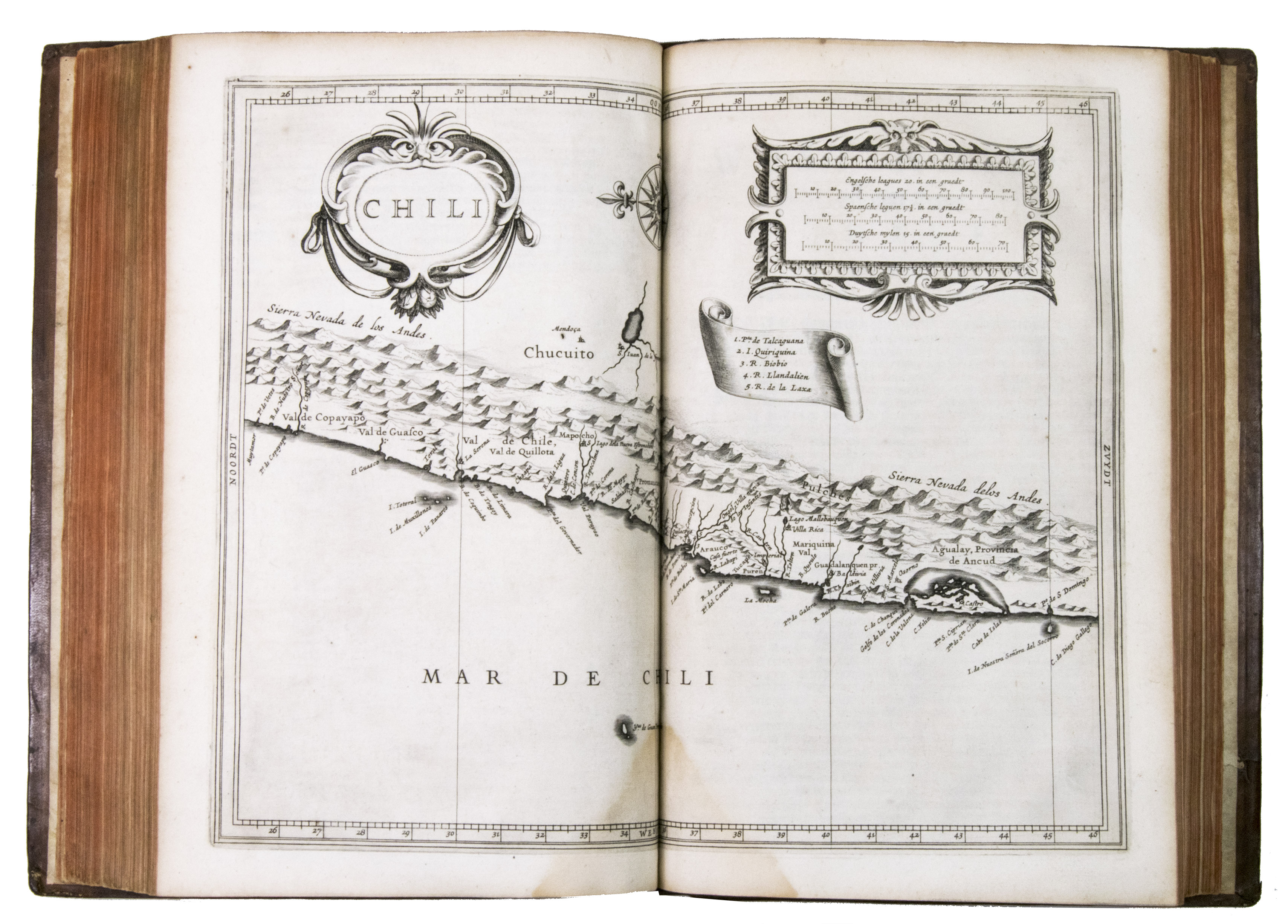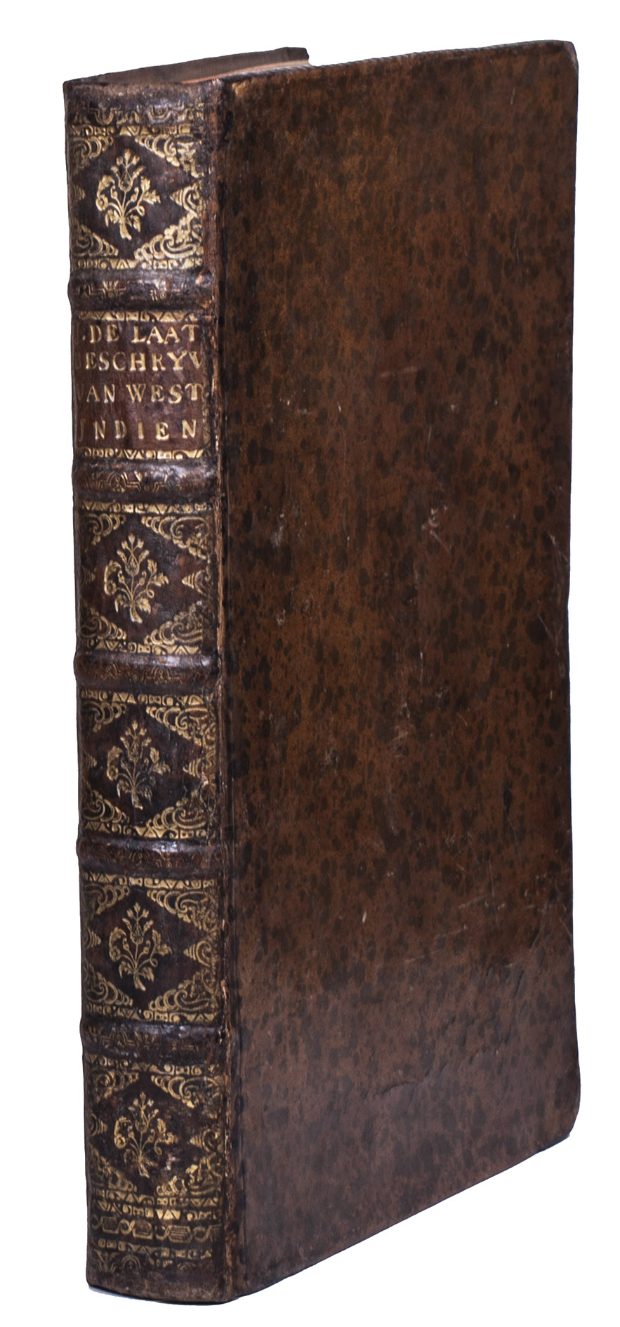 With a 1793 owners signature of J.A. Valentyn. The binding has cracked at the hinges, but otherwise still good. Internally somewhat browned and occasionally spotted, with water stains in the gutter of many leaves, sometimes encroaching on the corner of the text or the bottom centre of the maps, missing the final blank leaf. Otherwise in good condition. The first edition of a classic, printed by Isaac Elzevier, showing European knowledge of the New World in 1625. Alden & Landis 625/125; Asher 1; Borba de Moraes I, p. 450; JCB II, p. 193; NNBW VIII, cols. 991-992; Nissen, ZBI 2359 (erroneously dated 1626); Phillips & LeGear 1147; Rahir, Les Elzevier 195; Sabin 38554; Tiele, Volkenkunde 626; Willems 230; cf. Bosch, Brasilien-Bibliothek 85 (French ed. 1640); Lande, Canadiana 492 (French ed. of 1640); Rodrigues, Bib. Brasiliense 1351 (2nd ed.).
