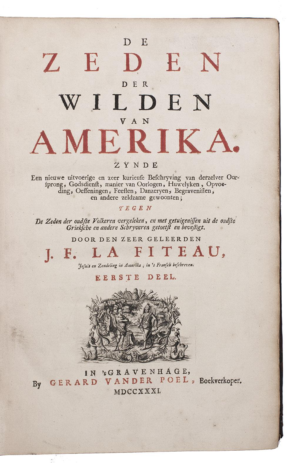 First edition of the Dutch translation of an important work on North American Indians. The author, Joseph François Lafitau (1681-1746), was the son of a rich merchant and travelled as a missionary to Canada in 1711, where he tried to convert the Iroquois Indians to Christianity. He made "a thorough study of Iroquois character and usages, as a preparation for his great work Moers des sauvages ..." (Howgego). It deals extensively with the religion of the Iroquois, referring to other "primal" religions in Brazil and the Antilles, but also to ancient Greek and Roman rites. Other chapters deal with the Iroquois government, marriage, warfare, trade, hunting, burial, etc., all illustrated in great detail. Lafiteau also discovered ginseng in Canada, and wrote a treatise on its medicinal properties.