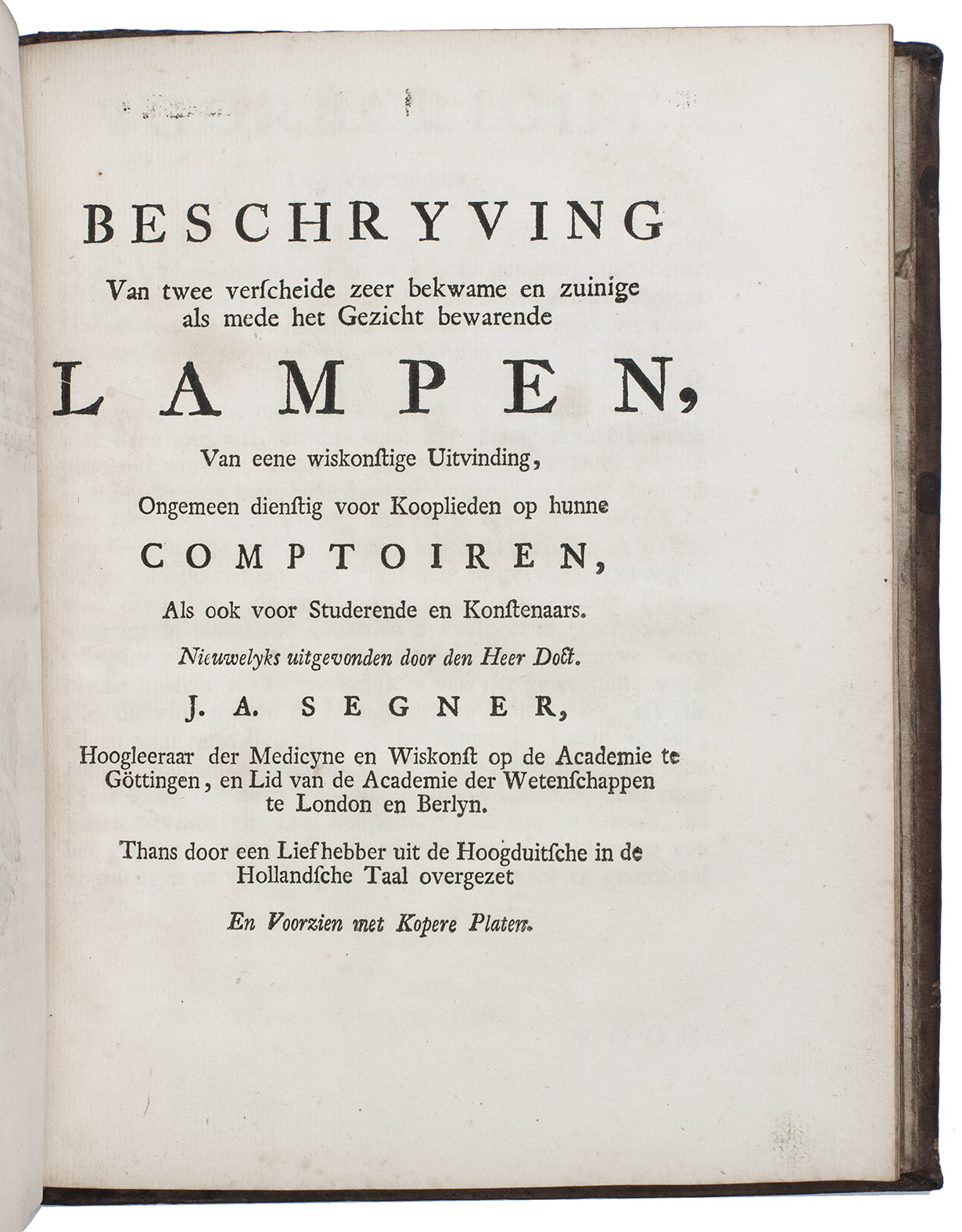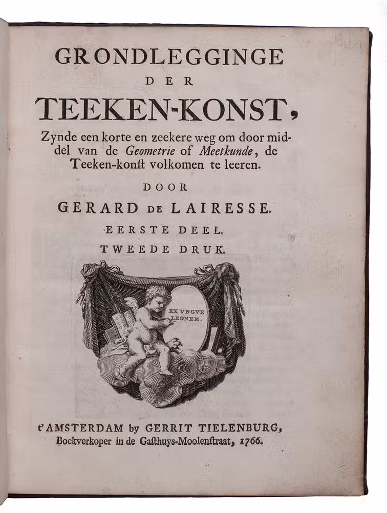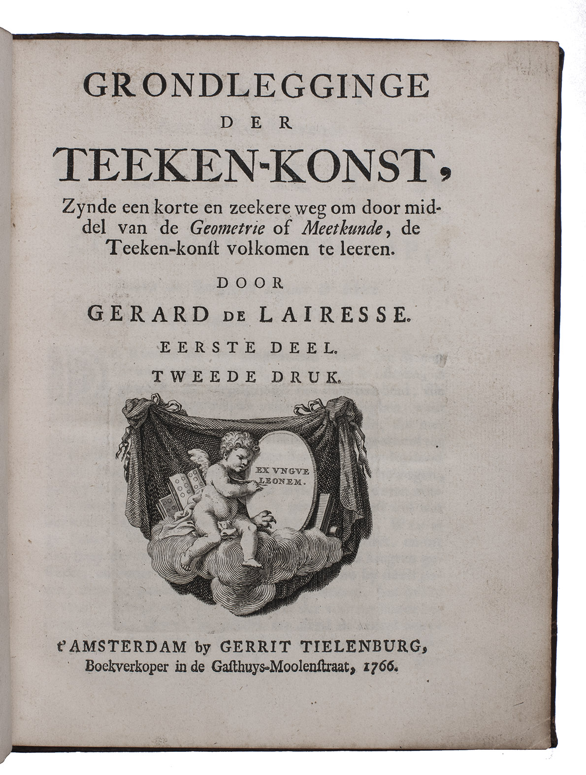 Second edition of a popular practical manual teaching the art of drawing by the famous Dutch painter Gerard de Lairesse (1640-1711). The book is divided into two parts, the first part teaching young children in 12 lessons the principles of drawing based on geometry, and in the second part a more advanced course is given in 10 so-called "propositions" for professional art students, including a detailed plan for the installation of an Art Academy. Gerard de Lairesse, sometimes called the Dutch Poussin, devoted himself to teaching after he became blind in 1690. Being a classicist, his theories were mainly based on Junius's De pictura Veterum, and on Charles Dufresnoy's De arte graphica, but the practical side of his teaching, based on his own lifelong experience, gives his text books their special interest and importance.The treatise by Segner teaches how to construct lamps which were economic and efficient and also spared the artist's eye-sight. The plates extensively show how to construct such lamps as well as their oil-reservoirs.