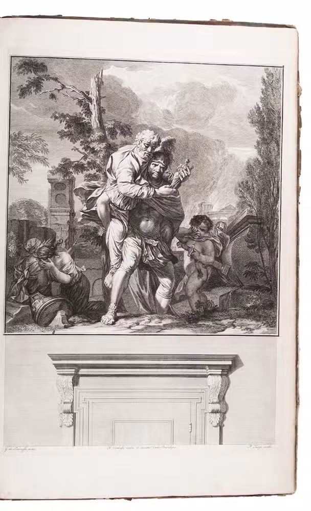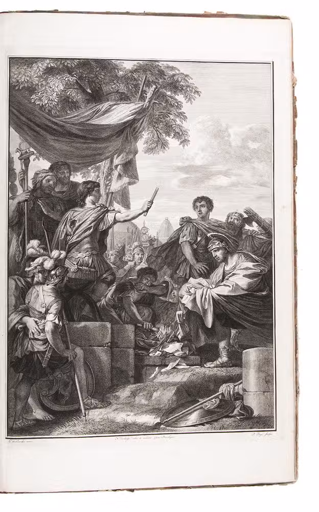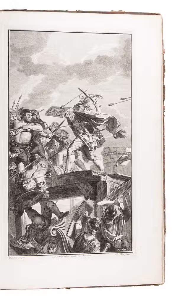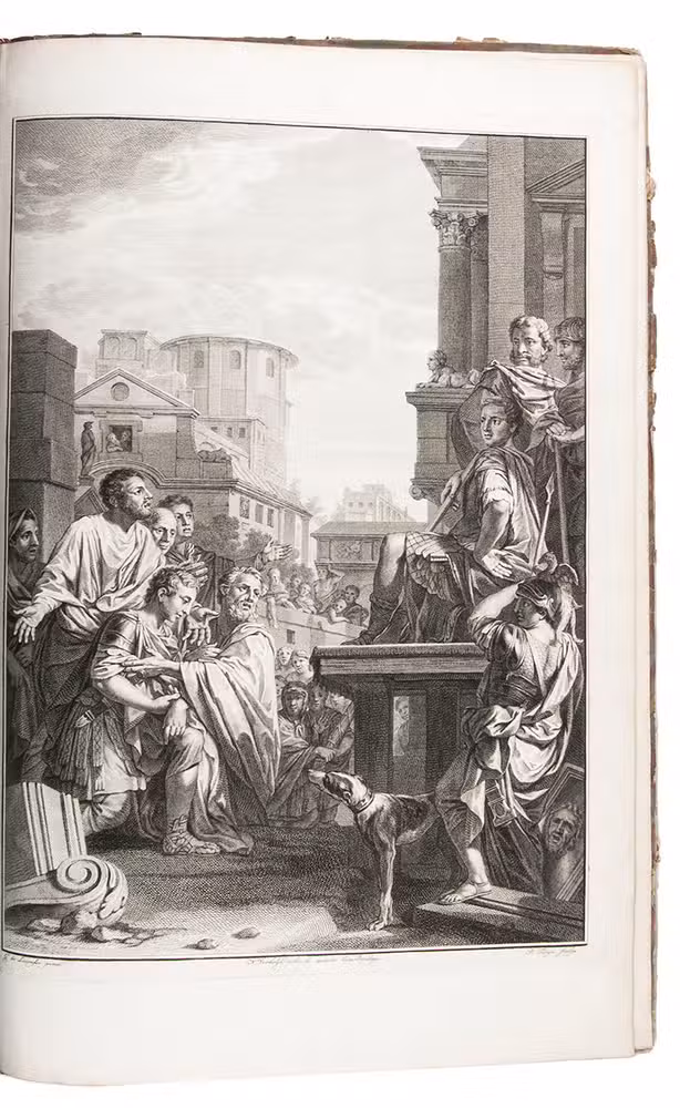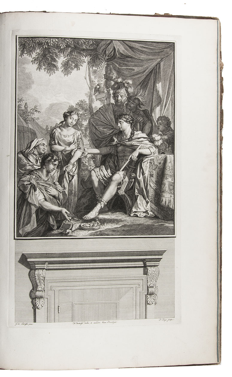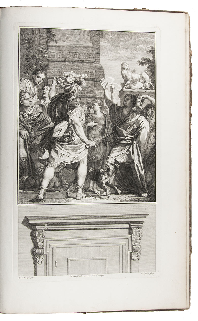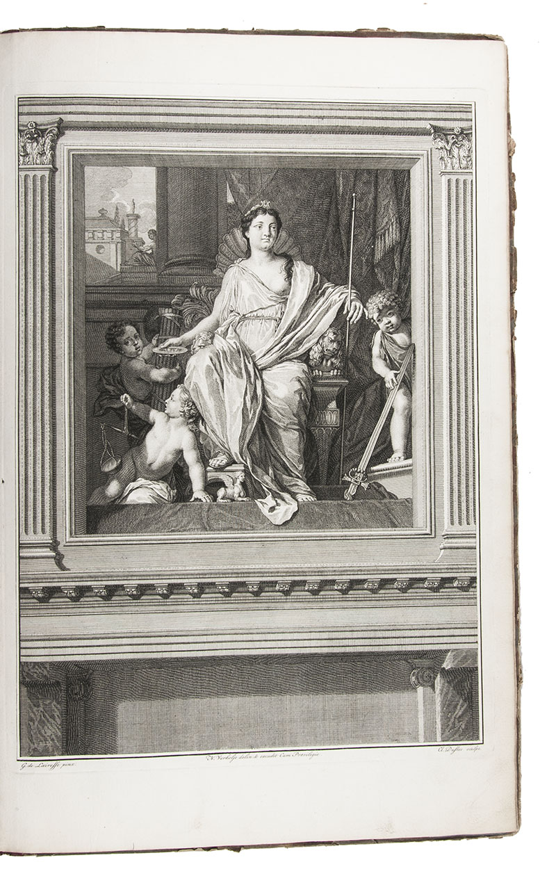 First and only edition of a set of plates illustrating seven paintings by Gerard de Lairesse (1640-1711) in the council room of the former Court of Justice of Holland, Zeeland and West Friesland (now called the Lairesse room) in the Binnenhof in The Hague. The Court commissioned the paintings in 1684 and they were completed by 1688. They depict Aeneas carrying his father Anchises, an allegorical figure of Justice and five scenes from ancient Roman history, each representing a different virtue: Pompei (prudence), Scipio (moderation), Horatius Cocles (courage), Scipio again (steadfastness) and Papyrius (clemency). The printed image of each plate measures about 40 x 28 cm. In three cases the painting fills the plate; the other four paintings, being more or less square (about 23 x 23 cm to 29 x 29 cm in the plates), are depicted within the architectural context. Binding used. A very good copy. Timmer, Gerard Lairesse (1942), p. 83, nr. 26; cf. Snoep, "Gerard Lairesse als plafond-en kamerschilder", in: Bulletin van het Rijksmuseum, Vol. 18 (1970), Nr. 4, pp. 198-209.