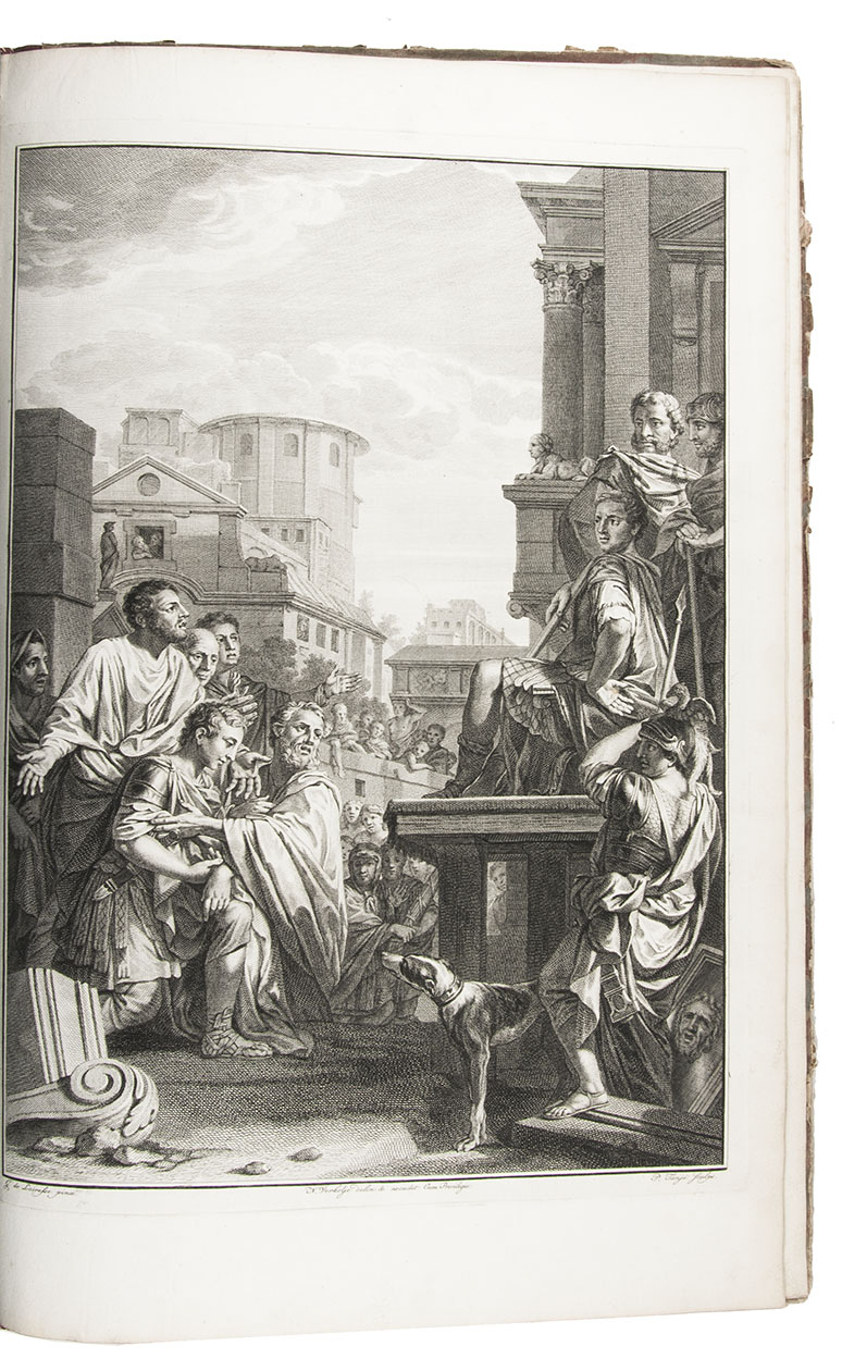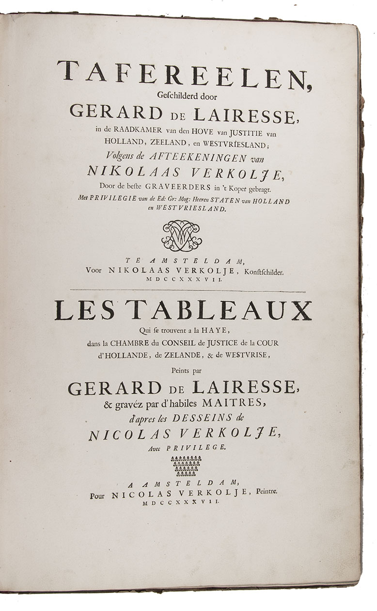 Amsterdam, printed for Nikolaas Verkolje, 1737. Large folio. With 7 engraved plates illustrating 7 paintings by Larisse at the old provincial Court of Justice in the Binnenhof at The Hague, engraved by Pierre Tamjé and Claude Duflos after drawings by Verkolje. 19th-century half roan, marbled boards. [4 = title, privilege, explanation] ll.