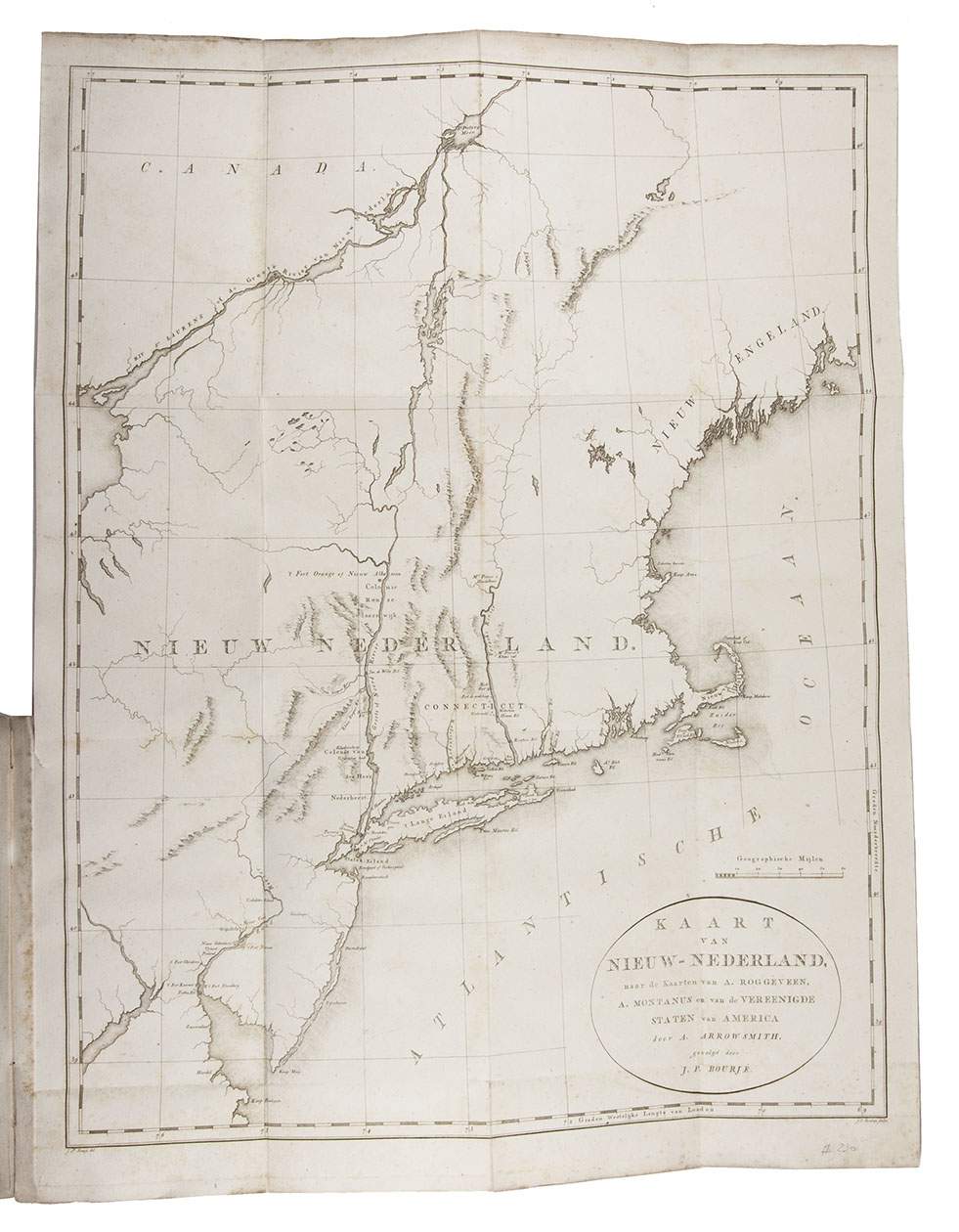 First edition of Lambrecht's account of the Dutch colony in America up to its cession to England in 1674, as well as an account of the fate of the Dutch settlers after the British takeover. It covers the discovery and exploration of the regions around present-day New York, the Dutch relations with the English colonies in Virginia and Massachusetts Bay, and the English takeover. New York was beginning to establish itself as America's leading city in the early nineteenth century, and a growing interest in its history made the history of the Dutch colony topical. The folding map, entitled "Kaart van Nieuw-Nederland" combines an up-to-date cartographic image based on Aaron Arrowsmith's 1804 Map of America, with historical data from maps in Arent Roggeveen's 1675 sea atlas and Arnoldus Montanus's 1671 atlas of America.