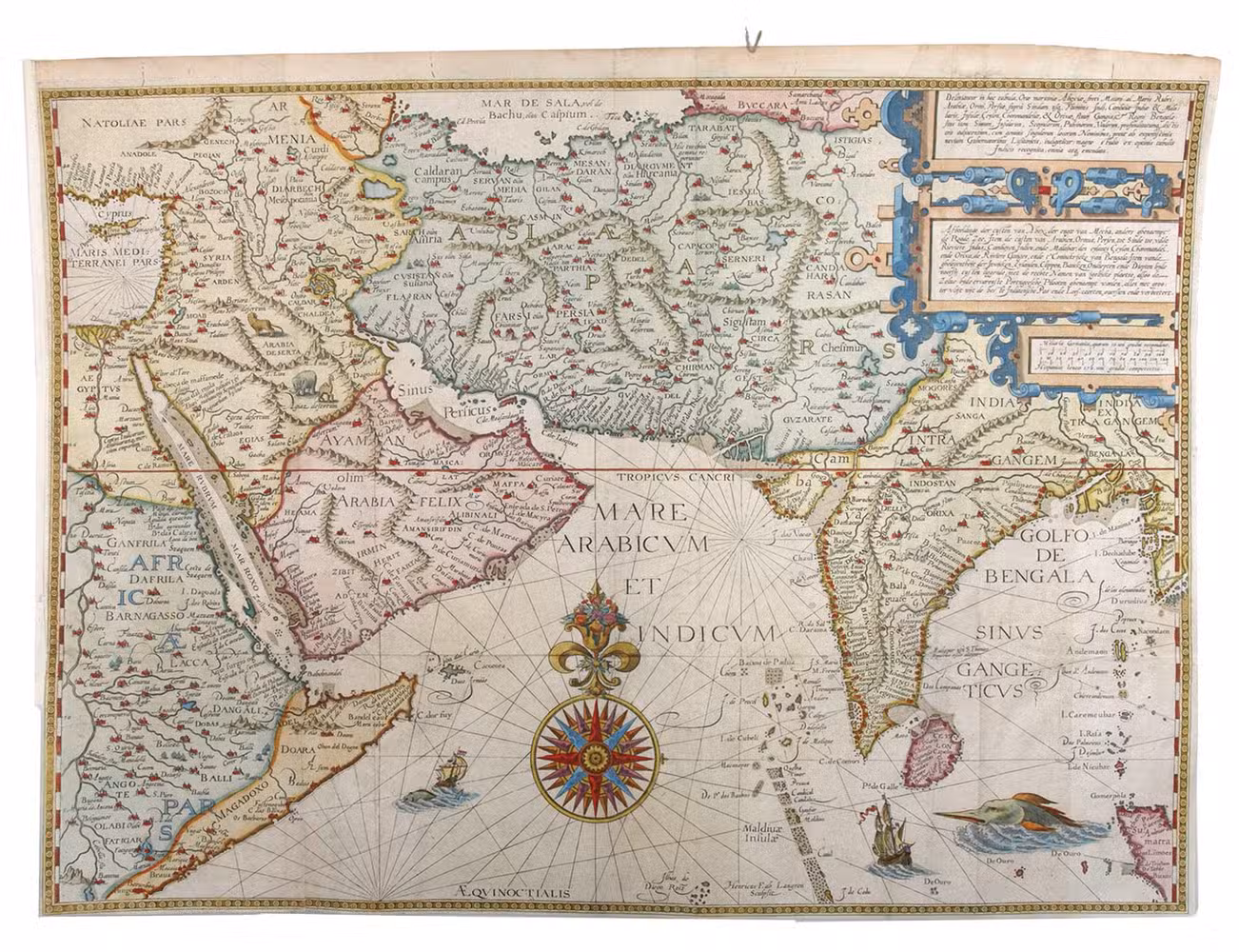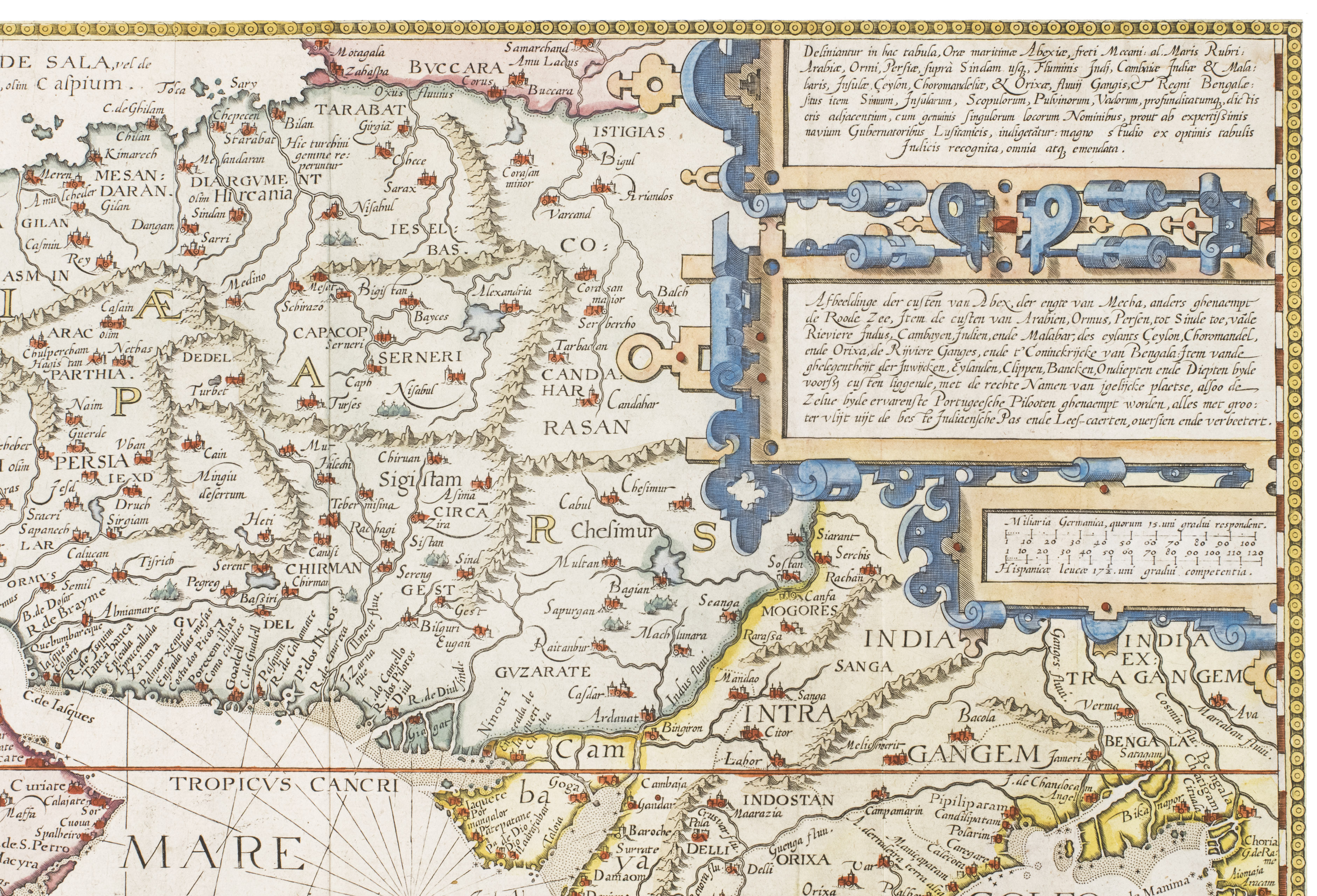 38.5 x 53.5 cm as assembled. Engraved map of Arabia, India and surroundings in 2 sheets, engraved for J. Huygen van Linschoten, Itinerario, 1596. Matted.