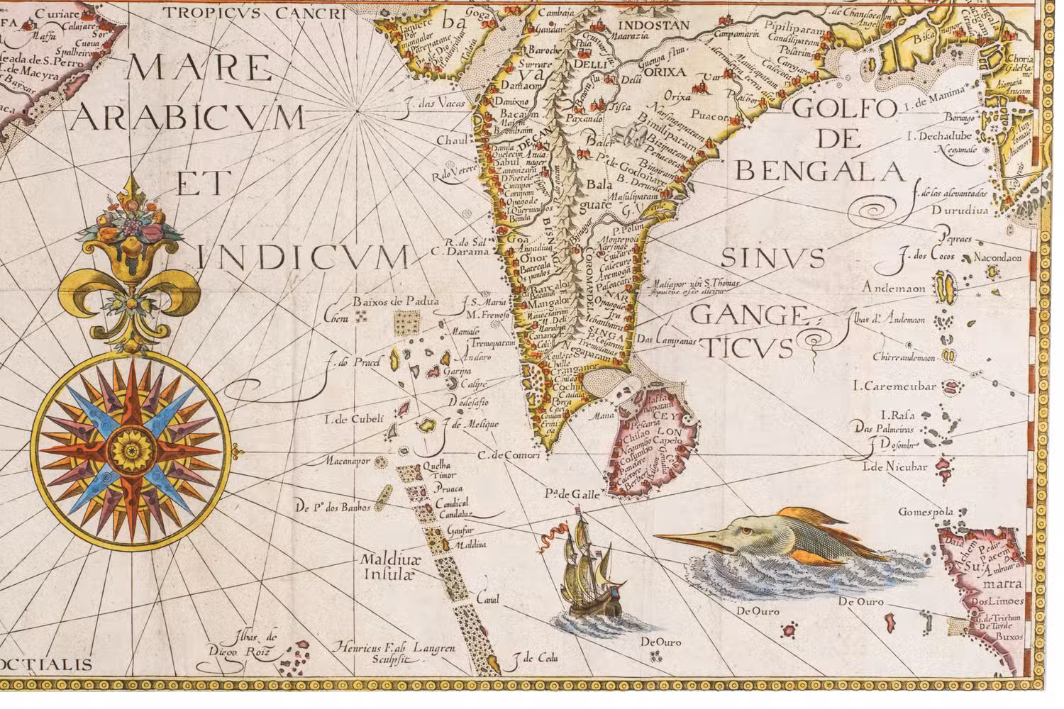Famous map and nautical chart of the Arabian Sea and the Bay of Bengal, covering the regions from Cyprus and the Nile valley in the west to northern Sumatra and the Ganges valley in the east, including the entire Red Sea, the Gulf and part of the Caspian Sea, as well as the horn of Africa, the Middle East and what are now Sri Lanka, Iran and Afghanistan, all at a scale of about 1:13,000,000. It was engraved for Linschotens famous 1596 Itinerario and is taken from an unidentified edition sometime in the years 1596 to 1644. "Probably the first detailed navigation chart printed for the Indian Ocean and the Arabian sea" (Al Ankary 148). Though intended primarily as a nautical chart, with an elaborate compass rose, rhumb lines radiating from four points (including one in the Mediterranean) and numerous islands, coastal toponyms, sand bars, etc., but it also shows inland topographic features, including cities, mountains, lakes and rivers. Although it shows no parallels or meridians (aside from the Tropic of Cancer) the left and right borders include a reticulated scale of degrees latitude from the equator to more than 43°N, with the latitude noted every five degrees. Al Ankary 148f; Clancy 70; Clancy/R. 67; Gole, Early maps 8; Schilder, MCN V, p. 140 & VII, p. 220/1; Tibbetts 46 (all illustrated).