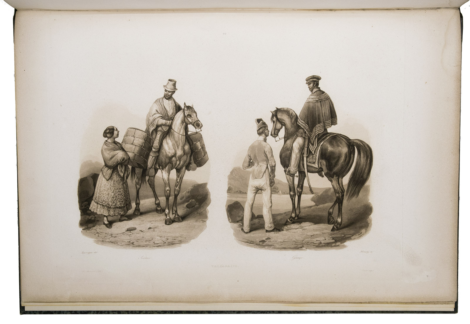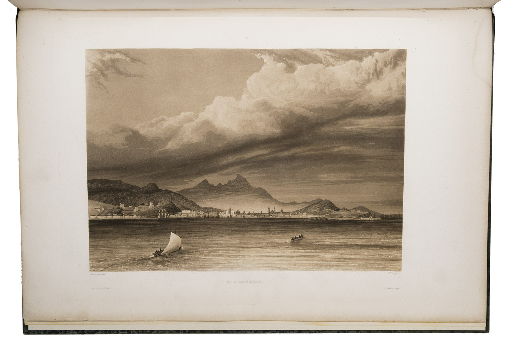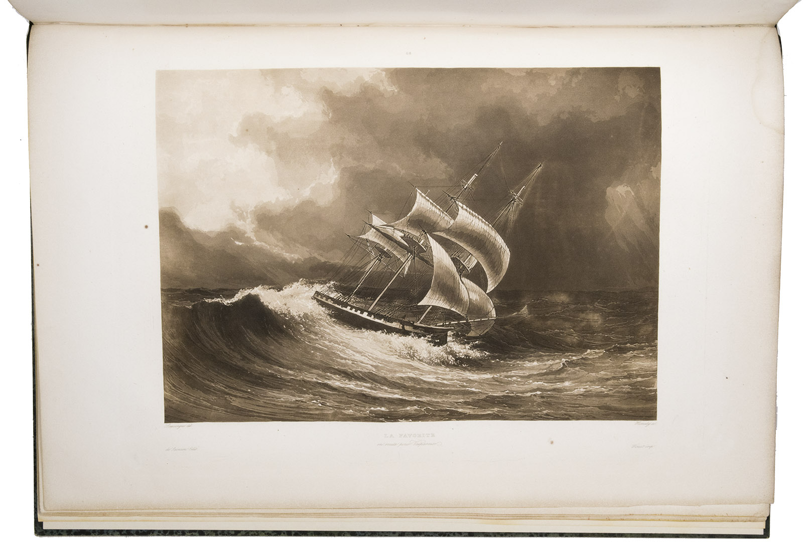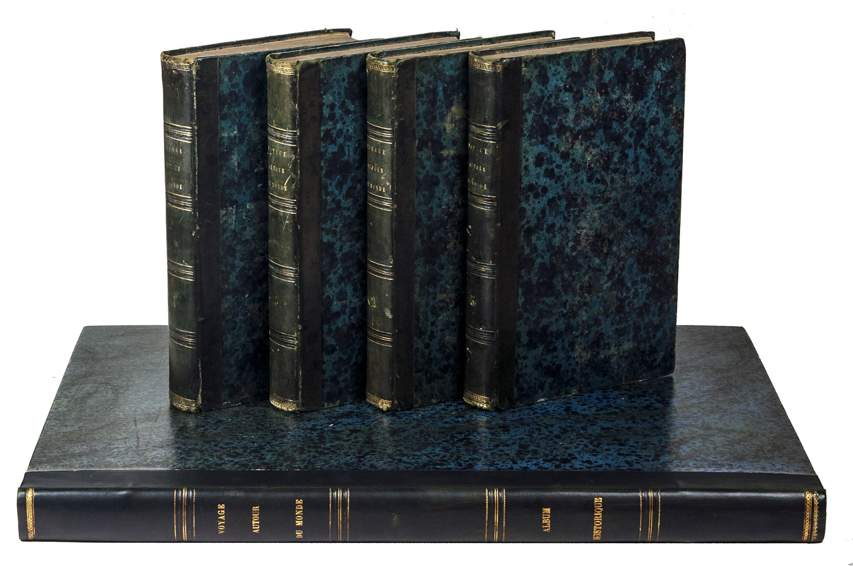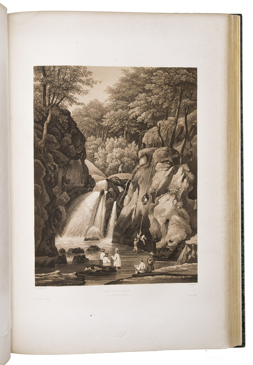Paris, Imprimerie Royale (views volume: Arthus Bertrand; map volume: Dépôt-Générale de la Marine), 1833-1835. 4 text volumes (8vo), 1 views volume (folio) and 1 atlas volume (1mo, 66 x 51 cm). With 1 folding engraved map in the first text volume, 2 full-page maps and 10 maps on 9 double-page plates in the "atlas hydrographique", and 72 extraordinary aquatint plates (ca. 27 x 36 cm) in the "album historique", most of them with the blind-stamped image of the ship La Favorite (15 x 28 mm). Contemporary half dark green calf, gold-tooled spines. [4], XLI, 558, [2]; [4], 481, [1]; [4], 510, [2]; [4], 480; [4] pp.