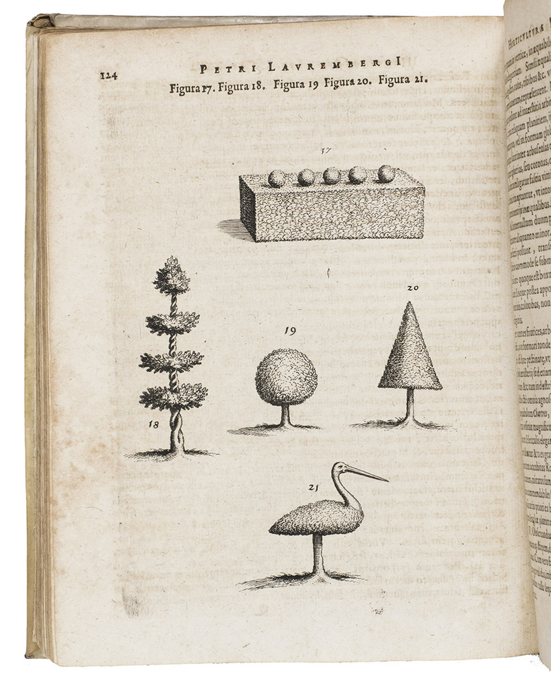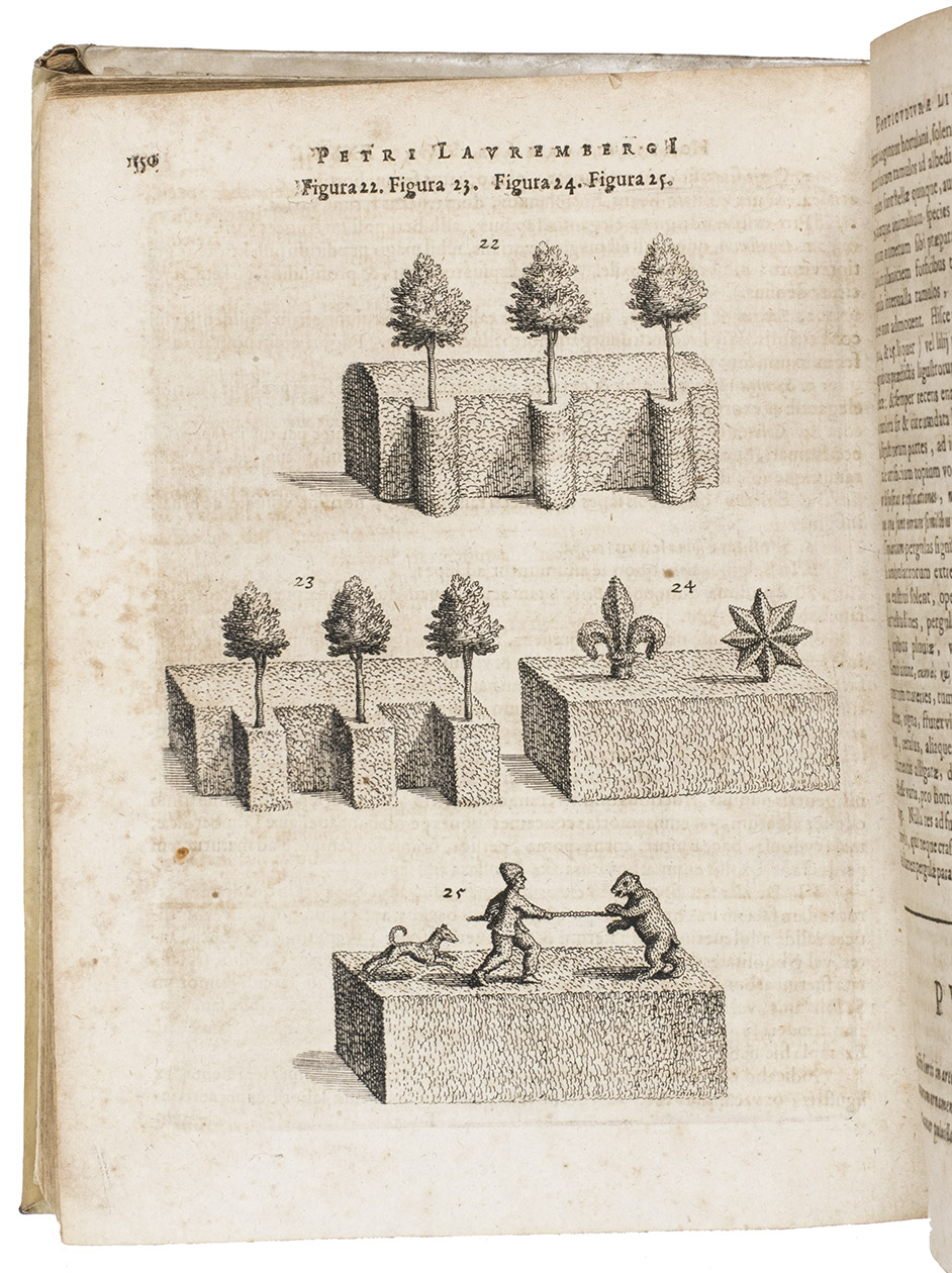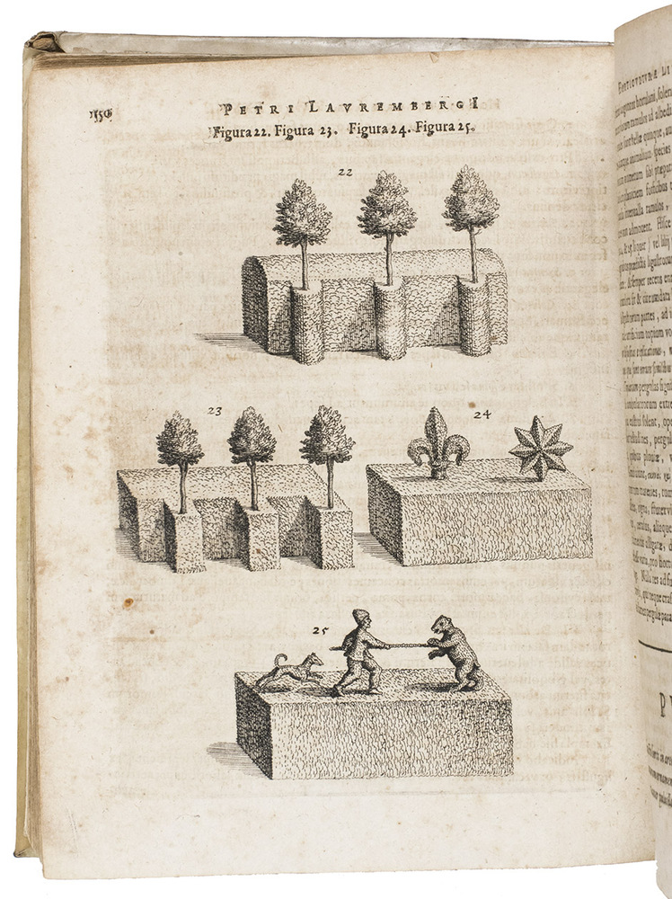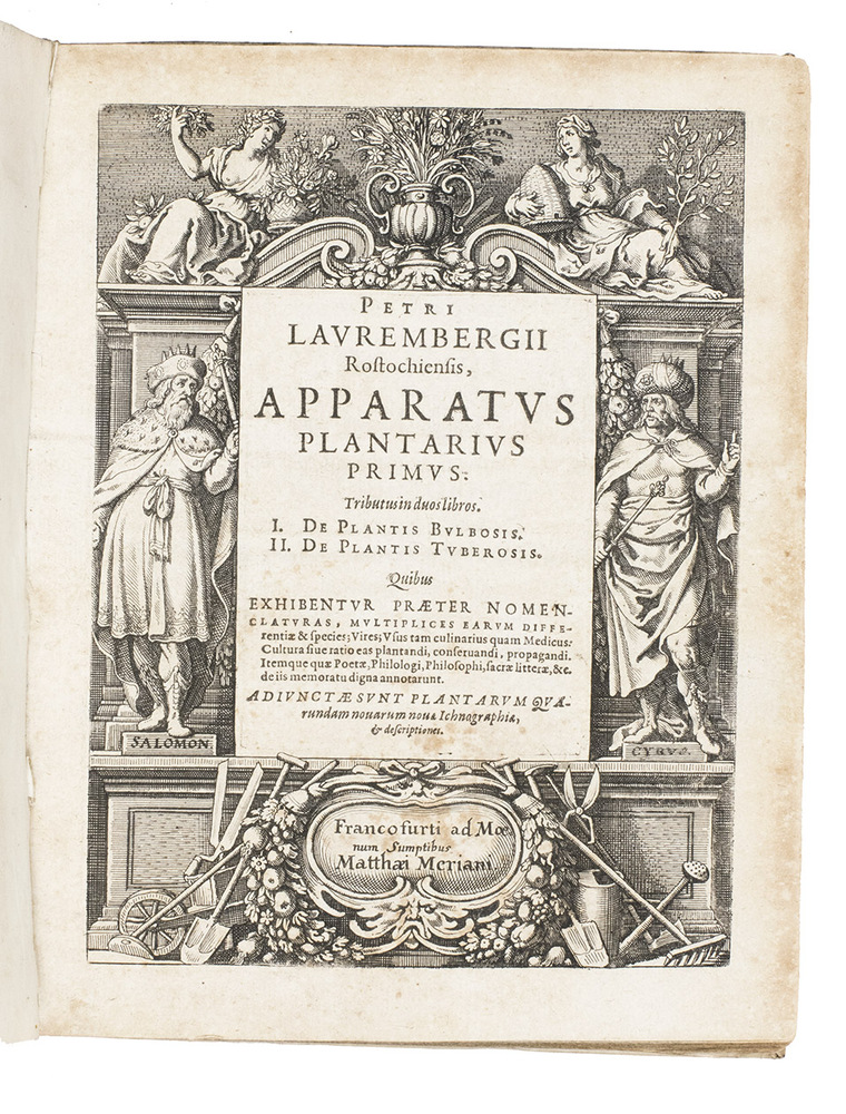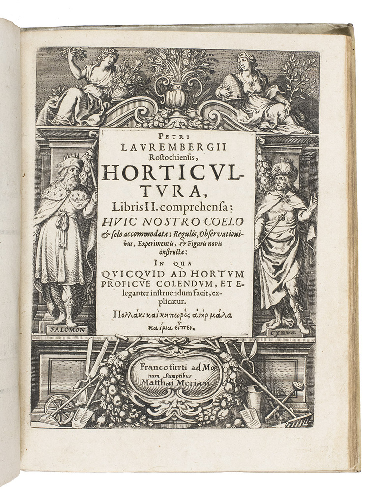 First editions of the two primary botanical works by Peter Lauremberg, a scientist from Rostock (1585-1639), feature copperplate illustrations engraved either by Matthäus Merian the Elder or from his workshop. These works provide guidance on garden design, including valuable explanations about soil science, fertilization, pest control, planting beds, fruit cultivation, and garden tools, among other topics. They are widely regarded as highly influential works during their time. Lauremberg describes his own experiments and experiences, offering numerous well-founded and scientific instructions for cultivating and planting a wide range of beneficial plants. Additionally, he discusses the cultivation of fruit, flower, and herb gardens, as well as topiary and mazes. Merian's exquisite copperplate illustrations showcase garden tools used in the garden, as well as decorative figures for trimming bushes, hedges, and mazes, along with lilies.