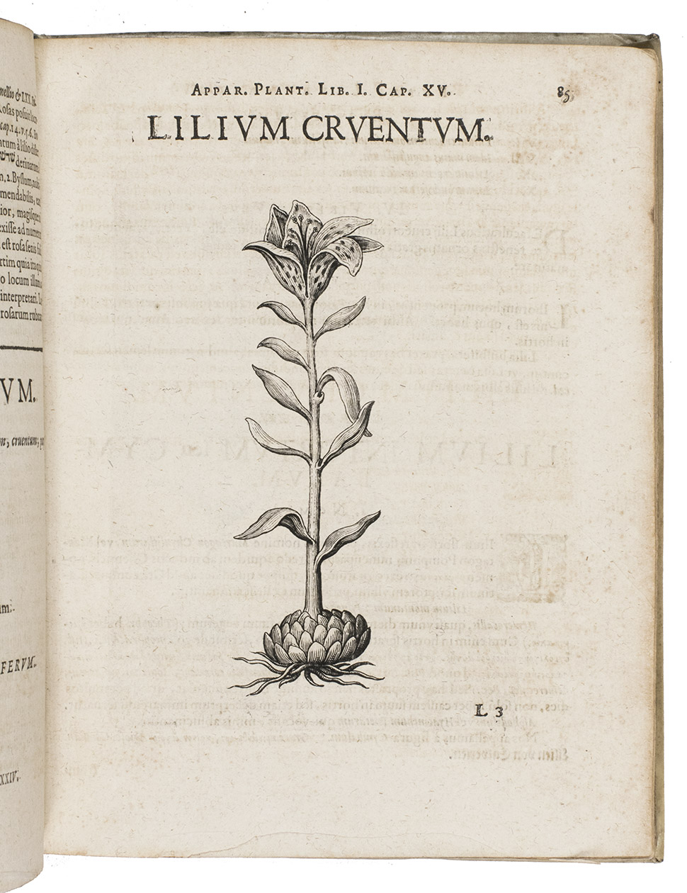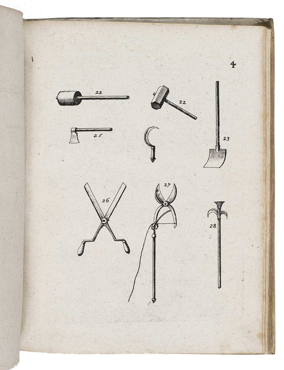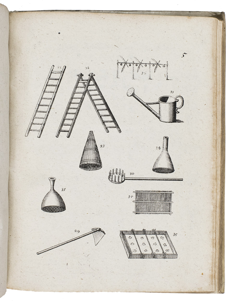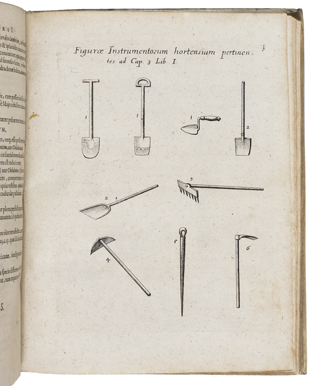 First editions of the two primary botanical works by Peter Lauremberg, a scientist from Rostock (1585-1639), feature copperplate illustrations engraved either by Matthäus Merian the Elder or from his workshop. These works provide guidance on garden design, including valuable explanations about soil science, fertilization, pest control, planting beds, fruit cultivation, and garden tools, among other topics. They are widely regarded as highly influential works during their time. Lauremberg describes his own experiments and experiences, offering numerous well-founded and scientific instructions for cultivating and planting a wide range of beneficial plants. Additionally, he discusses the cultivation of fruit, flower, and herb gardens, as well as topiary and mazes. Merian's exquisite copperplate illustrations showcase garden tools used in the garden, as well as decorative figures for trimming bushes, hedges, and mazes, along with lilies.