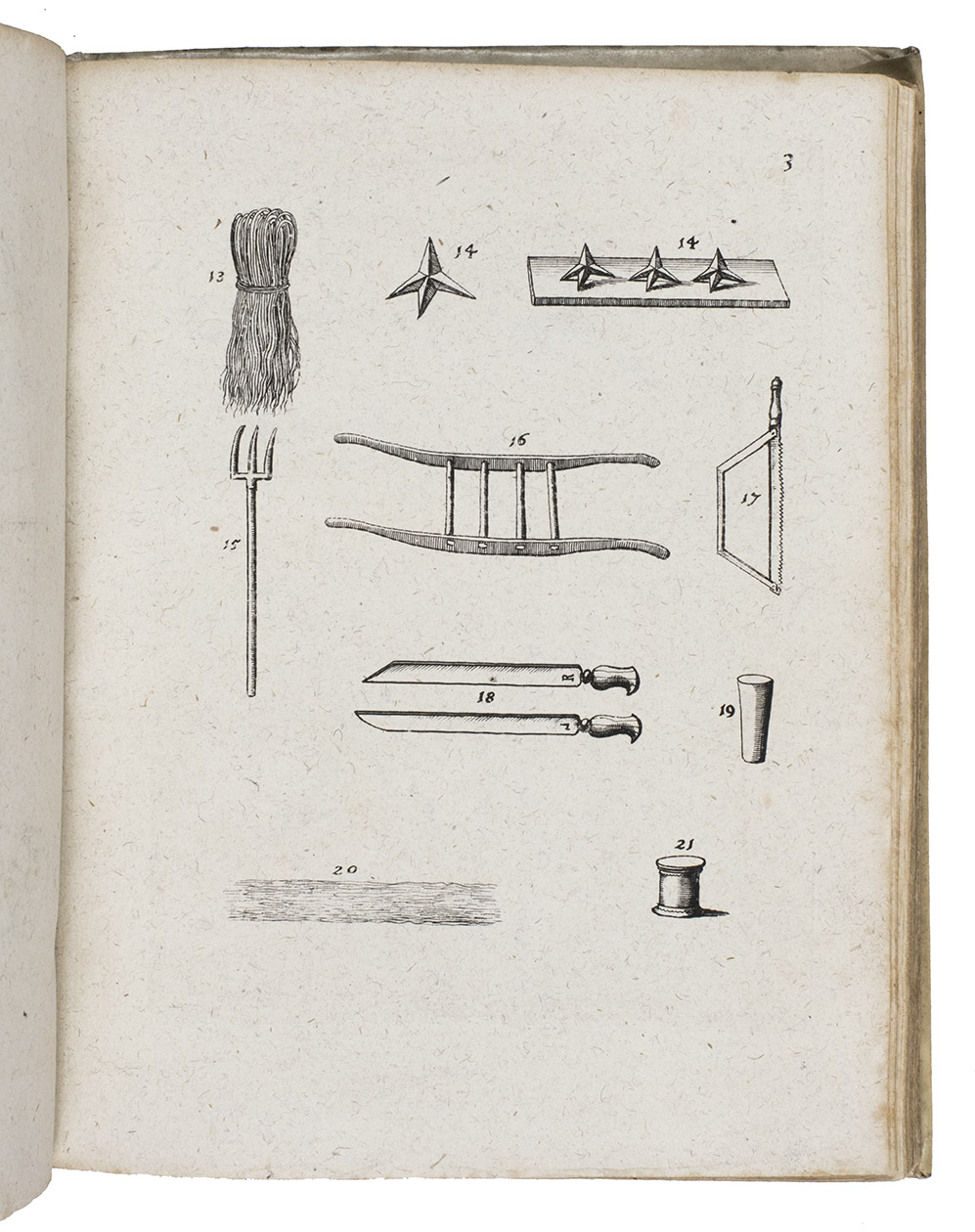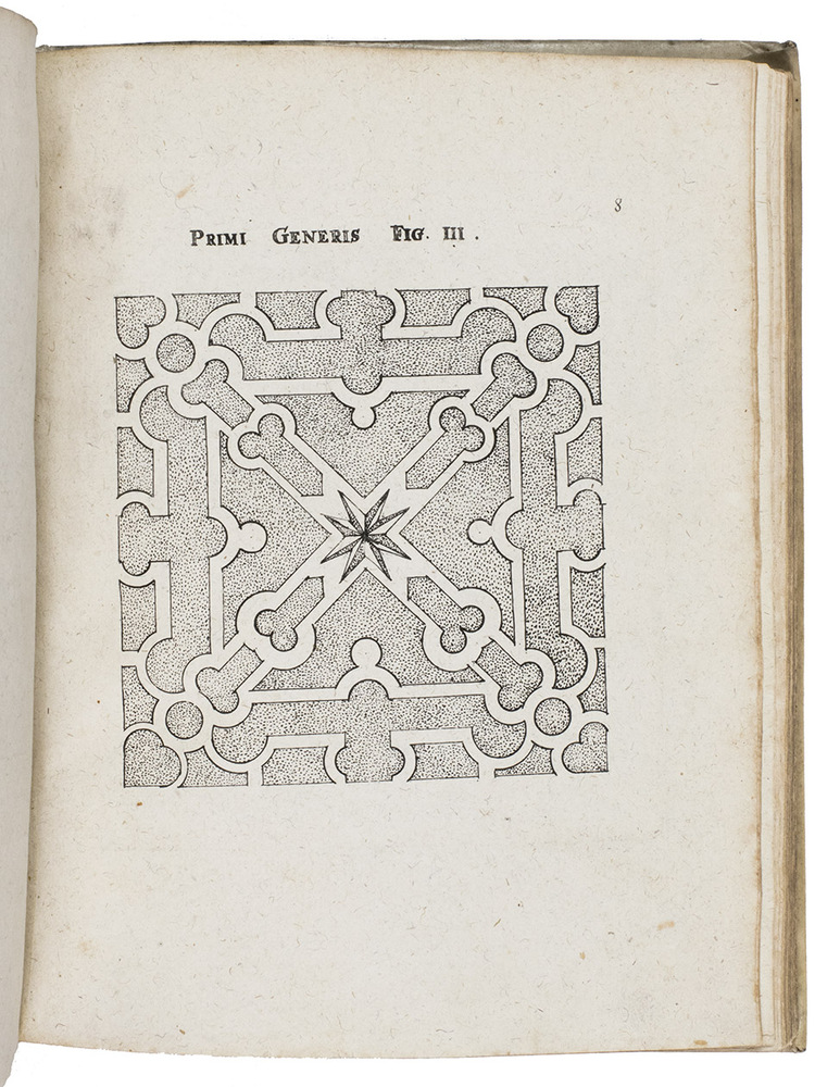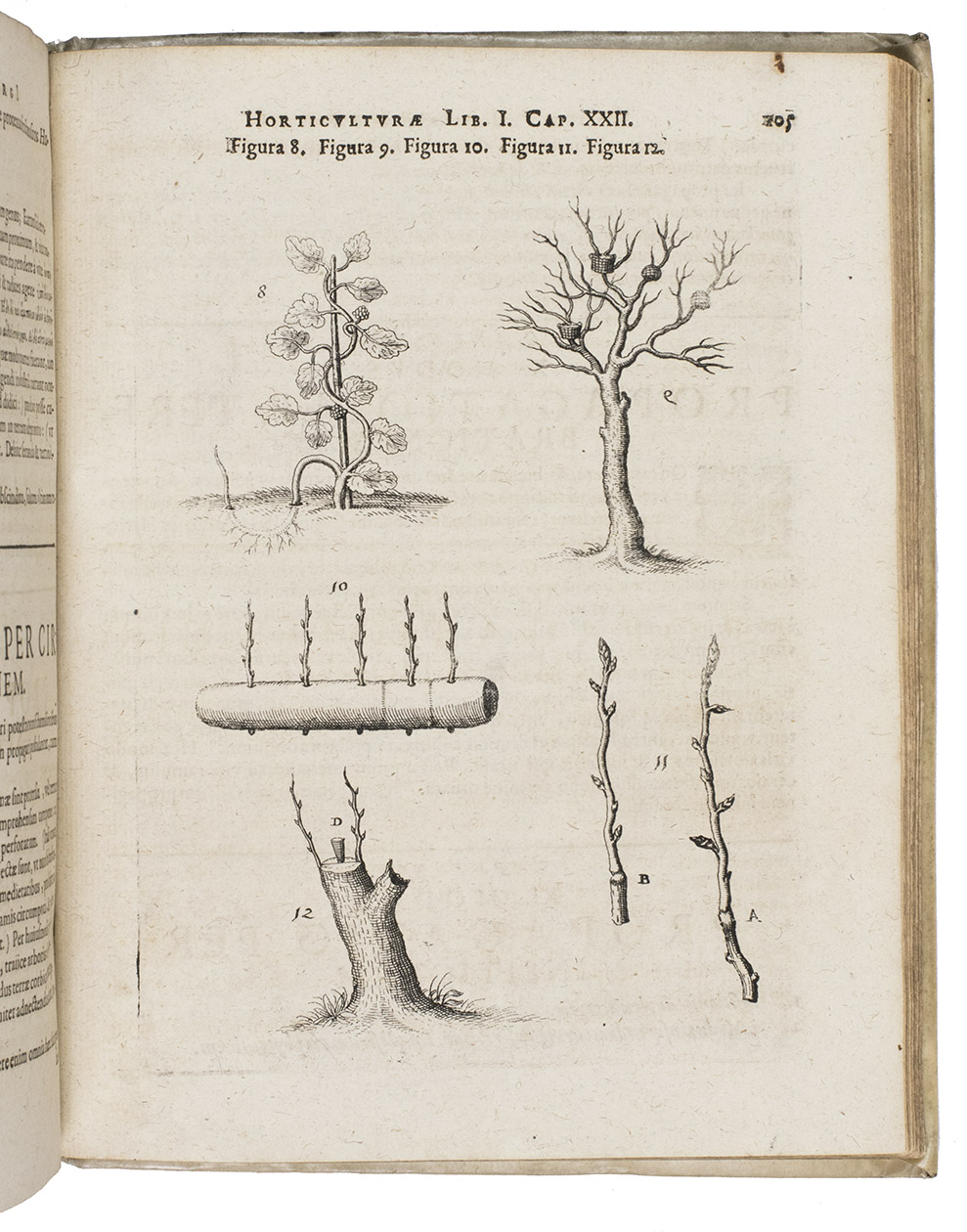 This innovative horticultural treatise, featuring examples of garden design, was directly influenced by Vredeman de Vries. Lauremberg's notable contribution lies in his experimental proof of facts that were not yet accepted by botanists. The first part of the work primarily focuses on plant reproduction, compatibility between plants, propagation through seeds, stolons, and cuttings, as well as pruning, irrigation, and cultural techniques. The second part centers on orchards, flower gardens, herb gardens, and concludes with a list of medicinal plants. Merian's attractive plates illustrate contemporary gardening tools, 13 examples of raised beds (referred to as "pulvillus," similar to geometric plots in botanical gardens), four labyrinths of different shapes, and various garden tablets inscribed with mottoes, a backgammon board, and a sundial. The textual illustrations depict grafting and pruning techniques, along with intriguing topiary scenes. The allegorical title page combines emblematic figures and horticultural instruments within an architectural frame.
