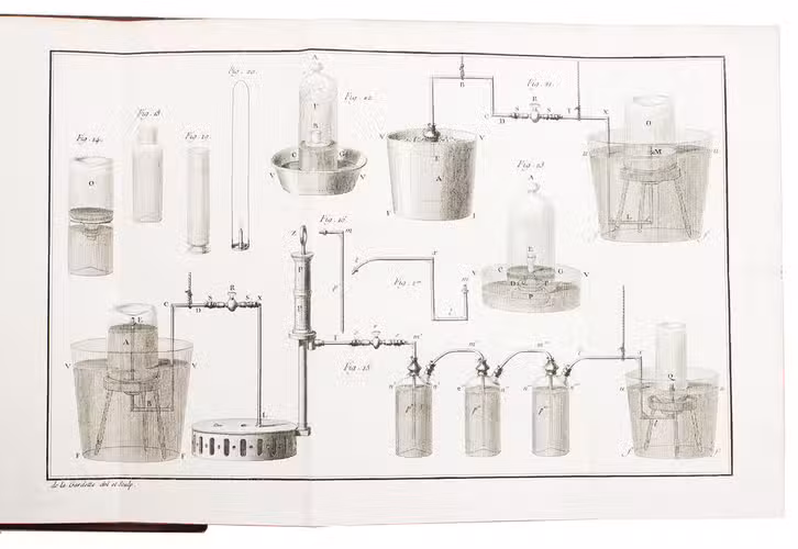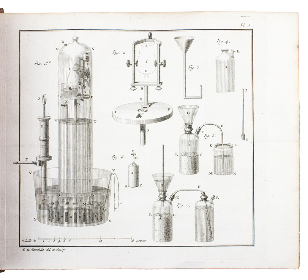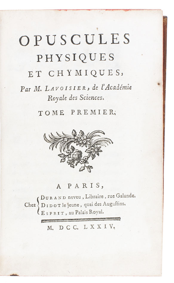Very rare variant-issue of the original edition of the first major, separately published work by the famous French chemist Antoine Laurent Lavoisier (1743-1794), the father of modern chemistry. The first part is titled: "Précis historique sur les émanations élastiques qui se dégagent des corps pendant la combustion, pendant la fermentation & pendant les effervescences"; the second part: "Nouvelles recherches sur l'existence d'un fluide élastique dans quelques substances, & sur les phénomènes qui résultent de son dégagement ou de sa fixation".