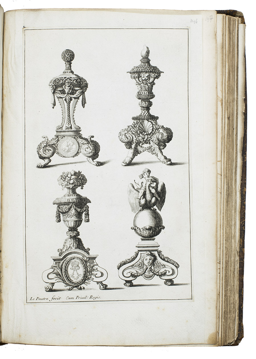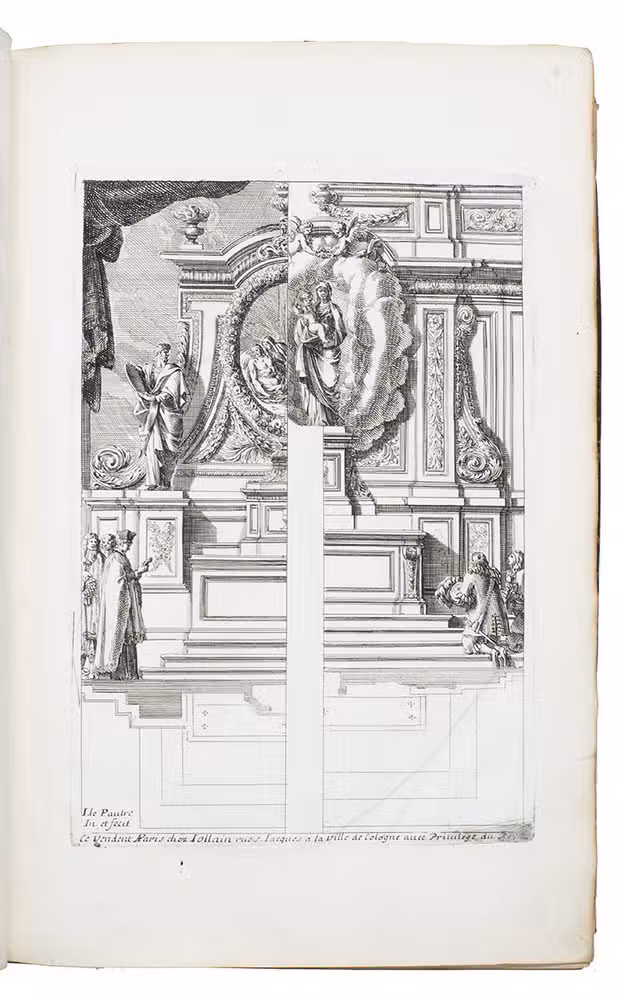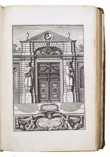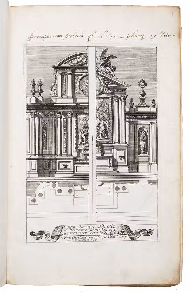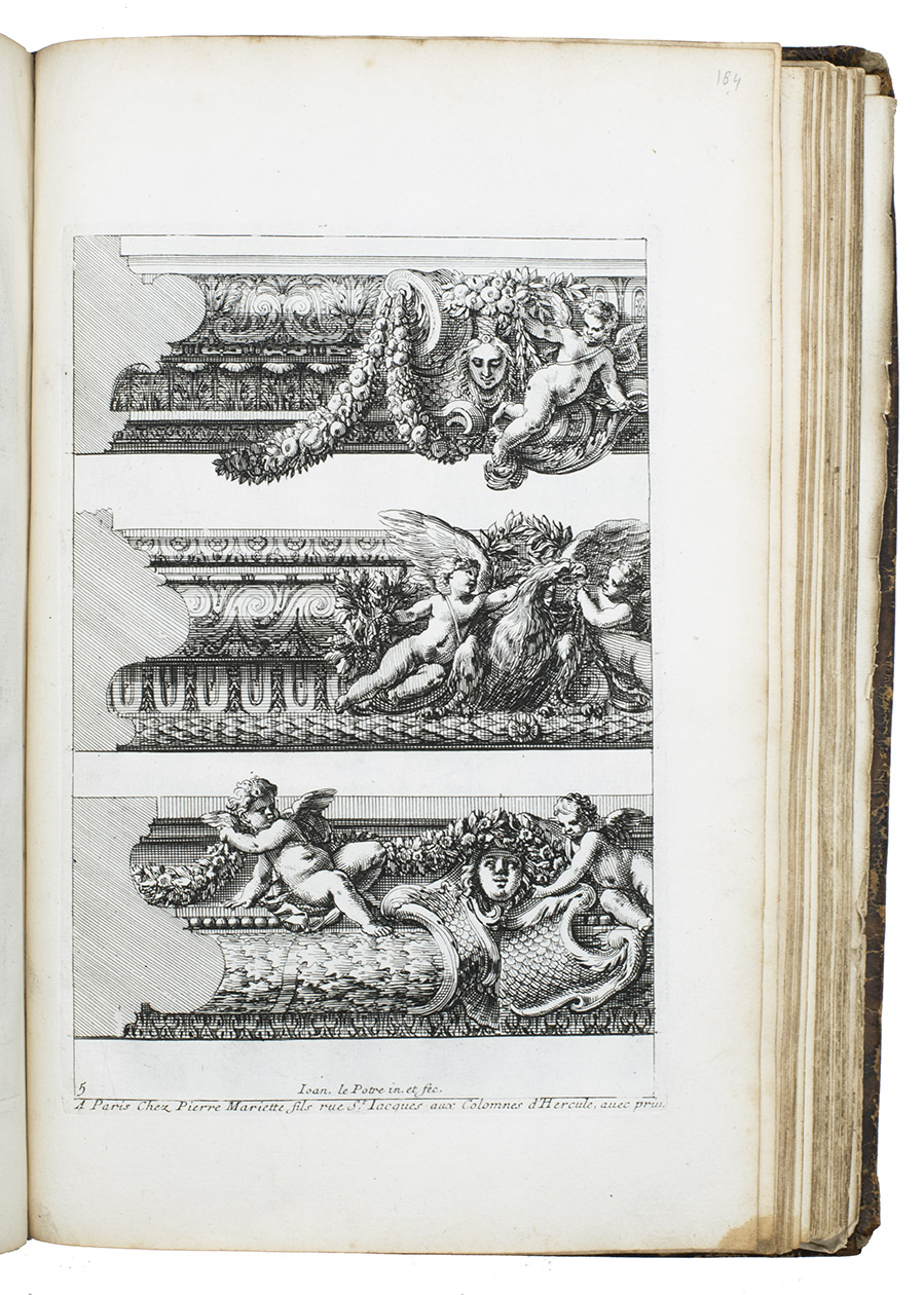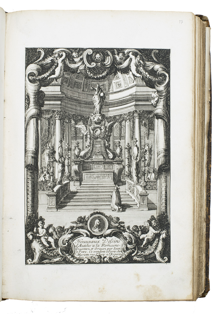 Remarkable collection of 40 print series of ornamental architectural designs nearly all by the most important and imaginative ornament engraver of the 17th century, the famous French architectural designer Jean le Pautre (1618-1682). It includes designs for altars, altar-pieces, church portals, tabernacles, gateways, doors, chimneys, wall decorations, wainscotting, cabinets, ceilings, fountains, frames for paintings, armorial ornaments, grotesques, vessels and vases, etc. His work served as models for architects, sculptors, silversmiths, engravers and others, so that the present collection gives an excellent overview of Paris fashions at the beginning of the reign of Louis XIV, not only in architecture and interior decoration but also in the decorative arts in general.