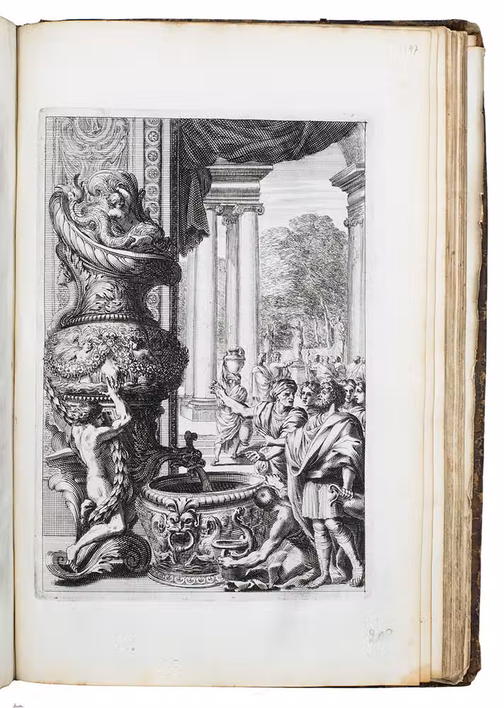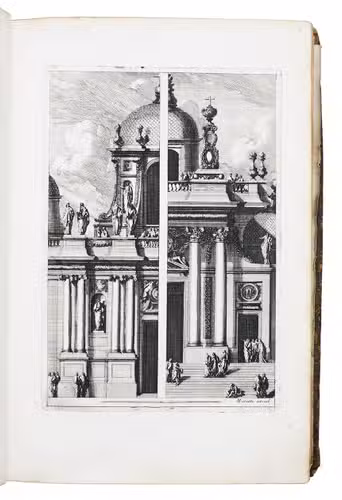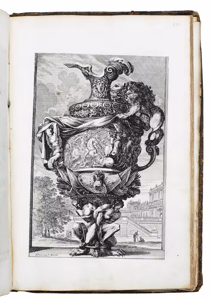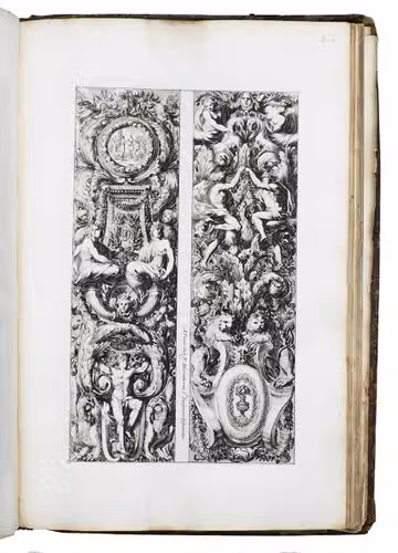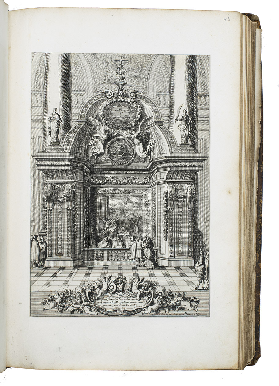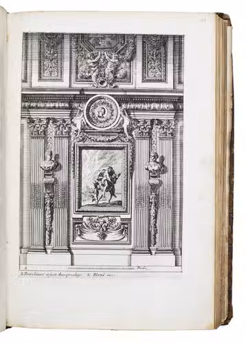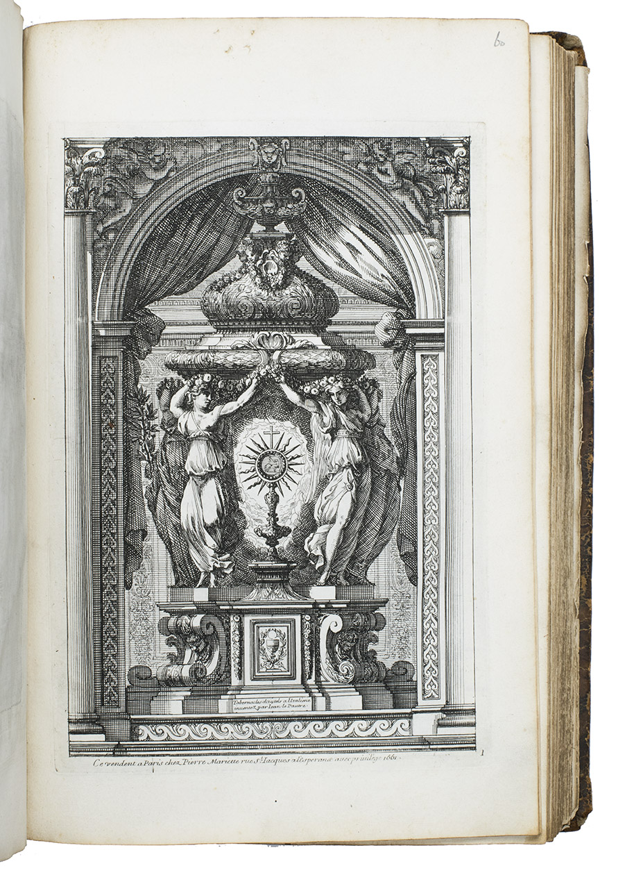 Remarkable collection of 40 print series of ornamental architectural designs nearly all by the most important and imaginative ornament engraver of the 17th century, the famous French architectural designer Jean le Pautre (1618-1682). It includes designs for altars, altar-pieces, church portals, tabernacles, gateways, doors, chimneys, wall decorations, wainscotting, cabinets, ceilings, fountains, frames for paintings, armorial ornaments, grotesques, vessels and vases, etc. His work served as models for architects, sculptors, silversmiths, engravers and others, so that the present collection gives an excellent overview of Paris fashions at the beginning of the reign of Louis XIV, not only in architecture and interior decoration but also in the decorative arts in general.