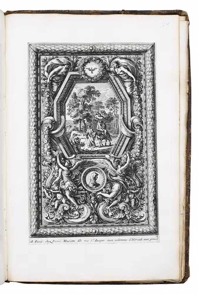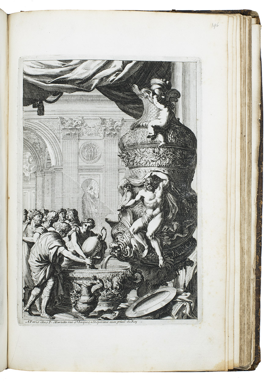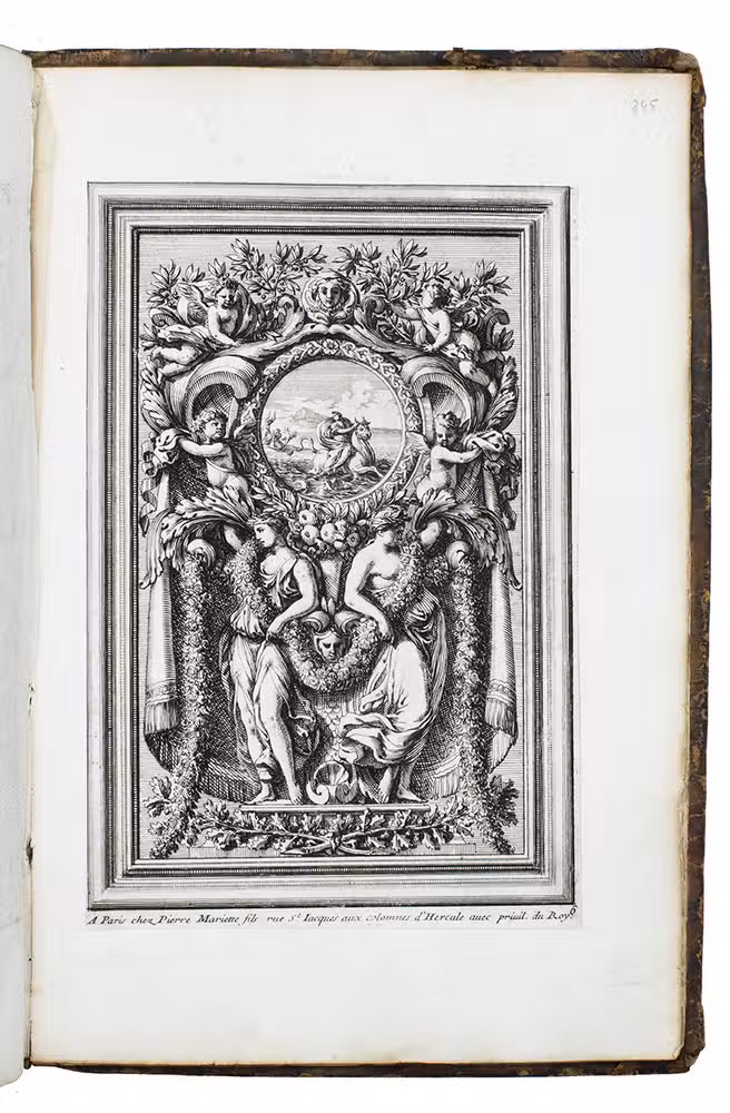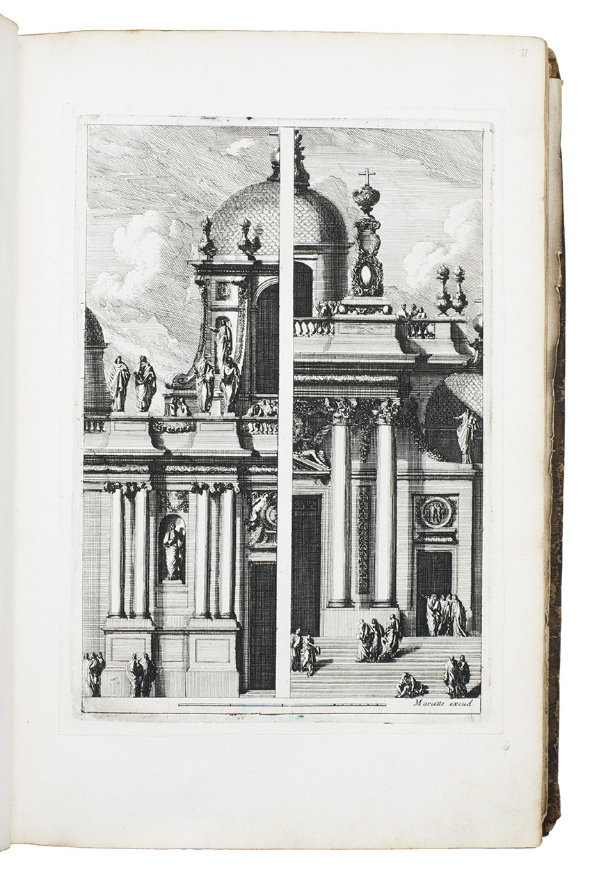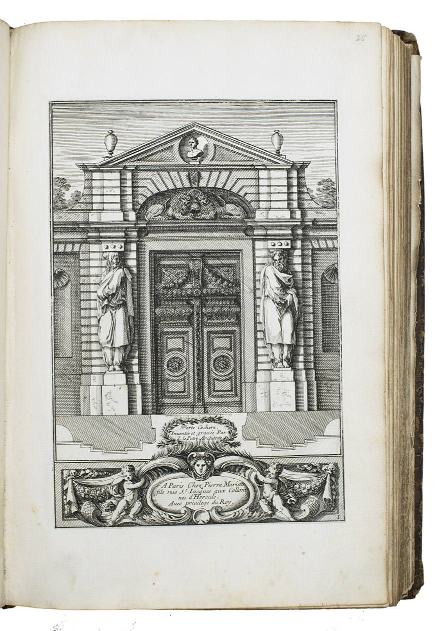 Paris, François Jollain, Pierre Mariette, Jean Le Blond, Nicolas Langlois, 1651-1670. 41 parts in 1 volume. Folio. With 40 engraved print-series nearly all by Jean Le Pautre. Further with 1 duplicate series and 6 individual plates not in these series. With a total of 253 full-page engraved plates: 33 complete series of 6 plates, 1 complete series of 12 plates, and 6 incomplete series (lacking 10 of 42 plates) plus an incomplete duplicate of one of the complete series (5 of 6 plates), and the 6 individual plates. About half the series cut down and mounted on blank leaves or on the back of engraved leaves. 18th-century mottled calf. [248] engr. ll.