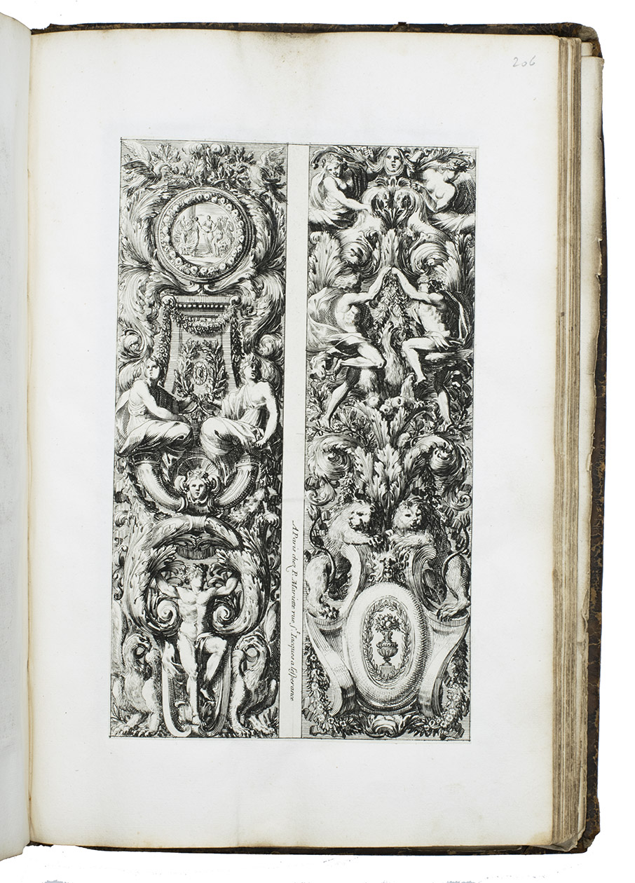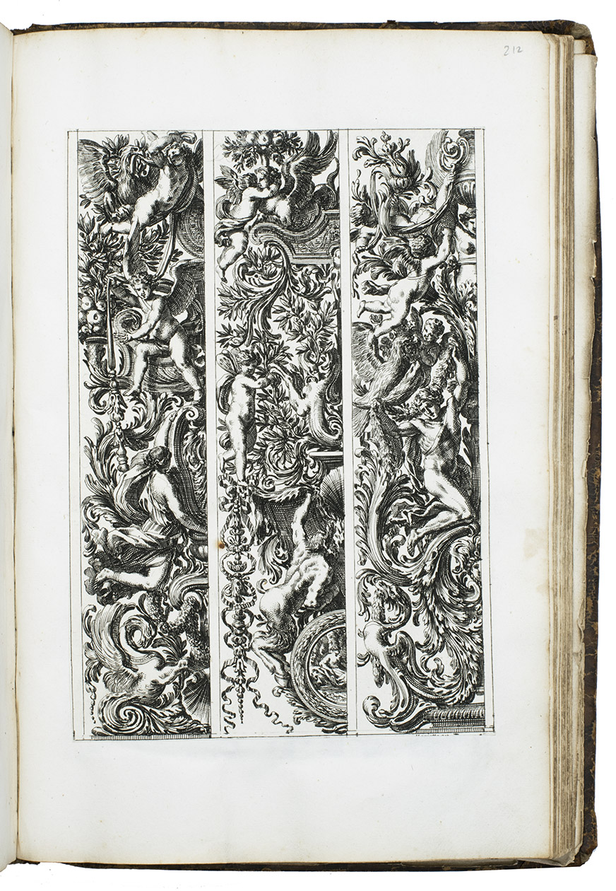With an owner's inscription at the head of the first plate, by the Antwerp author on gardening, mushrooms and food, Franciscus van Sterbeeck, dated 20 February 1670. Binding worn and cracked with the leather flaking and the last quire slightly loose. Interior very good, with only occasional minor stains. A magnificent collection of architectural and other decoration. BAL 1833-1863 passim; Berlin Kat. 313-314 passim; Fuhring, Ornament prints in the Rijksmuseum, passim; cf. Guilmard, Maitres Ornemanistes, pp. 70-75 passim (later printings).