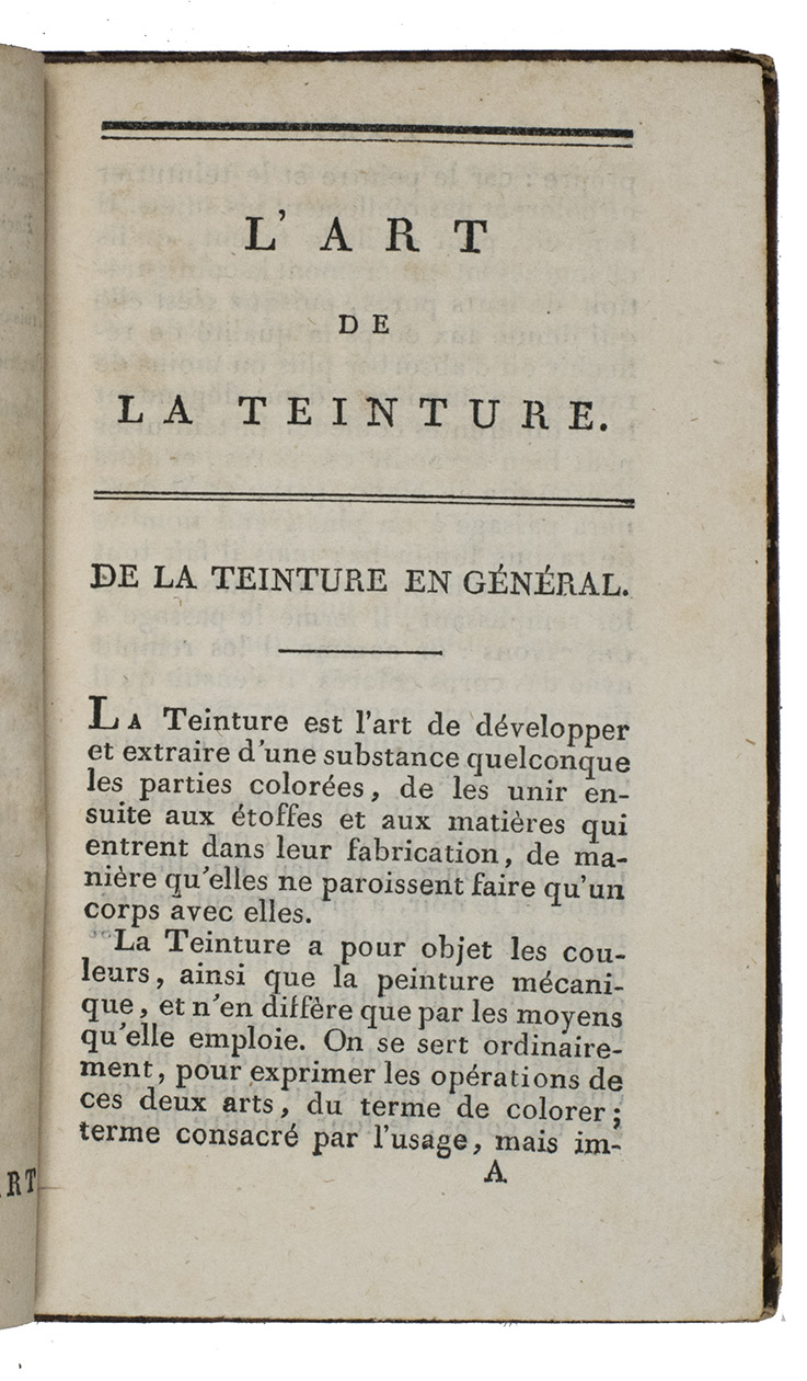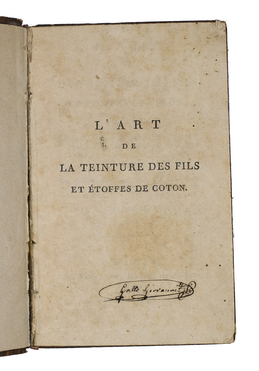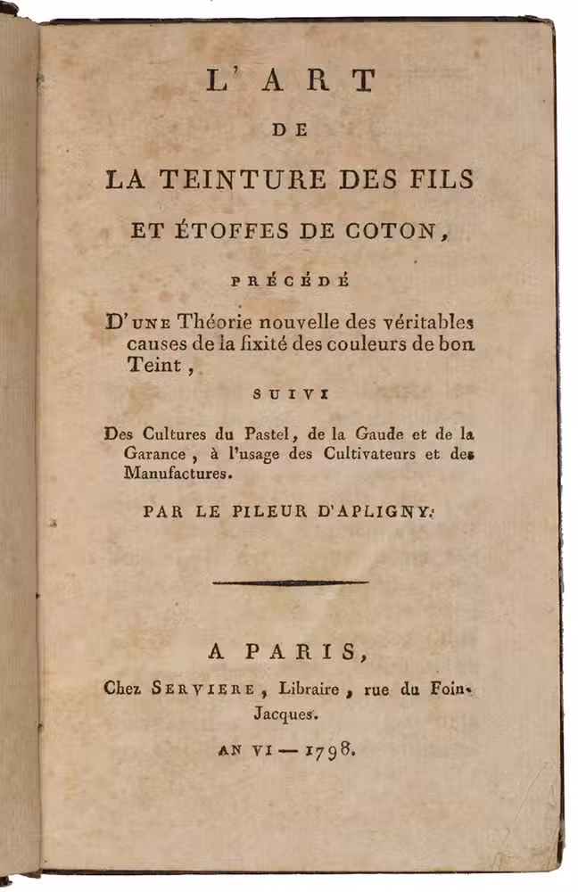 L'Art de la Teinture des Fils et Etoffes de coton, précédé D'une Théorie nouvelles des veritables causes de la fixité des couleurs de bon Teint, suivi Des Cultures du Pastel, de la Gaude et de la Garance, à l'usage des Cultivateurs et des Manufactures.