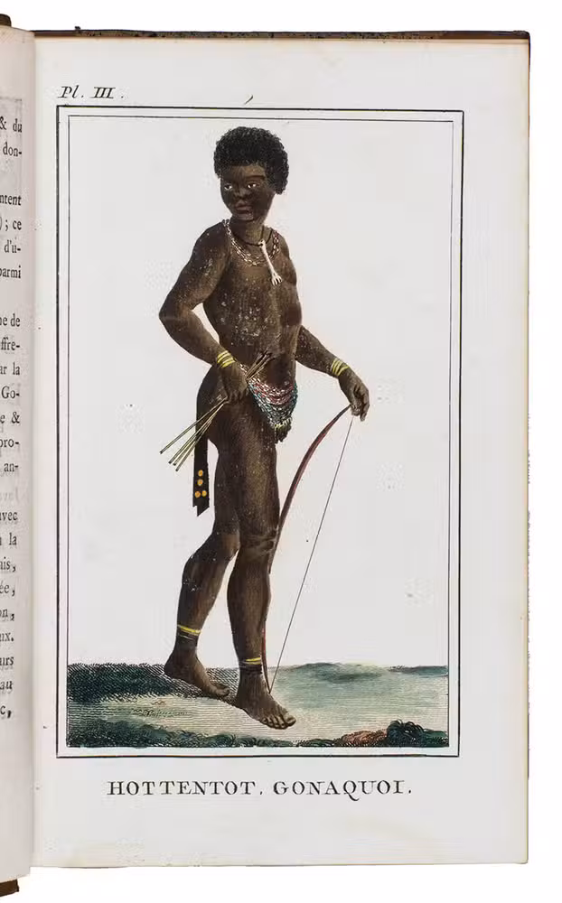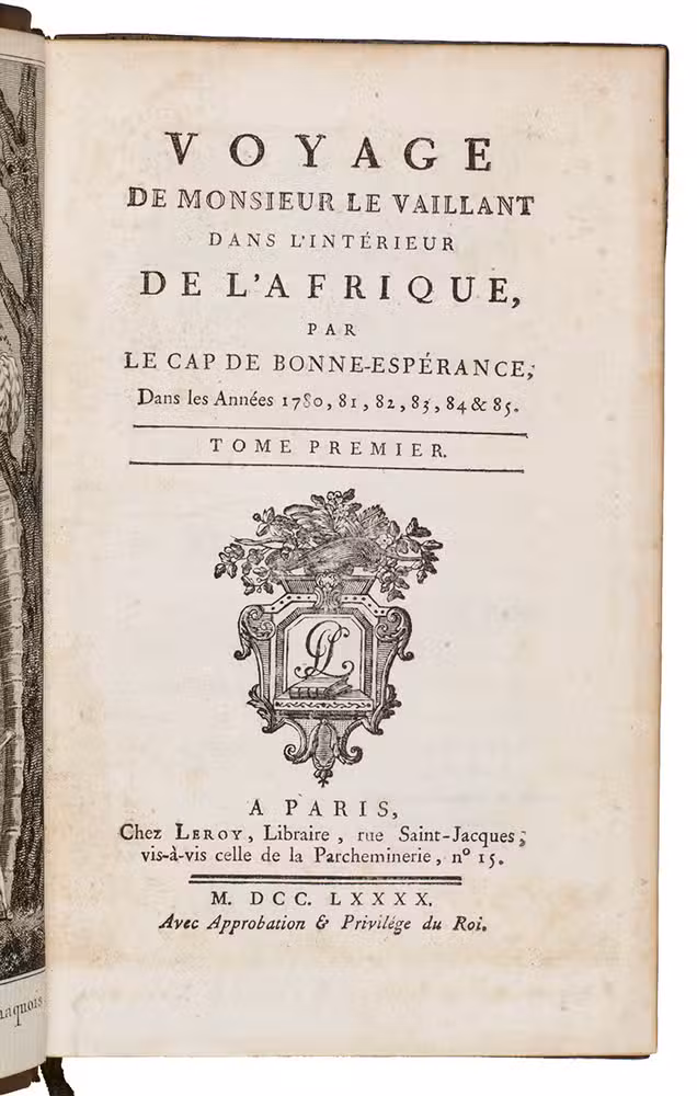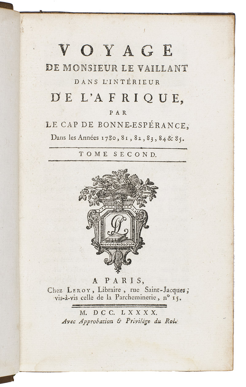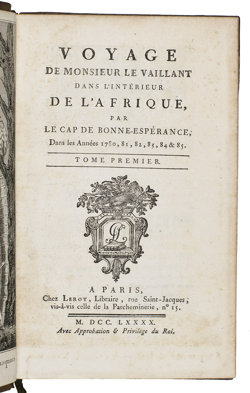 First edition (in octavo: a quarto edition appeared simultaneously) of Le Vaillant's account of his first expedition into the interior of South Africa. Le Vaillant (1753-1824) embarked on a first excursion on 18 December 1781, advancing as far as the Great Fish River. After returning to Cape Town, he undertook a second excursion during which he travelled beyond the Orange River. His engaging narrative of the expedition contains valuable ornithological information and interesting notes on the peoples he encountered, including the Khoikhoi ("Hottentots") and the Xhosas. Plate VII, a portrait of a naked "Hottentote" woman that was later suppressed, is present here and the censors have not tampered with it. The octavo edition is typographically superior to the quarto edition.