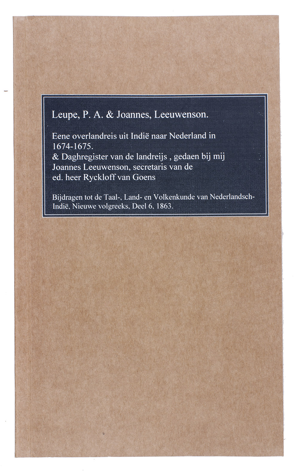 First publication of the manuscript journal of Joannes Leeuwenson's 1674/75 overland journey from Colombo (Ceylon/Sri Lanka), along the west coast of India to Banda Abbas (Iran, at the Strait of Hormuz), Basra (Iraq), Aleppo (Syria), and Iskenderun (Turkey), then on to Livorno (Italy), and through Italy and Germany to Amsterdam. The manuscript itself is titled "Daghregister van de Landreijs, gedaeen bij mij Joannes Leeuwenson, ..." Although described as an journey over land, parts naturally had to be made by sea as well, and Leeuwenson names numerous ships in the various Dutch fleets, as well as the enemy ships they encountered. He quotes in full (4 pp.) the letter with orders given to him by VOC director François de Haese at Banda Abbas as well as several other letters he received or wrote. He gives a detailed description of the terrain and the difficulties in finding and acquiring supplies, beasts of burden, etc., and relates his encounters with Persians, Ottomans and other Islamic peoples.