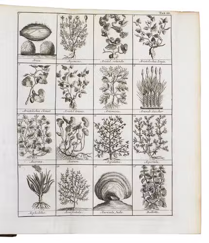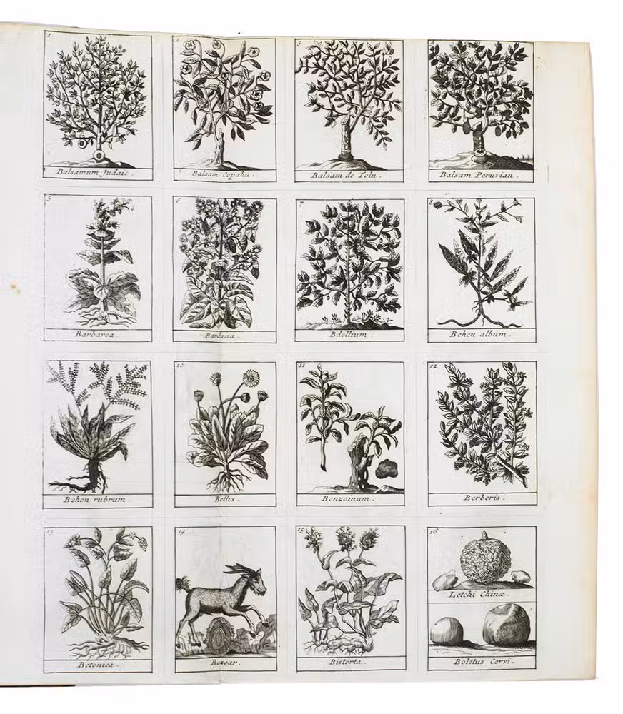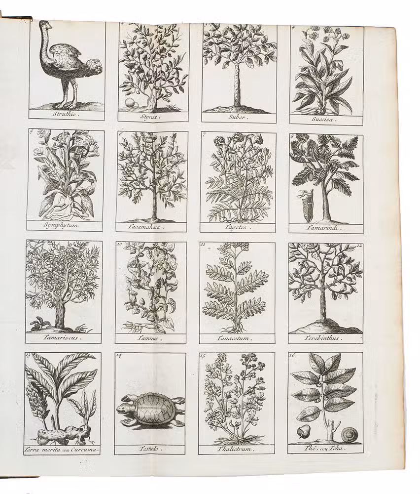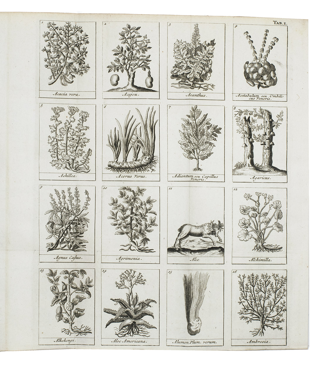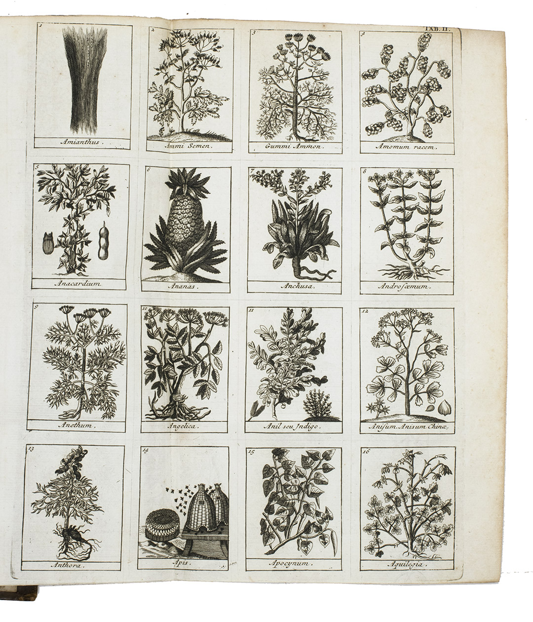 Amsterdam, for the "Compagnie", 1716. Large 4to. With an engraved title-vignette ("Vis unita major") and 25 folding engraved plates each with 16 figures of various plants, animals and metals, in alphabetical order. Contemporary speckled calf, title in gold on spine, blind tooled binding edges. [20], 590, [58] pp.