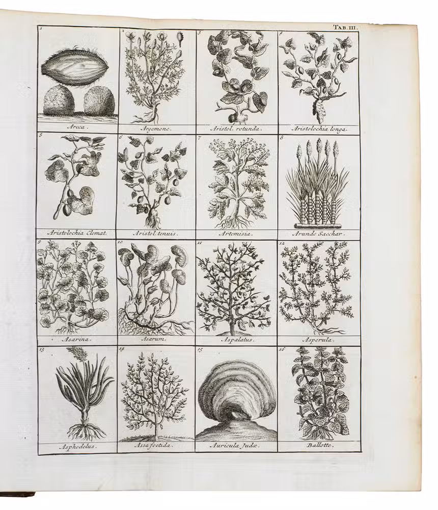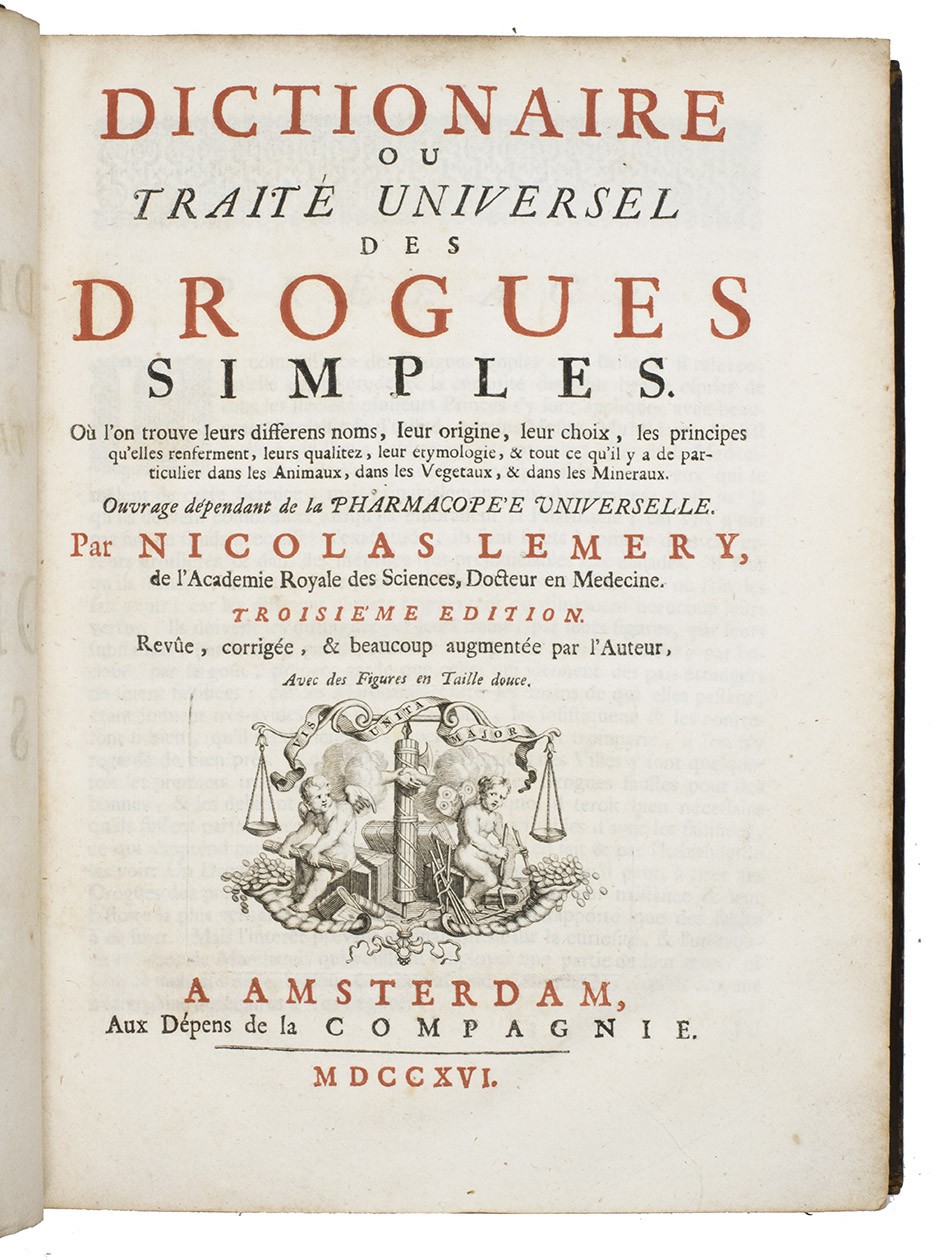 "Third edition" of this important extensive and comprehensive dictionary of active substances in alphabetical order that can possibly be used as medicine: composites and simples respectively giving the sources, virtues, doses, and therapeutic action of the various medicaments. It is considered, together with Lémerys Pharmacopée universelle - one of the most authoritative pharmacopoeia of 18th-century Europe - as one of the two complementary works which form Lémerys chief contributions to pharmacy. This "third edition" is probably the first of the three pirated editions published in the Netherlands: the notation for the publisher (aux dépens de la Compagnie) suggests this. The second followed a year later, also in Amsterdam; the third appeared in Rotterdam in 1727 with the publisher Jean Hofhout. T