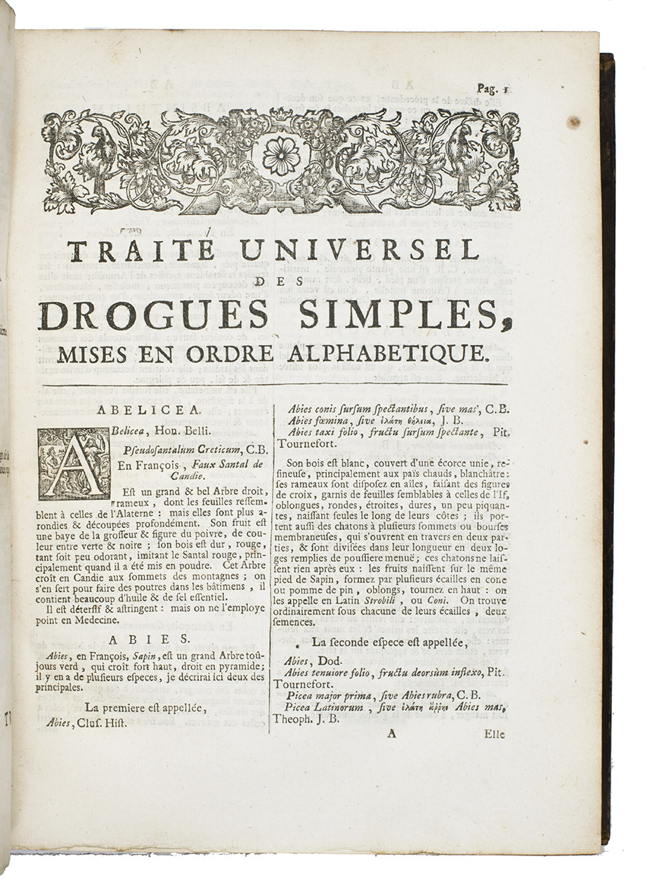 Dictionaire ou traité universel des drogues simples. Où lon trouve leurs differens noms, leur origine ... & tout ce quil y a de particulier dans les animaux, dans les vegetaux, & dans les mineraux. Ouvrage dépendant de la pharmacopée universelle. Troisième édition. Revue, corrigé, & beaucoup augmentée par lauteur.