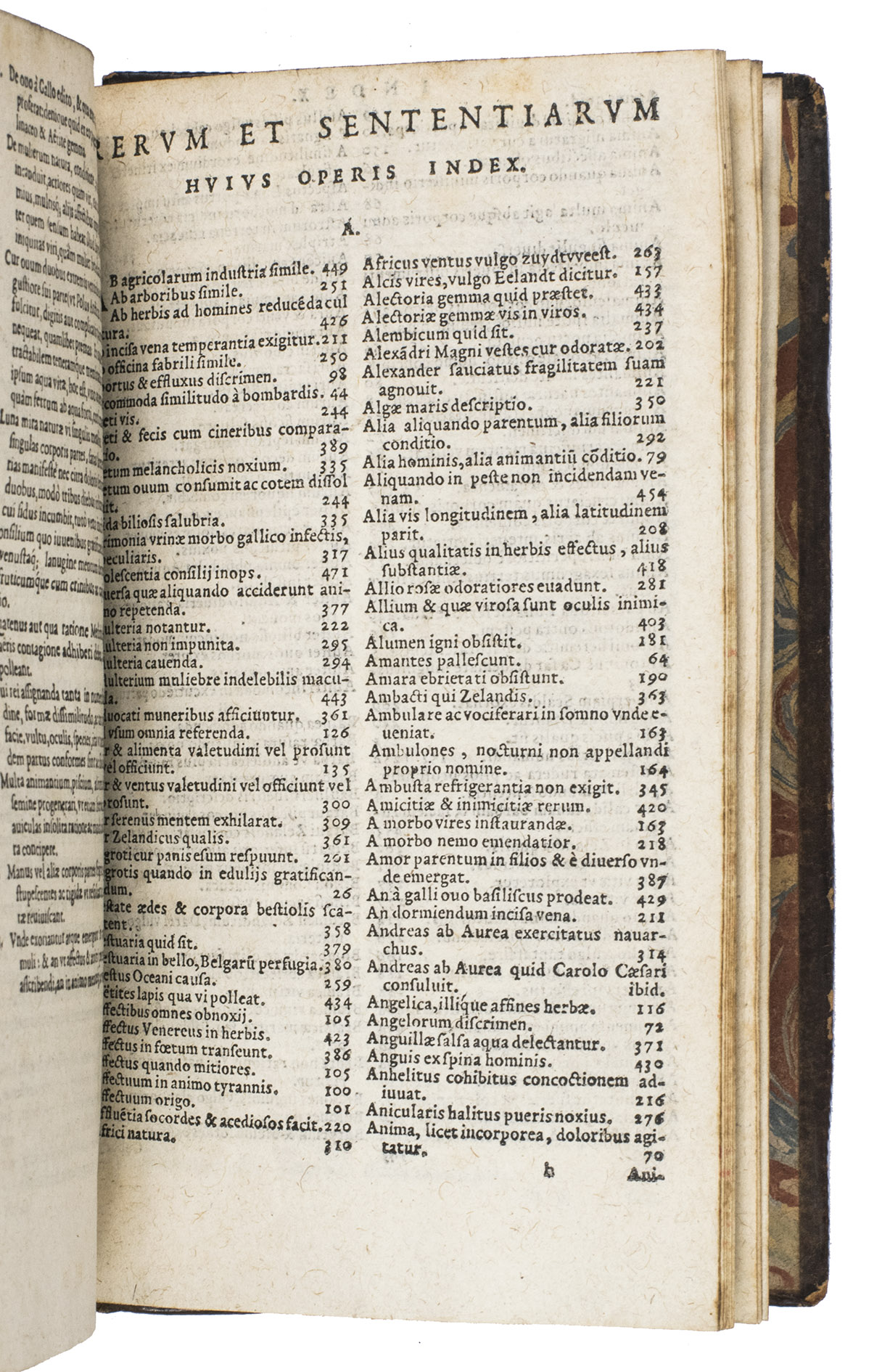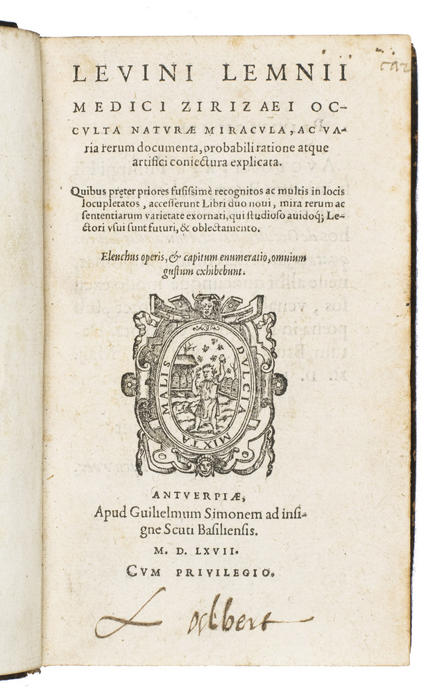 Enlarged, first Plantin edition of a very popular work of the secrets of nature, considering physiological, physical, medical, religious and moral topics. Guided by the Hippocratic Corpus, Aristotle, natural philosophy, Christianity, and the four humors, the author wrote a complicated treatise that covers reproduction, hygiene, demonology, diet, the use of alcohol, the influence of the stars, natural history, pregnancy, and much more. It was republished numerous times, and versions of it were read well into the 20th century. The work "was often cited by subsequent learned authors, and the numerous editions and translations of it show that is was well suited to the taste of the time" (Thorndike).