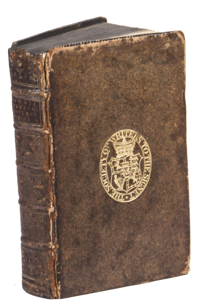Antwerp, Guillaume Simon (colophon: printed by Christoffel Plantin), 1567. 8vo. With a woodcut printer's device on the title page, an oval woodcut portrait of the author, and 6 decorated woodcut initials. 17th-century gold- and blind-tooled brown calf, with a red morocco title label on the spine, the supralibros of The Society of Writers to the Signet as a central ornament on both boards. [16], 473, [22], [1 blank] pp.