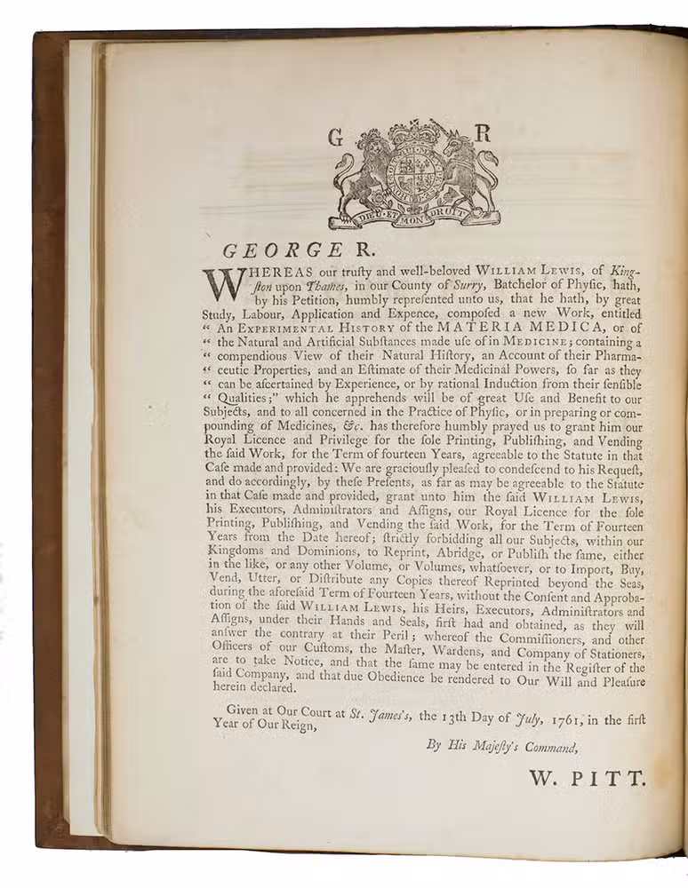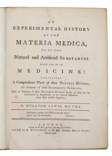 First edition of Lewis well-known work on medicaments and all kinds of materials and components used for their fabrication. William Lewis (1708-1771) is a British chemist, apothecary and physician who studied at Christ Church at Oxford before he settled in London, and next in Kingston upon Thames as physician. Apart from his A course of practical chemistry (London, 1746; in 8 vols.) and The new dispensatory (Londen, 1753; translated into Dutch as De nieuwe Britsche apotheek), he is particularly known for his An experimental history of the materia medica, of which a second edition appeared in 1768, and a third, edited by J. Aiken in 1784.