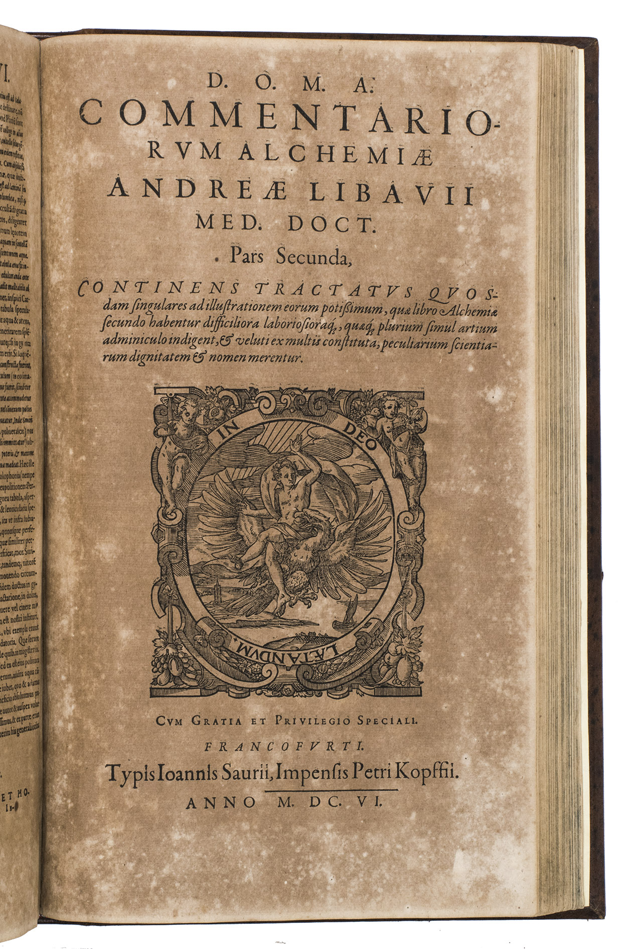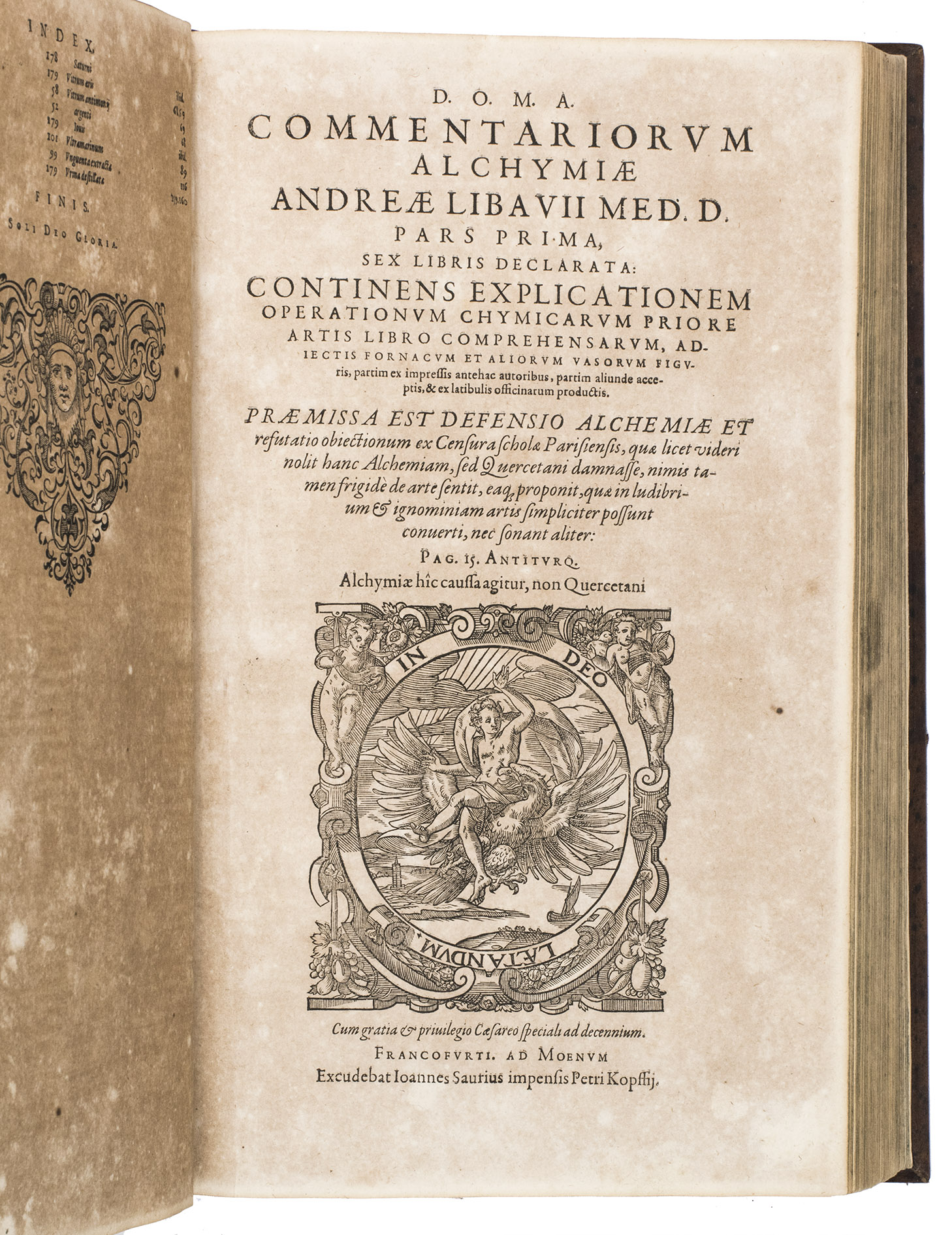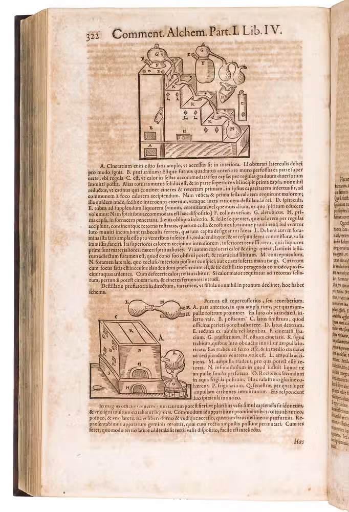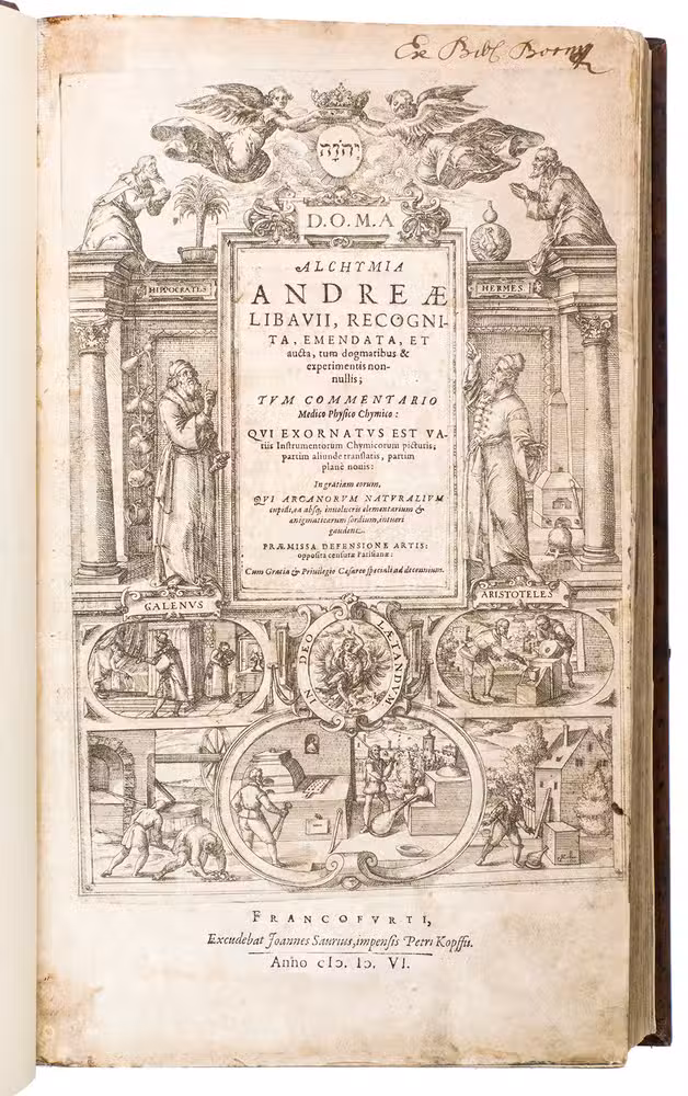 Second enlarged edition of the first systematic chemistry textbook, richly illustrated with nearly 200 woodcut illustrations. It was written by Andreas Libavius (ca. 1555-1616), one of the founders of chemical analysis, and is his chief work. As the first edition was not illustrated, the second edition specifically is considered "the greatest and most beautiful of all books on chemistry in the seventeenth century" (DSB). Copies of it rarely appear on the market.