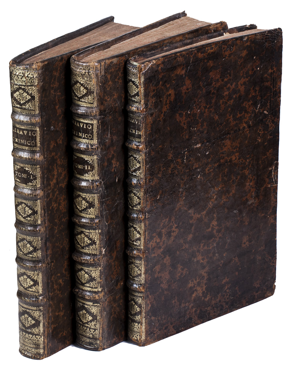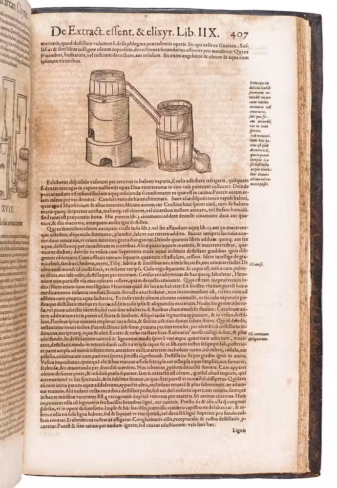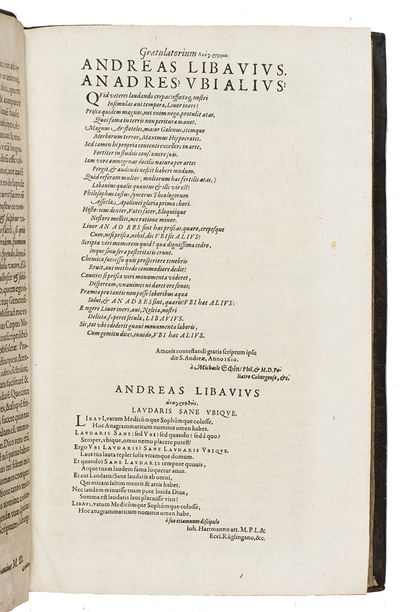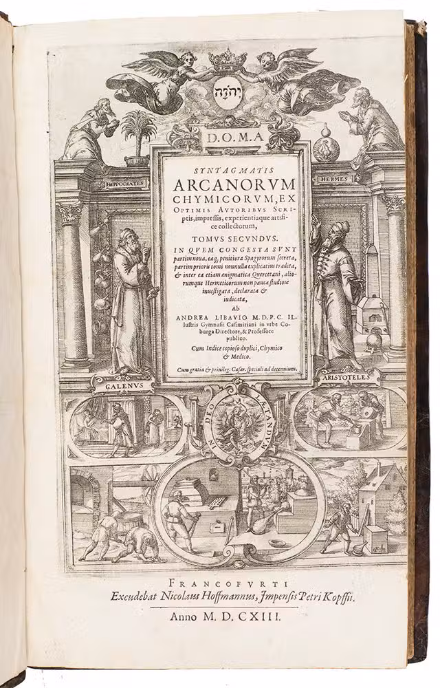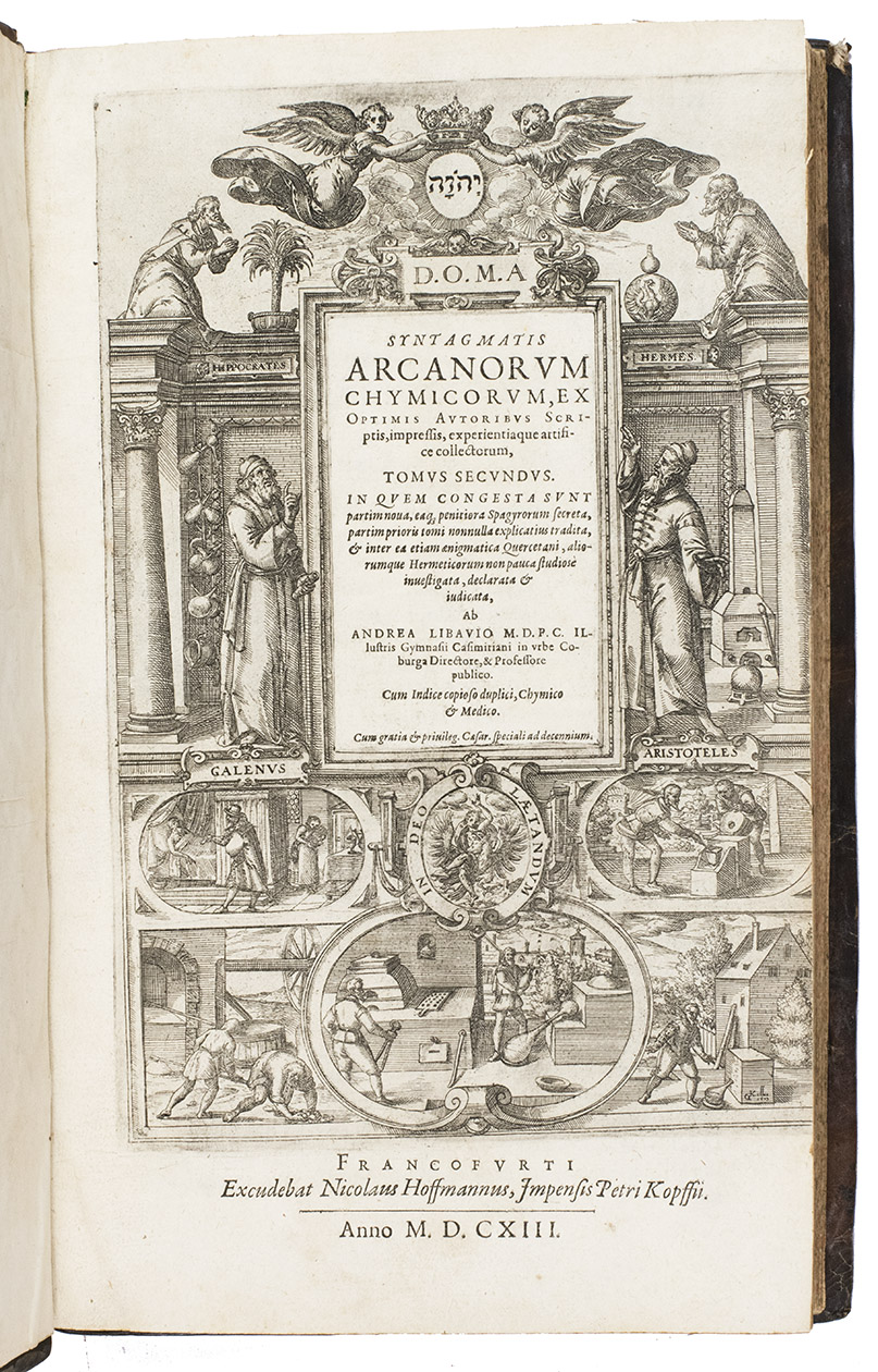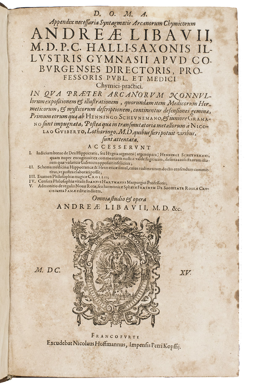 First edition of a, mostly polemical, follow-up to the "unusually clear and highly systematic" (DSB) standard work on alchemy and early chemistry, Alchymia (1597), by the well-known German chemist Andreas Libavius (1540-1616). The present work, known as the Syntagmatis, consists of three separately published volumes (volume 1 and 2 second issue), each with a different title. In the first two volumes Libavius elaborates on his experiments in chemistry (illustrated with many woodcut illustrations of various sorts of glassware, vessels and other devices), followed by comments on the writings of Palmarius, Croll, Quercetanus (Duchesne) and many others. In the third volume, the appendix, he mentions controversies with Paracelsus, the Rosecrucians, Henning Scheunemann and Nicolas Guibert.